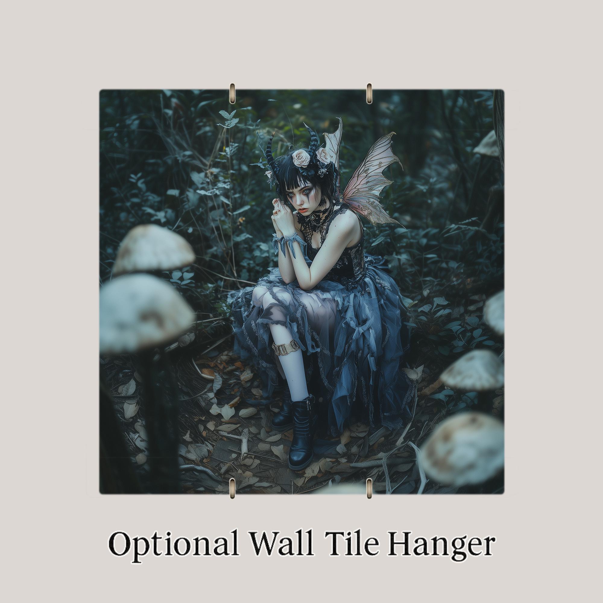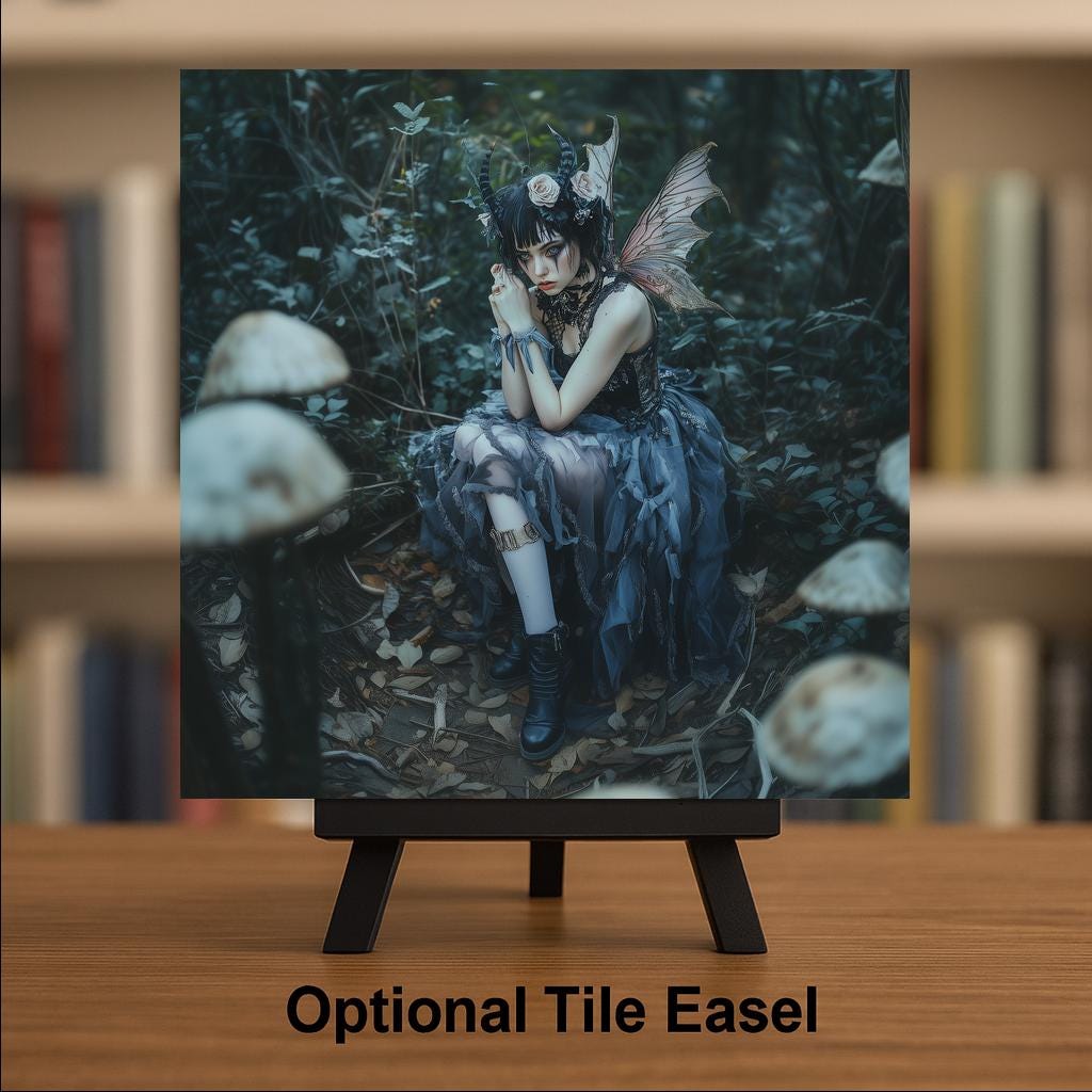 Transform your space with this moody, gothic fairycore ceramic tile featuring an ethereal forest sprite. Seated in a circle of mushrooms beneath a canopy of overgrown leaves, the winged figure wears a rose crown and horned headdress, her expression a mix of magic and mystery. The muted tones and twilight lighting give the piece a cinematic, fairy tale quality—perfect for those who love enchanted forest themes with a touch of the occult. This piece adds powerful visual energy to any witchy aesthetic or dark fantasy decor.