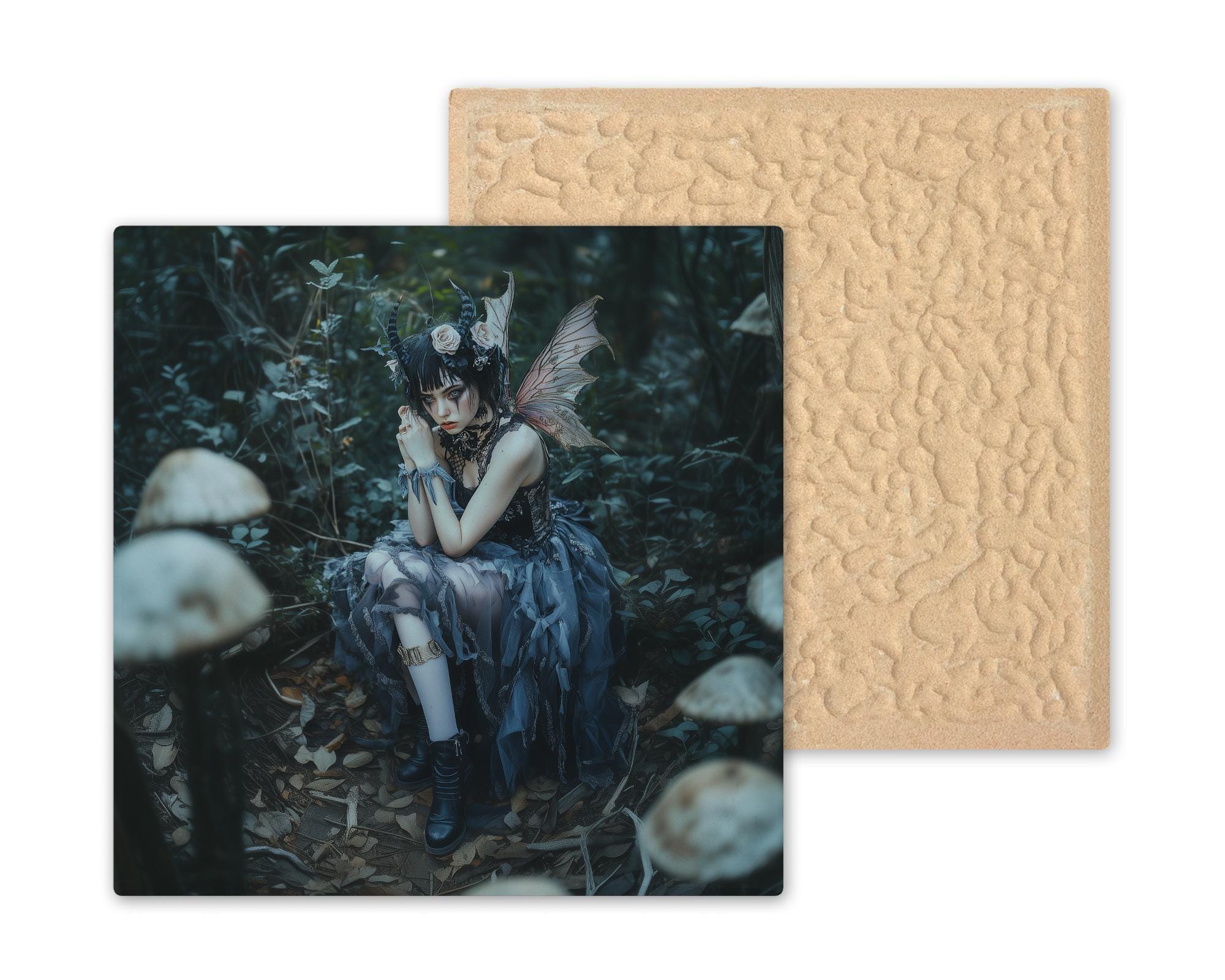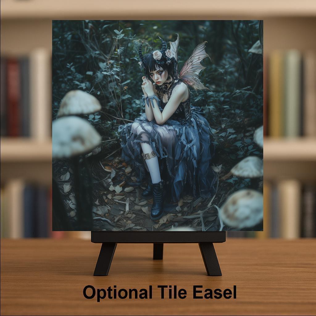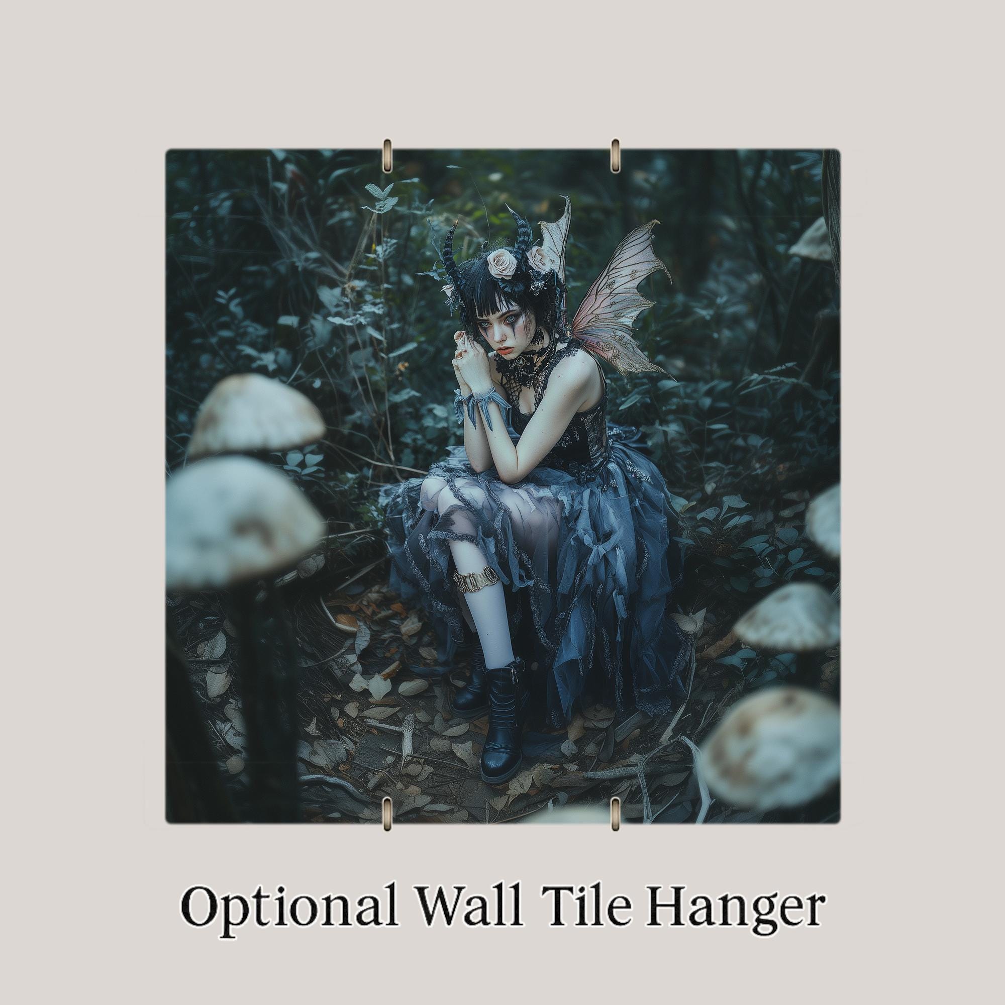 Step into a world of shadowy beauty with this Dark Enchanted Forest Ceramic Tile Wall Art. The artwork captures a gothic fairy resting in a dim, overgrown forest filled with mushrooms, tangled foliage, and soft light filtering through the darkness. Her wings have a fragile, ethereal texture, while her horned floral crown and distressed dress add to the mystical atmosphere. Every detail—from the muted color palette to the fallen leaves beneath her feet—creates a scene full of mood, depth, and storytelling.
