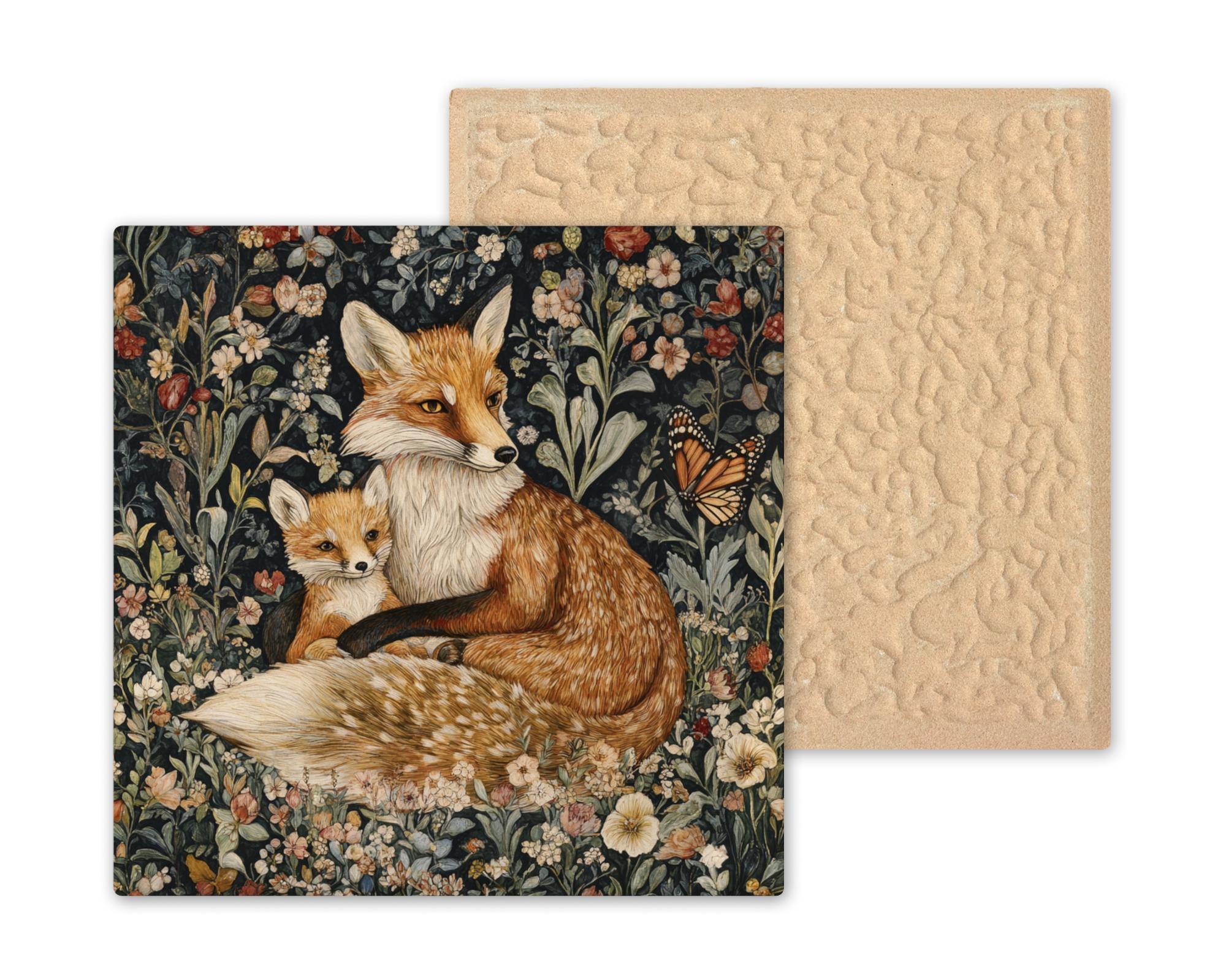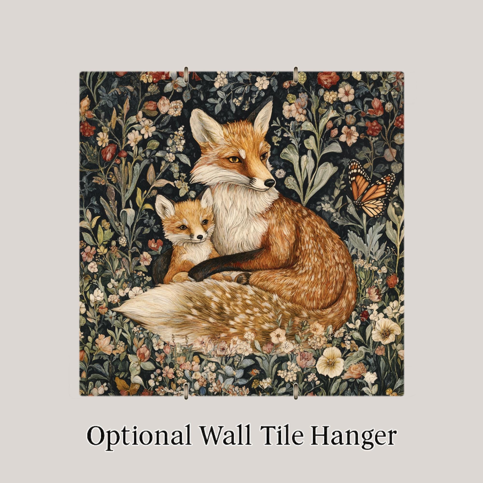 Add a touch of elegance to your space with this Art Nouveau William Morris inspired ceramic tile featuring Woodland Fox Lovers. This Vintage Art Style wall decor depicts a Fox and Baby Pup kit cub with Butterfly Trivet design. Perfect for fox enthusiasts and nature lovers alike!