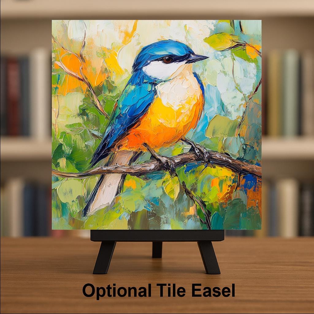 Let your space sing with this stunning ceramic art tile featuring a vibrant songbird in rich blue and golden tones. Inspired by nature and brought to life in an expressive painterly style, this tile captures the essence of spring with bold brushstrokes and glowing light. The bird rests calmly among leafy branches, creating a scene that feels both peaceful and full of life. It’s a joyful piece that brings nature indoors.