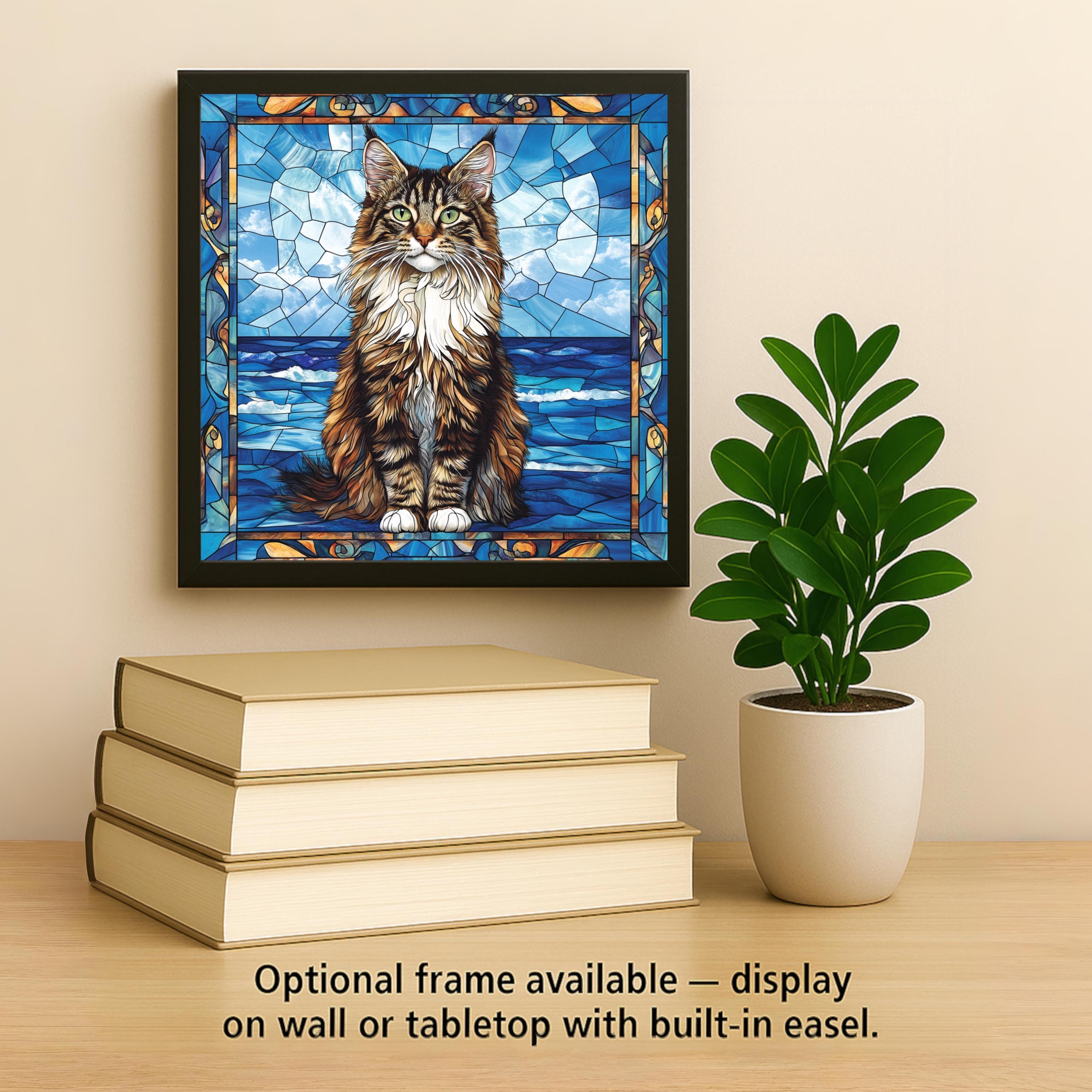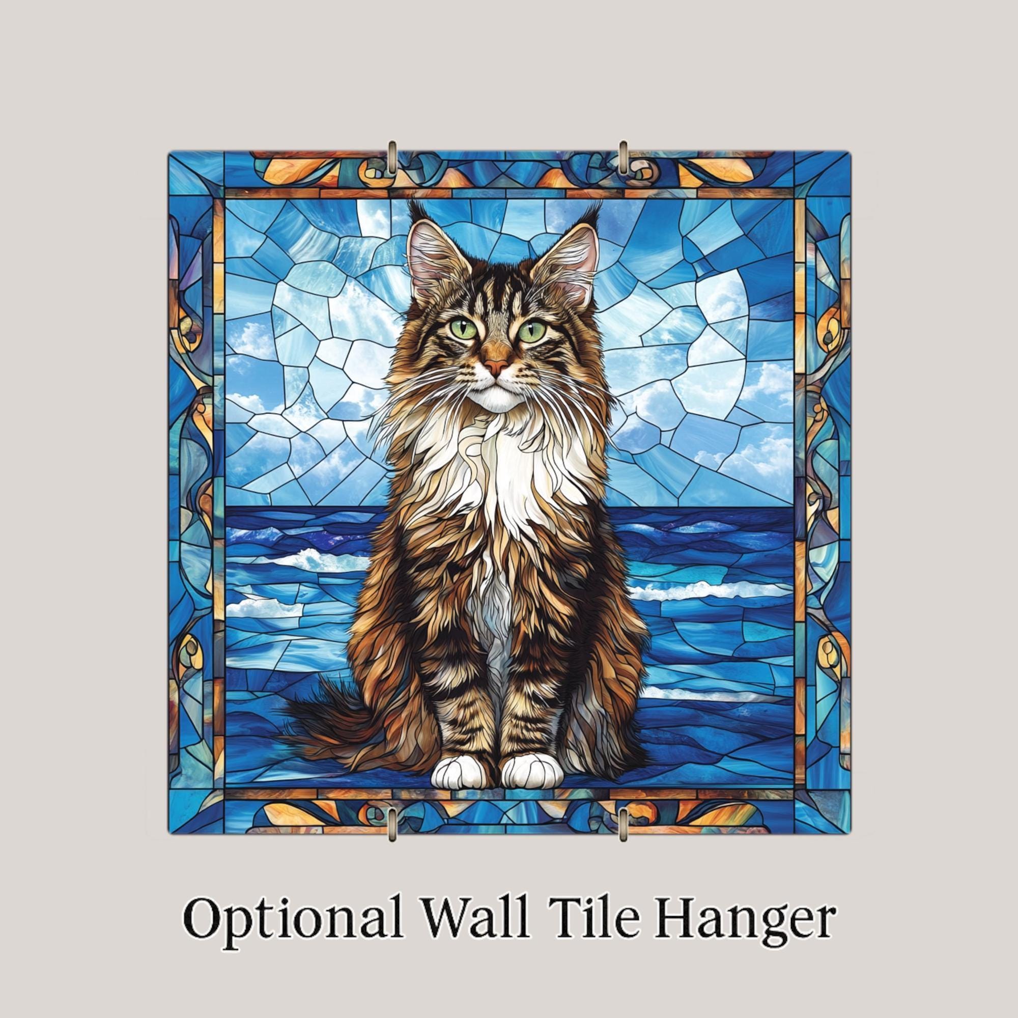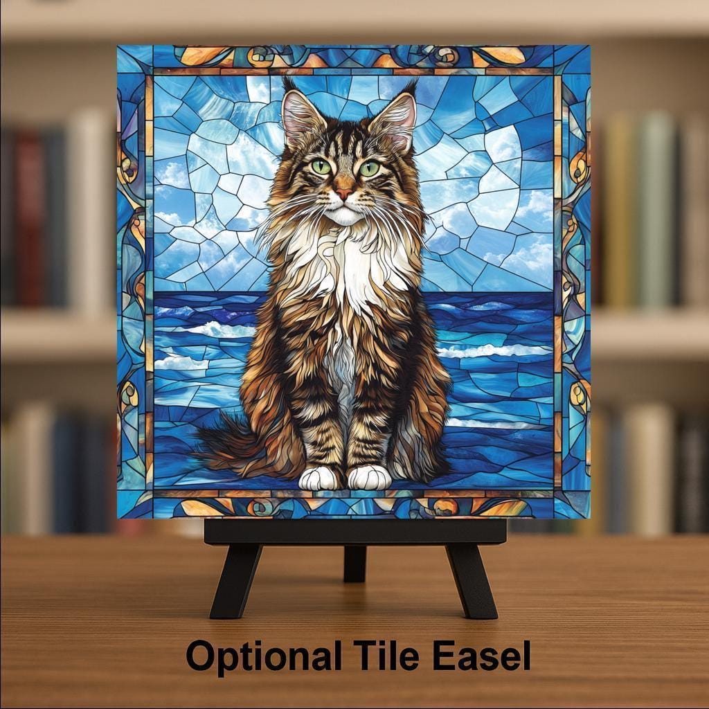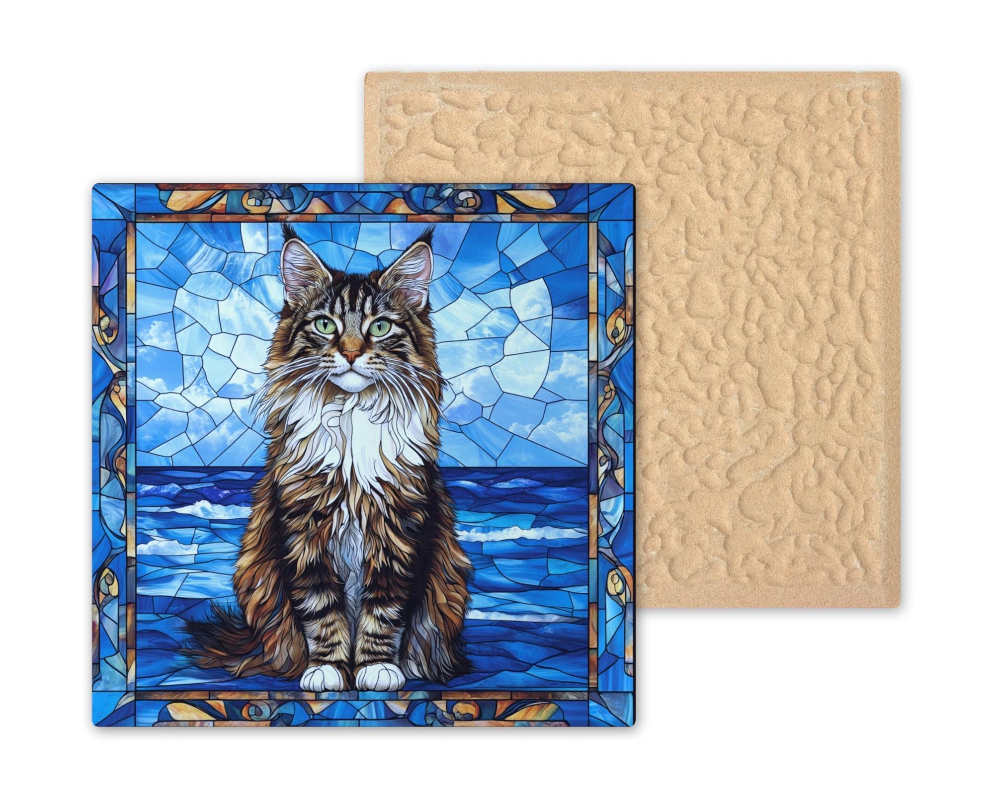 This Maine Coon stained glass-style ceramic tile brings your favorite feline into the spotlight with a coastal twist. Rich in texture and color, the tile captures the regal look of the Maine Coon breed, with long fur, tufted ears, and a bold, attentive gaze. Behind the cat, a sea of deep blues and glassy waves creates a peaceful oceanside scene framed in artistic stained glass details.