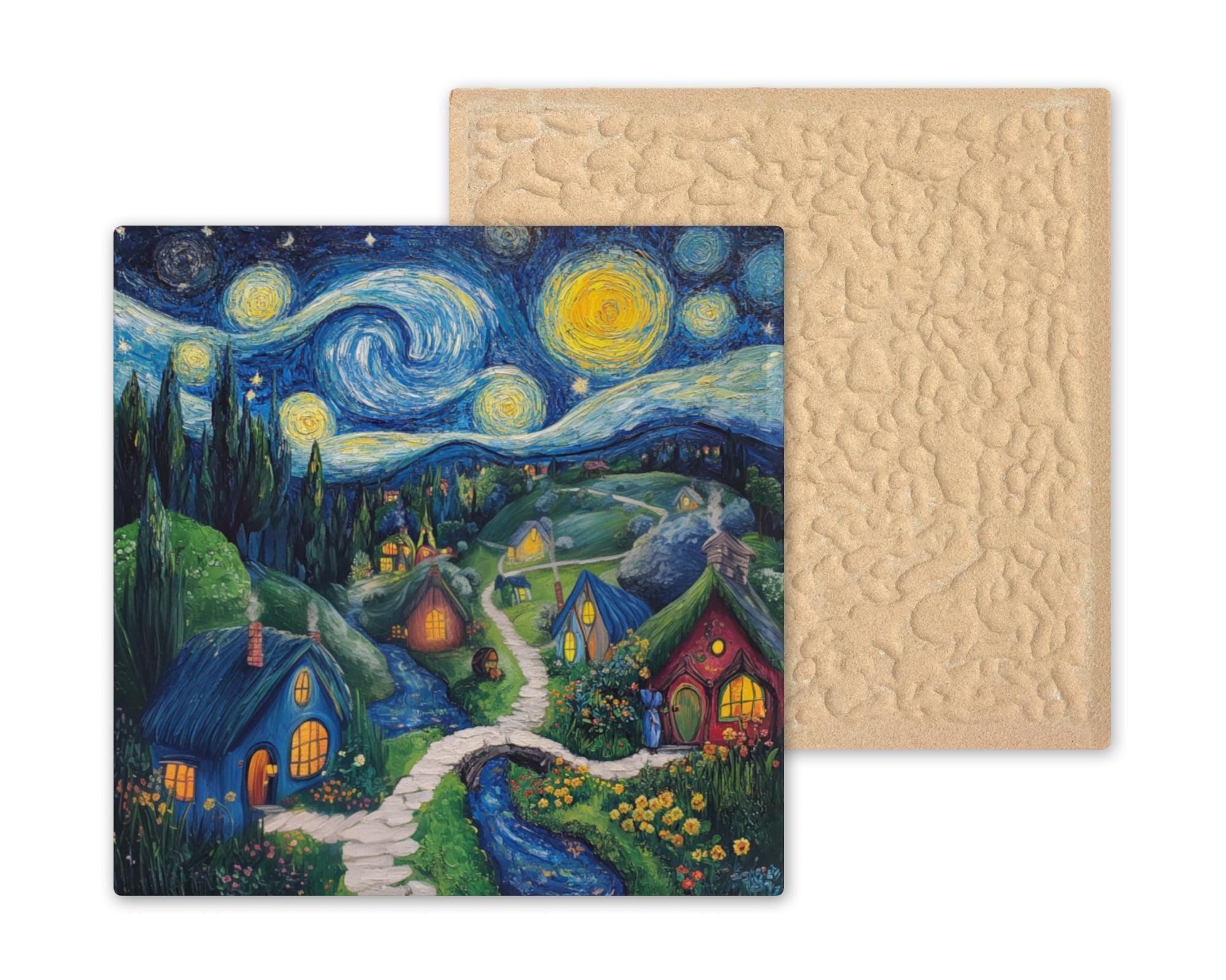Bring cozy fantasy charm to your home with this Starry Night-inspired hobbit village ceramic tile. A whimsical blend of Van Gogh’s iconic swirling sky and magical hilltop cottages, this piece is both imaginative and heartwarming. Ideal as wall décor, trivet, or tabletop art, this tile is a beautiful nod to classic art and fairytale living. Includes optional tile wall hanger, easel stand, or cork back. A perfect gift for fantasy lovers, Tolkien fans, or dreamers.