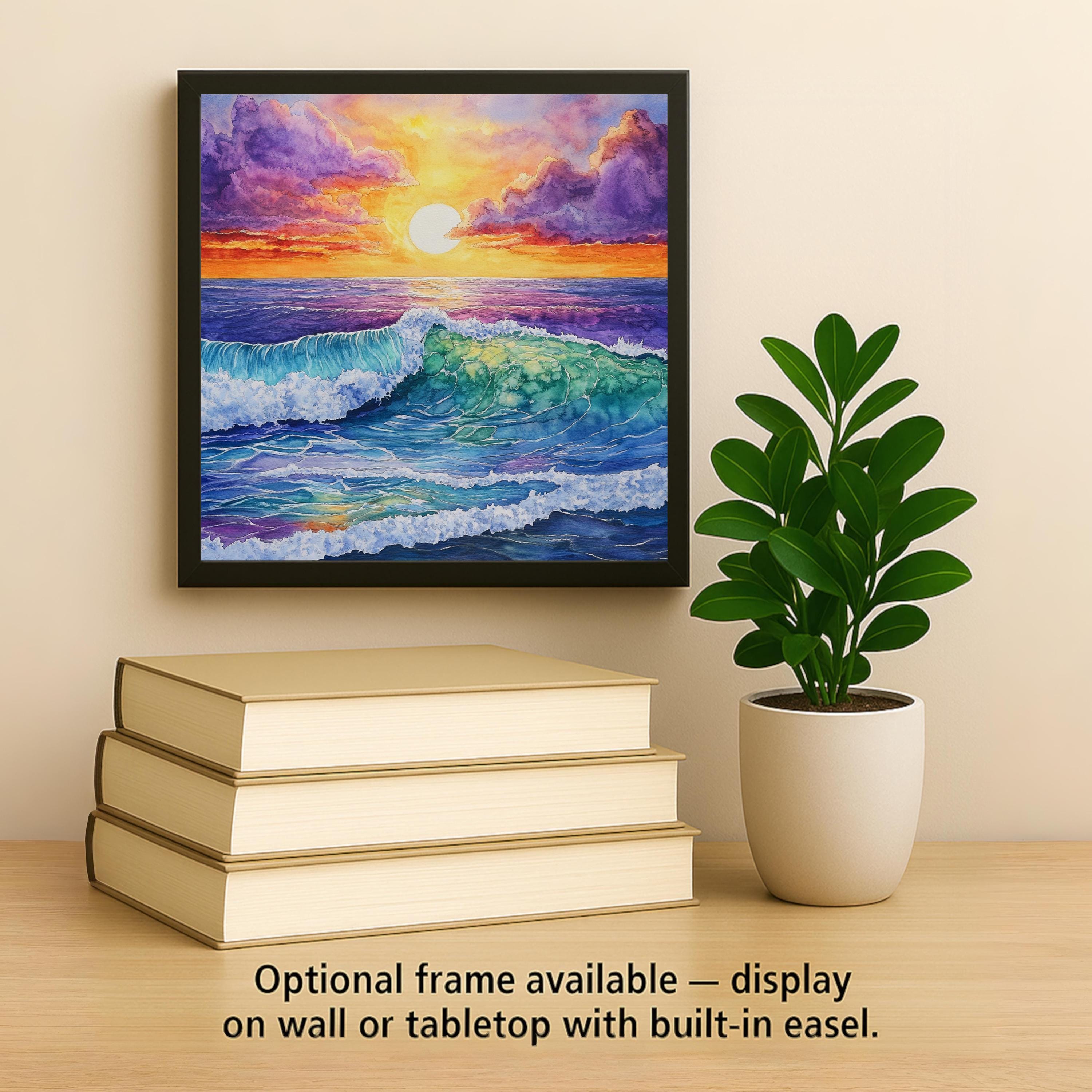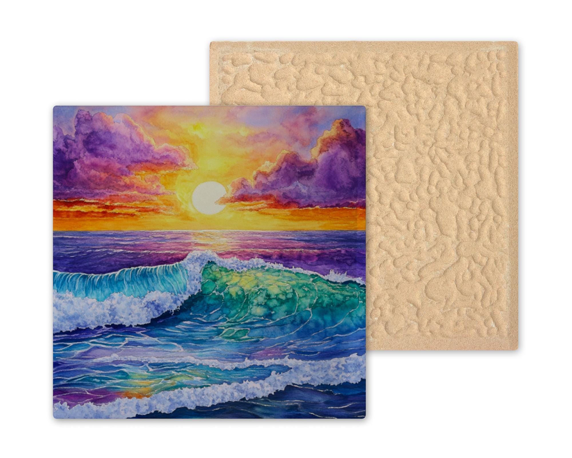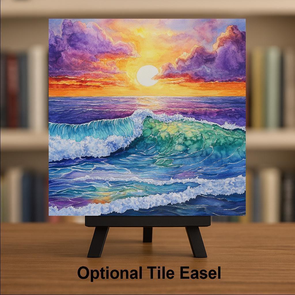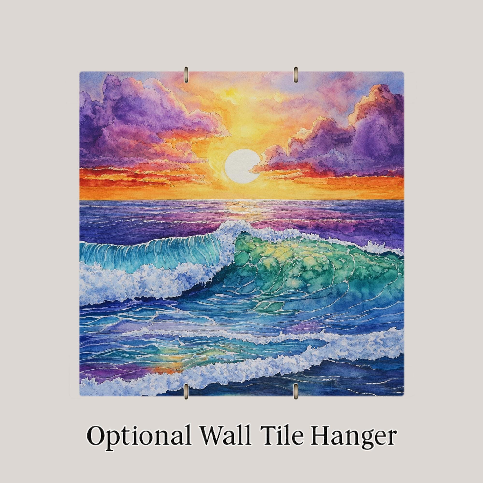 Add a touch of tropical magic to your home with this ocean sunset ceramic tile. Designed in a bold watercolor style, this tile features rolling waves in emerald and cobalt blue under a golden sun with dramatic purple and orange skies. The dynamic composition and vivid colors bring energy and serenity, perfect for a beach house, bathroom, or any ocean-themed décor.
