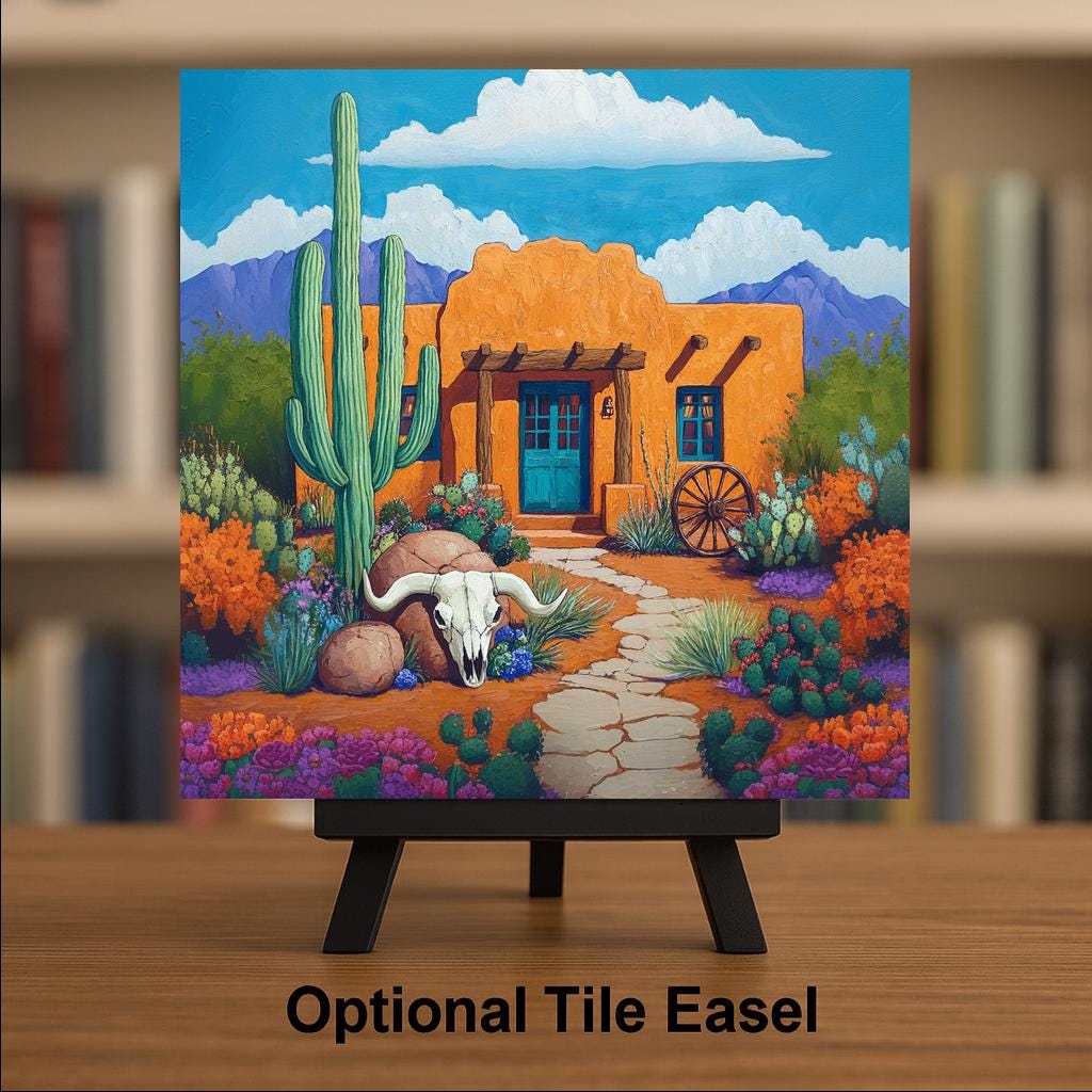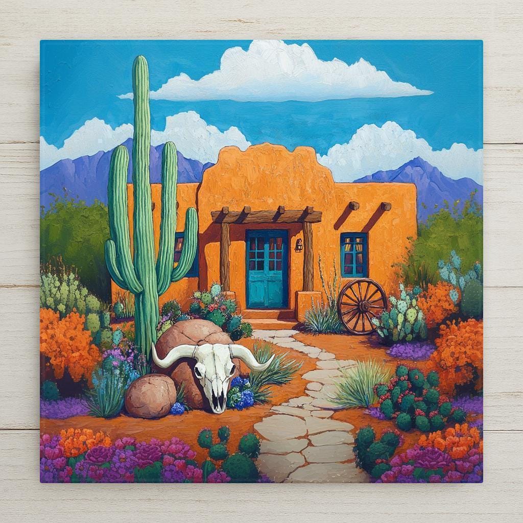 Celebrate the iconic spirit of the desert Southwest with this Adobe House Ceramic Tile, a colorful tribute to the landscapes and architecture of Arizona and New Mexico. From the vibrant adobe walls and deep blue door to the blooming cacti and desert flora, every detail evokes warm sunshine, open skies, and rich regional heritage.
