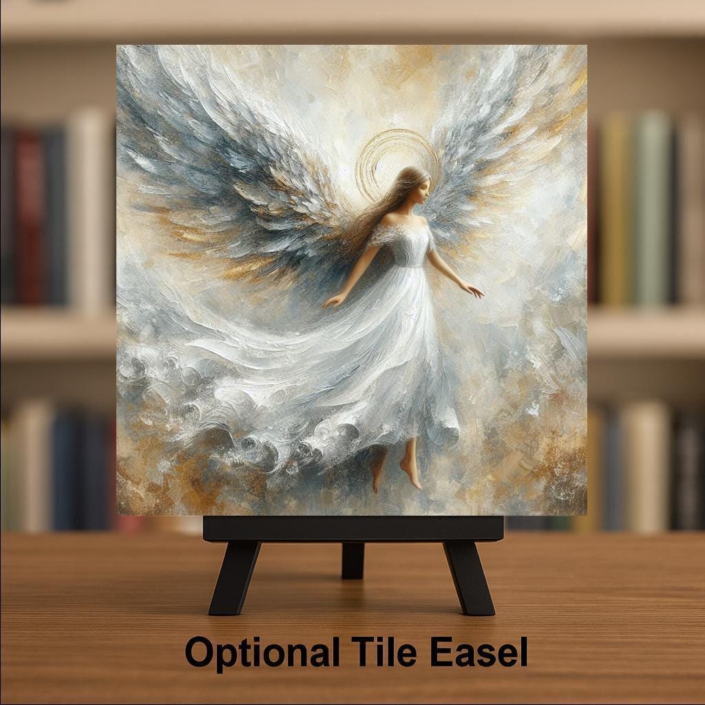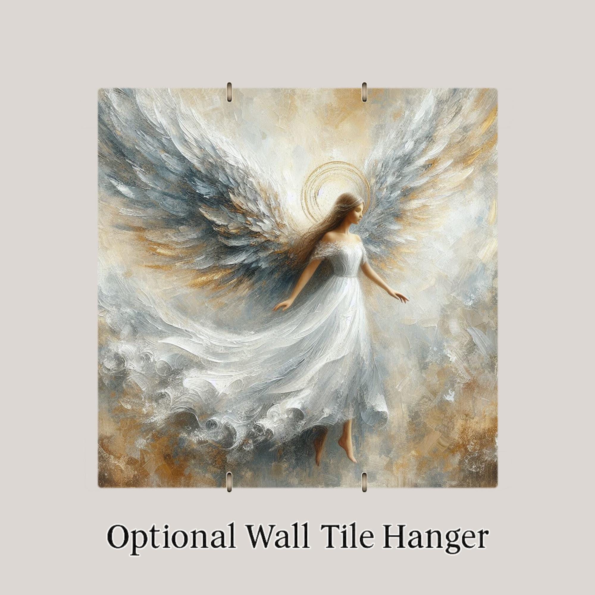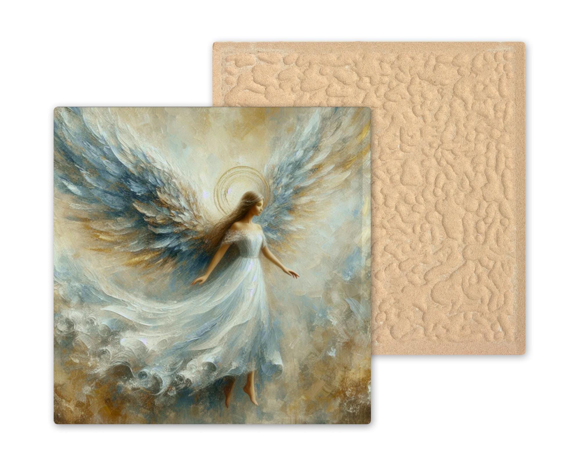Honor the spirit of peace and remembrance with this handcrafted ceramic angel tile. A graceful angel is depicted in motion, her wings open wide as she floats in a swirl of soft light. With a serene expression and delicate details, this spiritual wall art brings a sense of divine presence to your home.