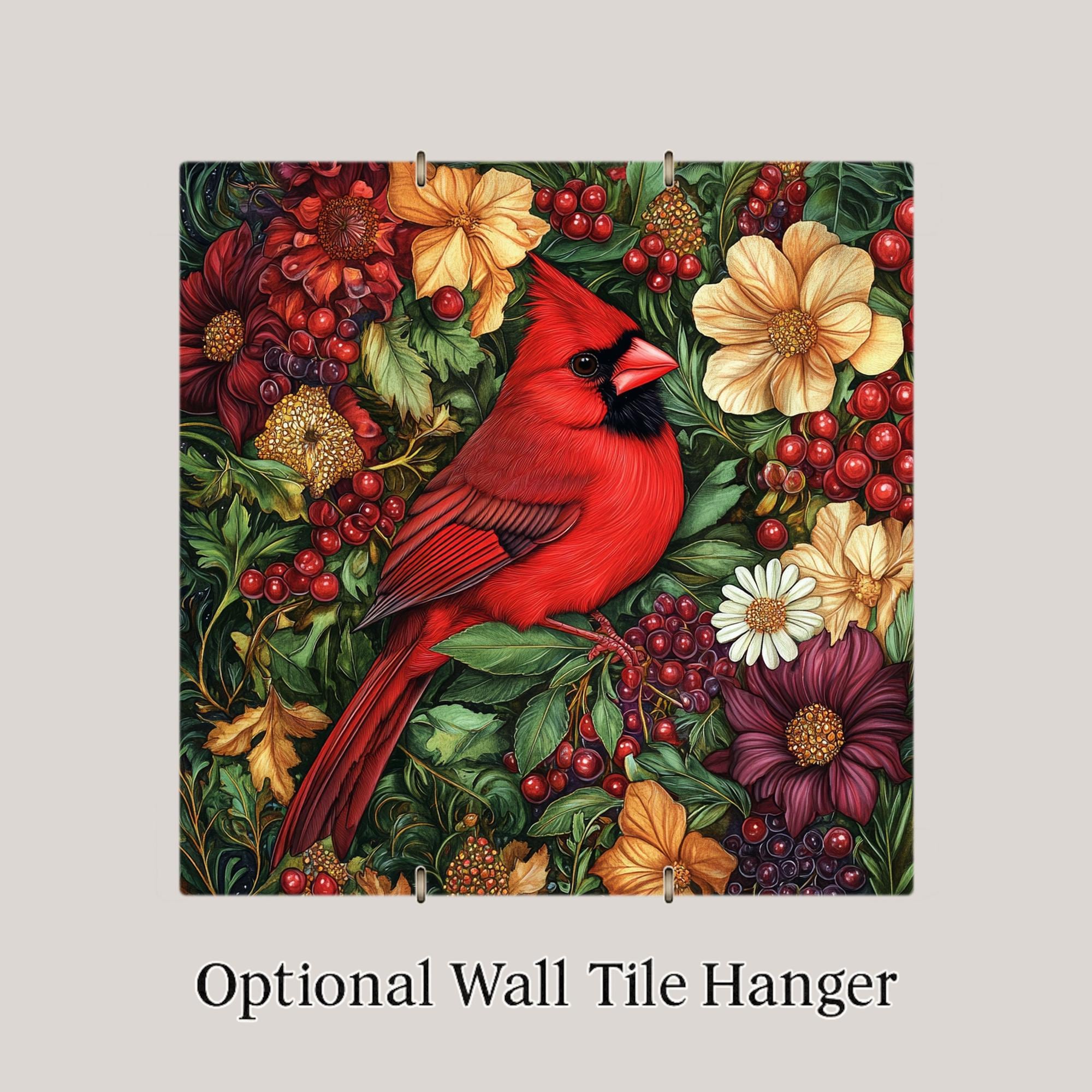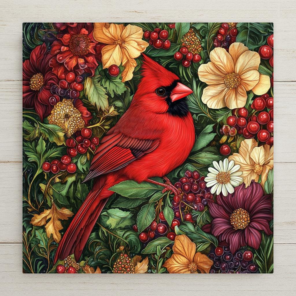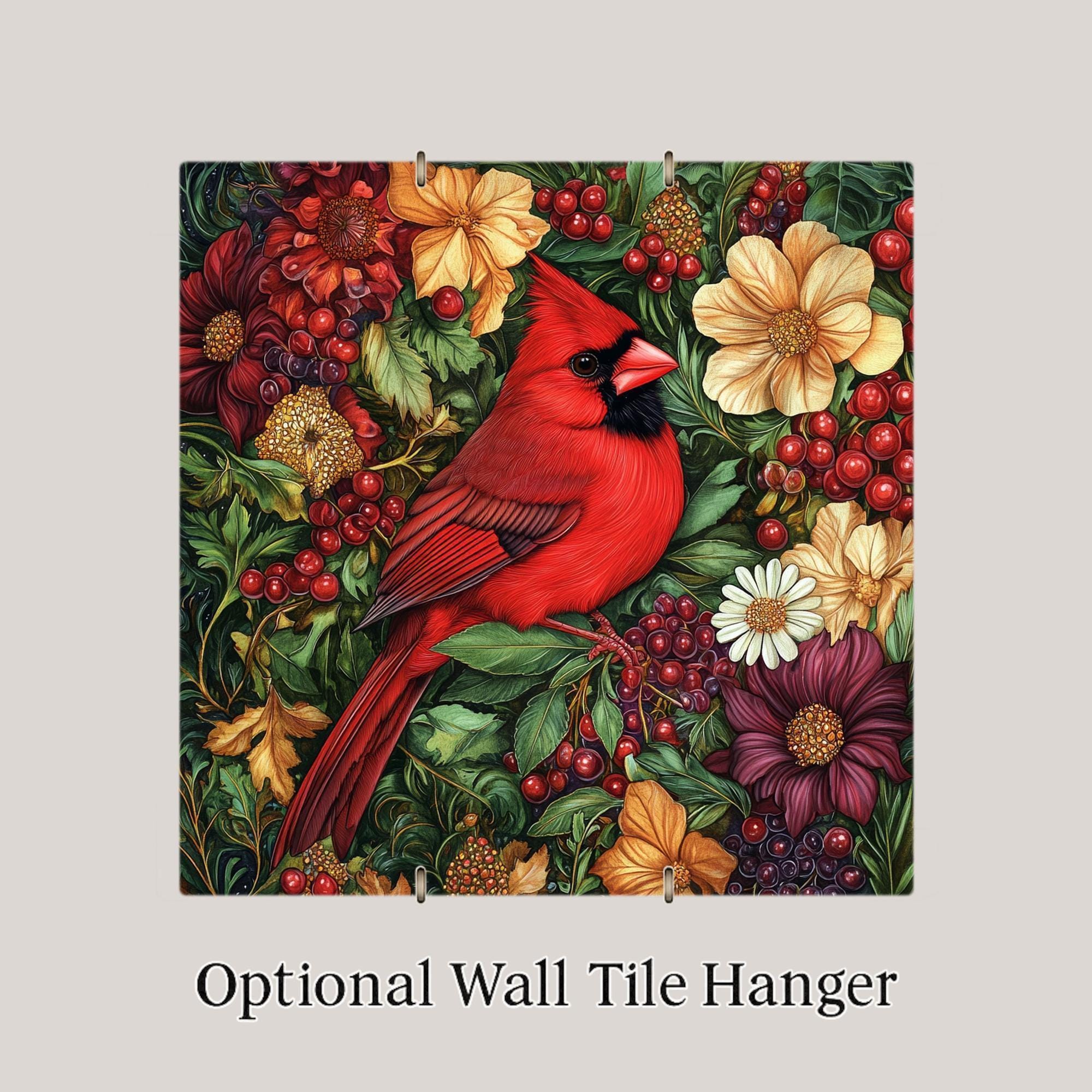 This Art Nouveau-inspired red cardinal tile features a vivid bird perched among a forest of berries and floral foliage, echoing the timeless style of William Morris with every detail. Each leaf, blossom, and vine wraps around the cardinal in a lush tapestry of warm earth tones, golden yellows, and vibrant reds. The design feels alive—an elegant nod to Victorian woodland art infused with bold color and soulful symbolism.