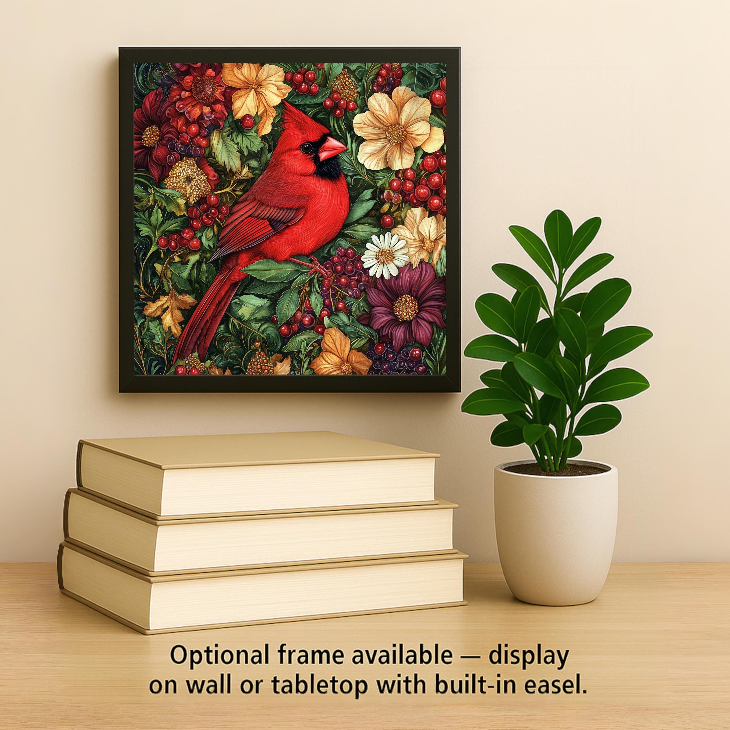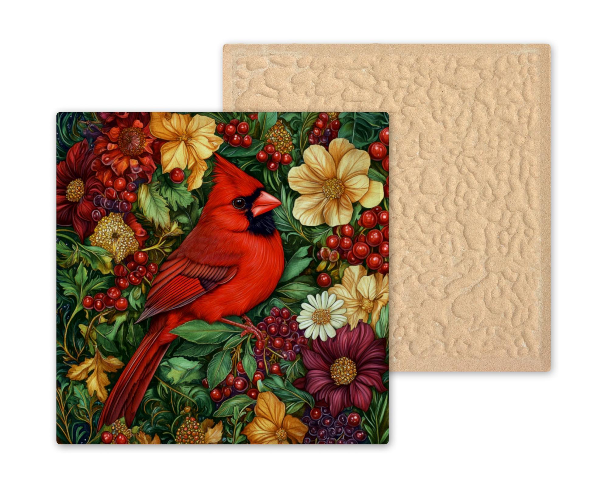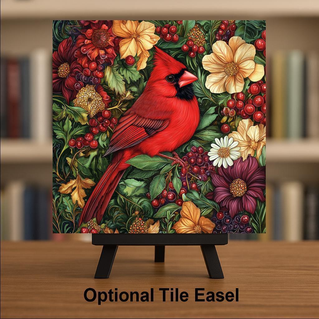 This Art Nouveau-inspired red cardinal tile features a vivid bird perched among a forest of berries and floral foliage, echoing the timeless style of William Morris with every detail. Each leaf, blossom, and vine wraps around the cardinal in a lush tapestry of warm earth tones, golden yellows, and vibrant reds. The design feels alive—an elegant nod to Victorian woodland art infused with bold color and soulful symbolism.