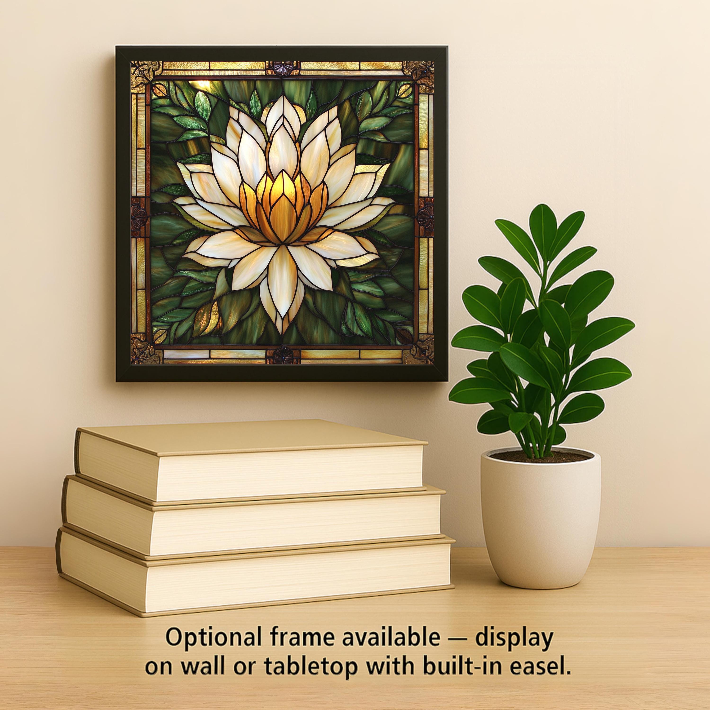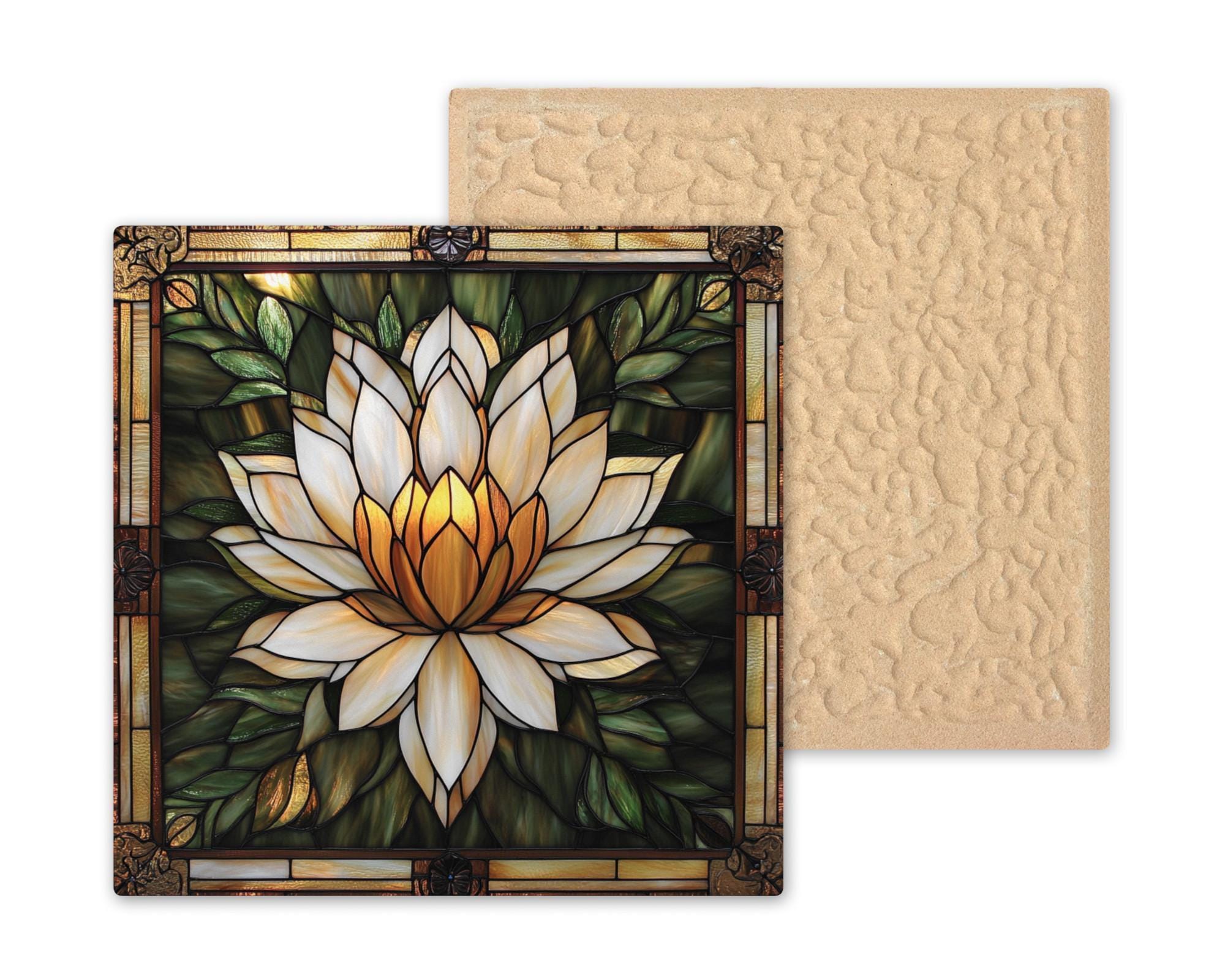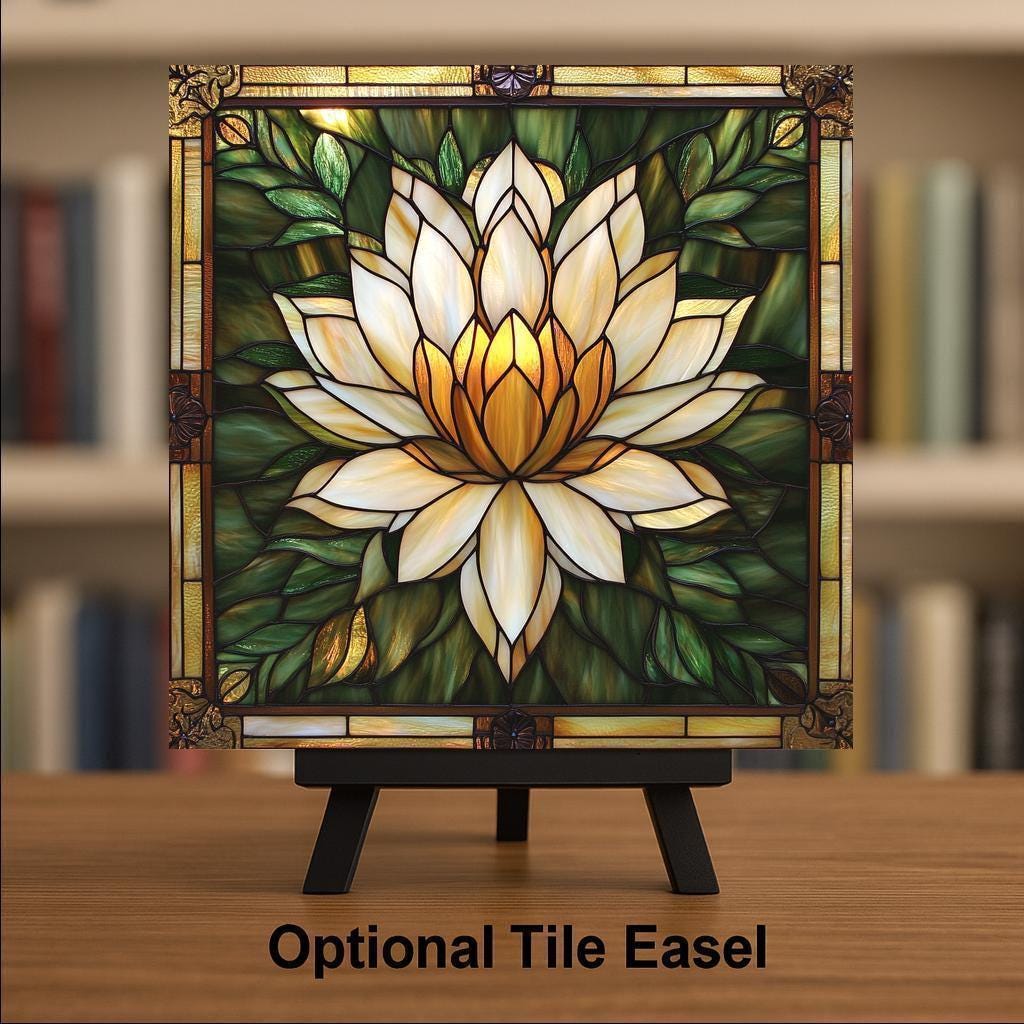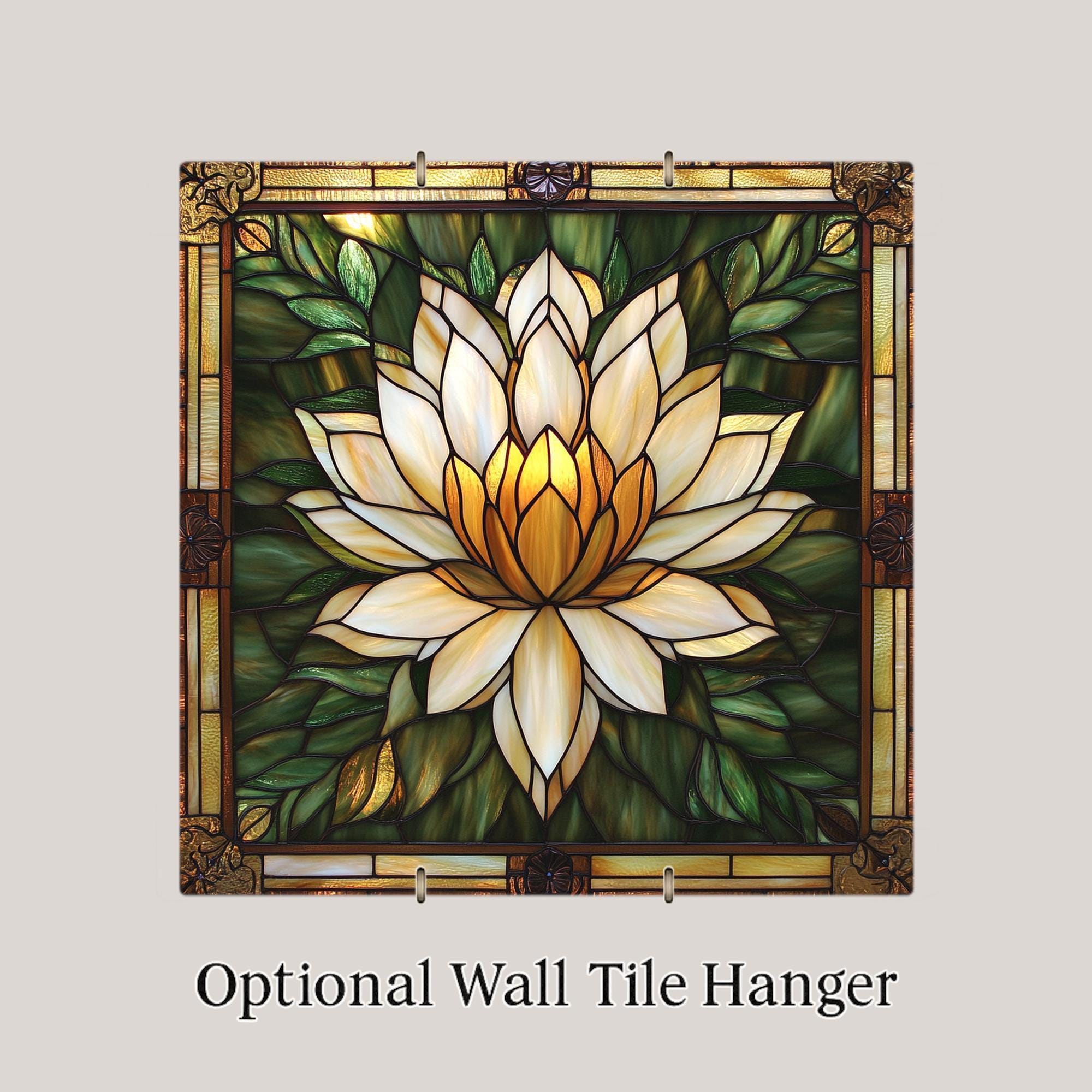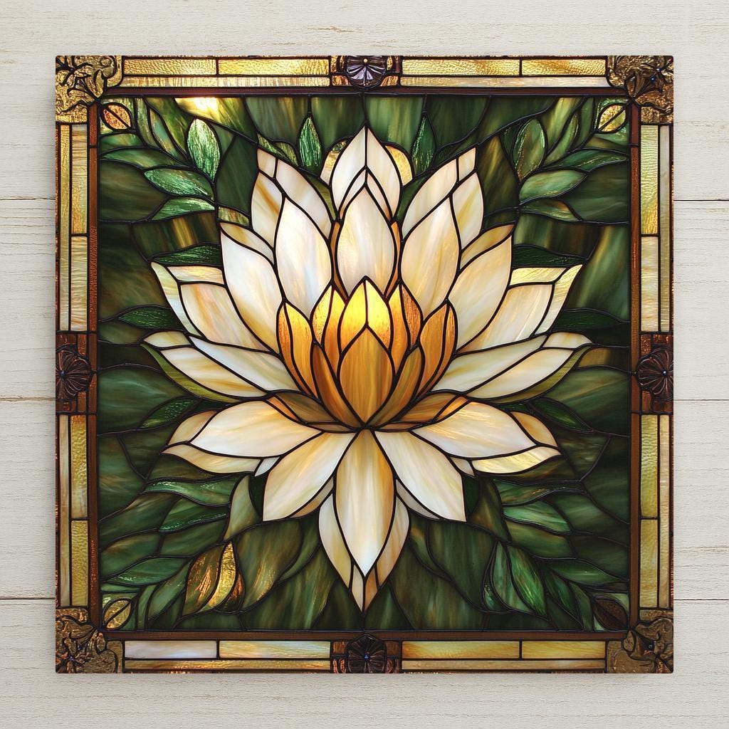 Elevate your home with the spiritual elegance of this Tiffany-style Lotus Flower Ceramic Tile Art. Capturing the timeless beauty of a white and golden lotus in full bloom, this tile is a celebration of peace, transformation, and nature’s brilliance. The Art Nouveau-inspired design includes rich green leaves, golden hues, and a luminous center, creating a striking focal point that radiates harmony.