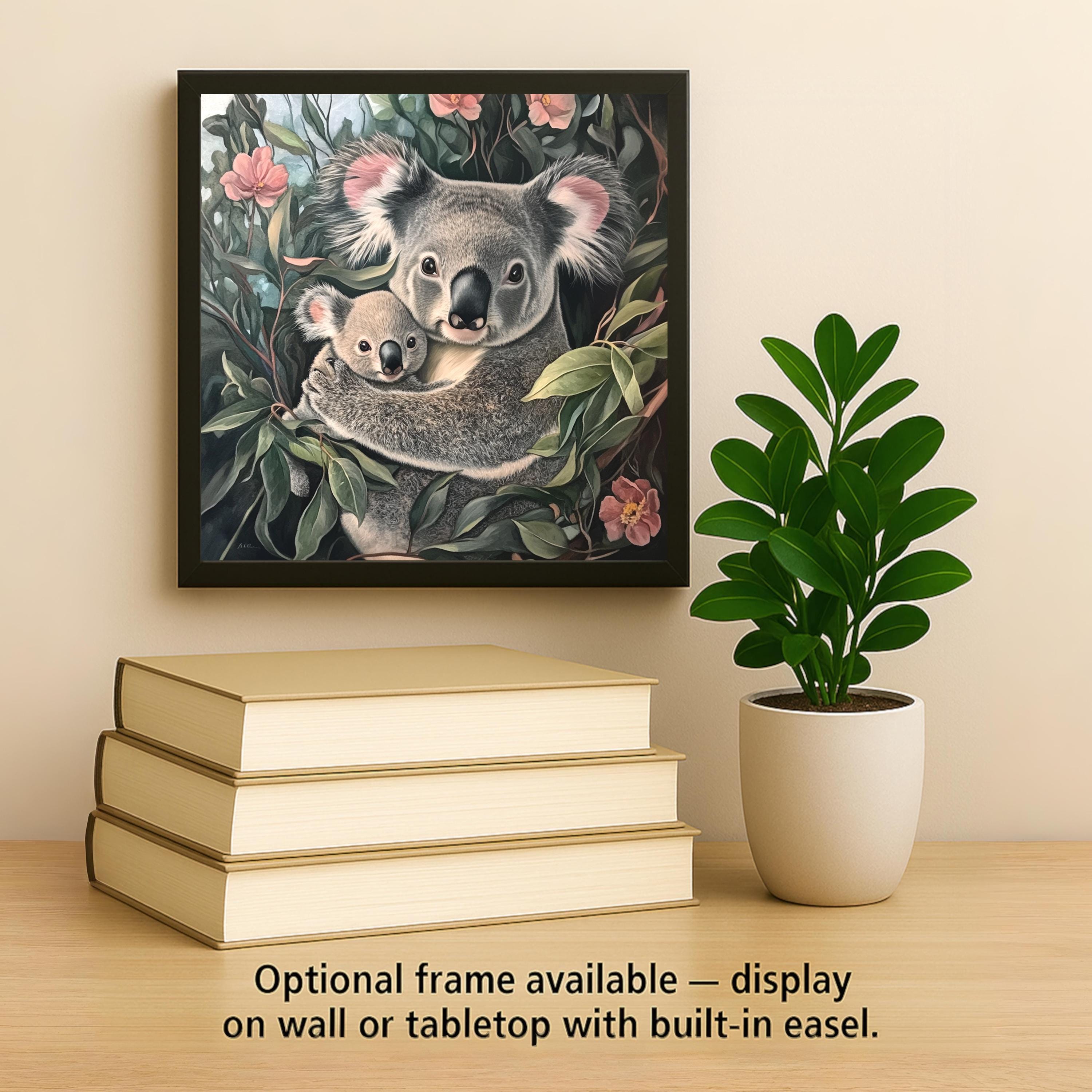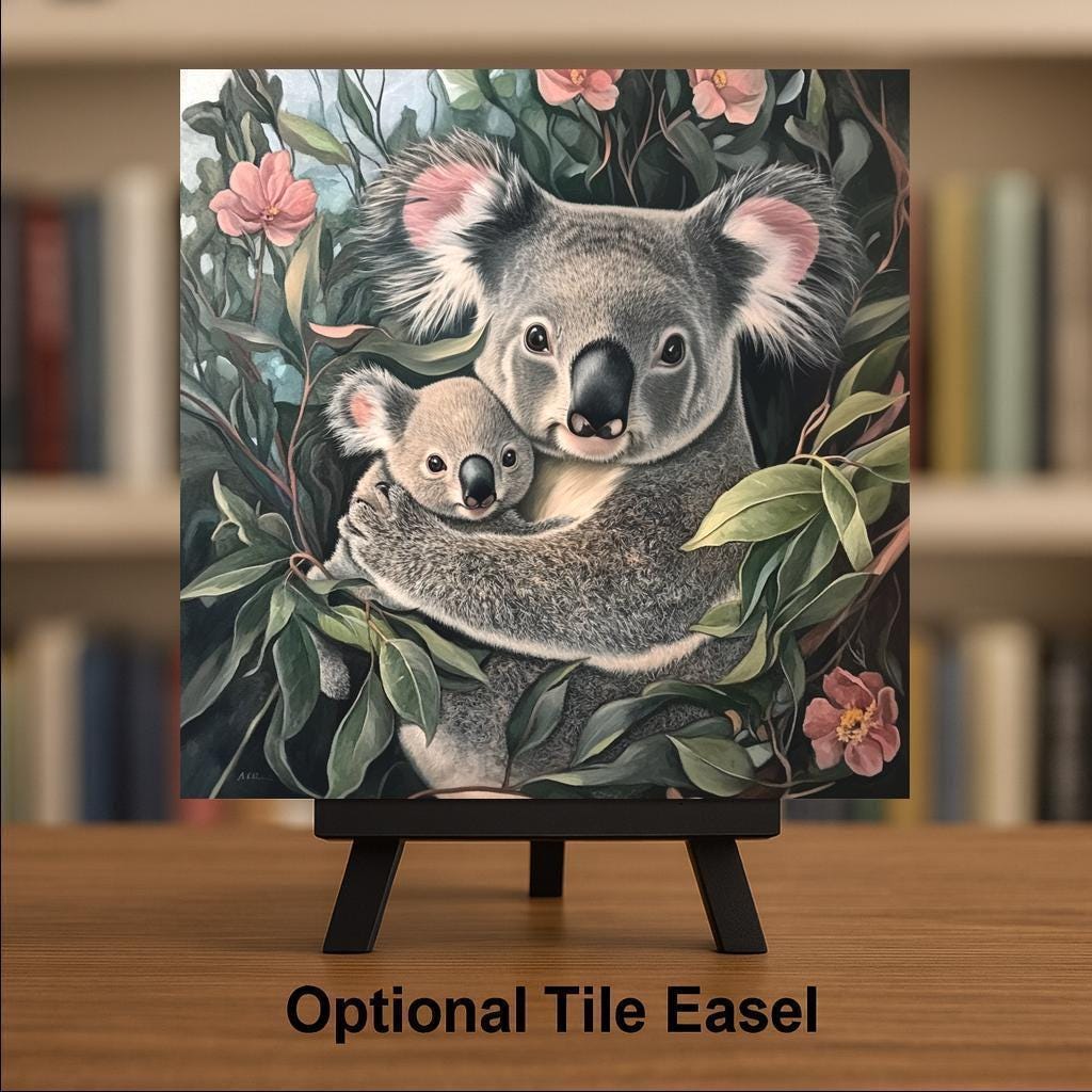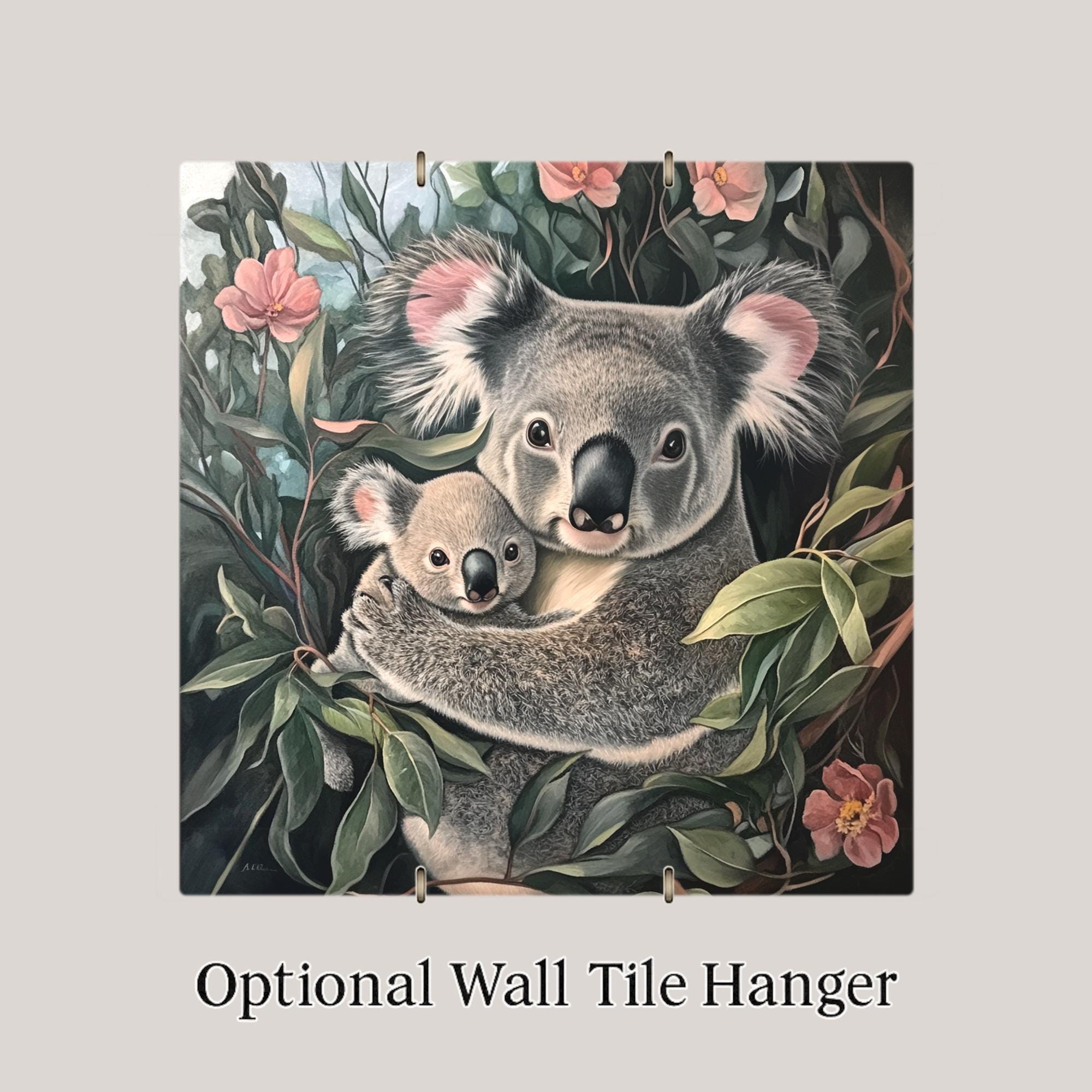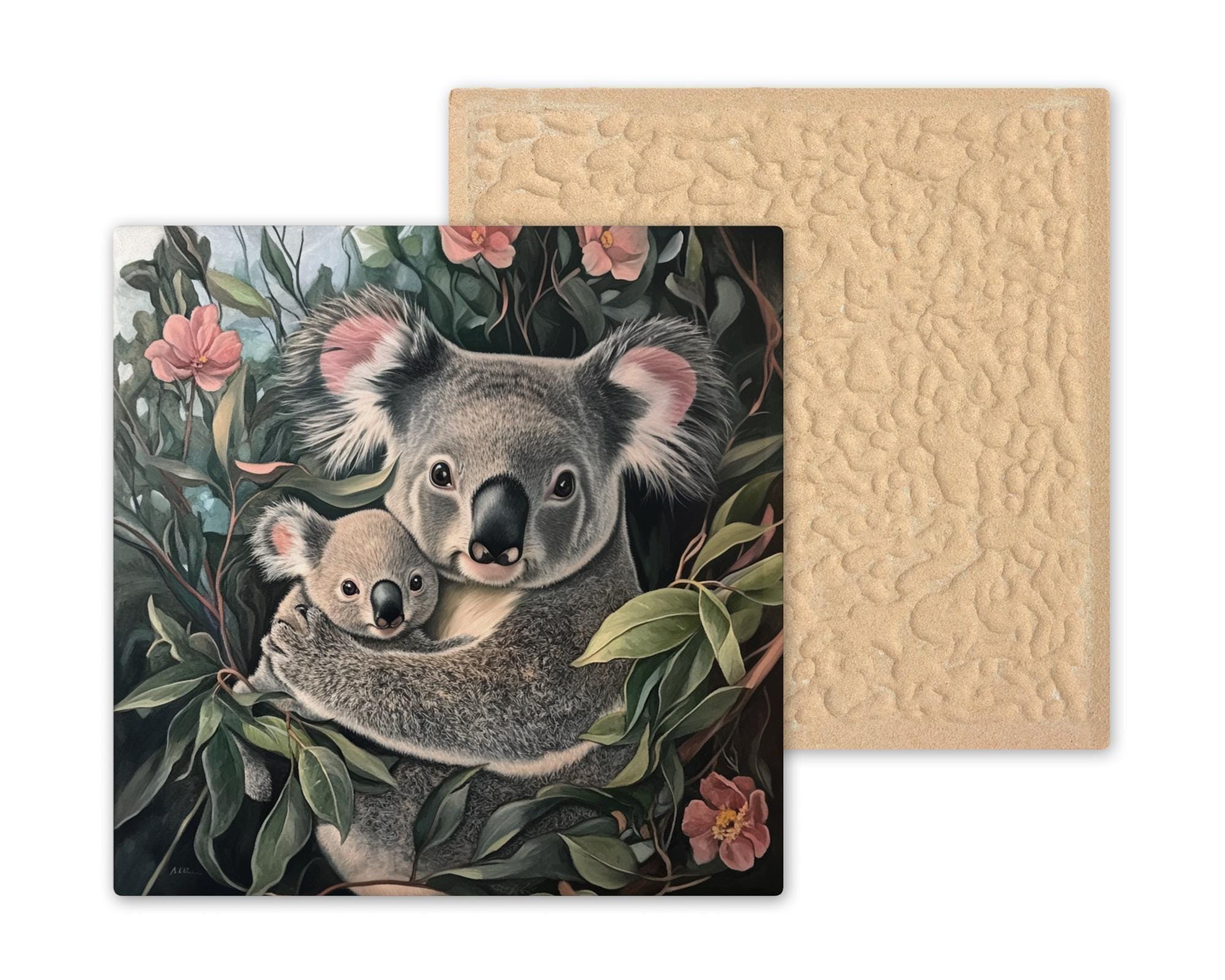This handmade koala ceramic tile features a sweet, realistic illustration of a mother koala cuddling her baby in a eucalyptus grove. With soft brush textures, botanical accents, and rich earth tones, it captures the beauty of Australian wildlife and the comfort of maternal love. Framed by florals and forest foliage, it feels like a quiet moment in nature frozen in time.