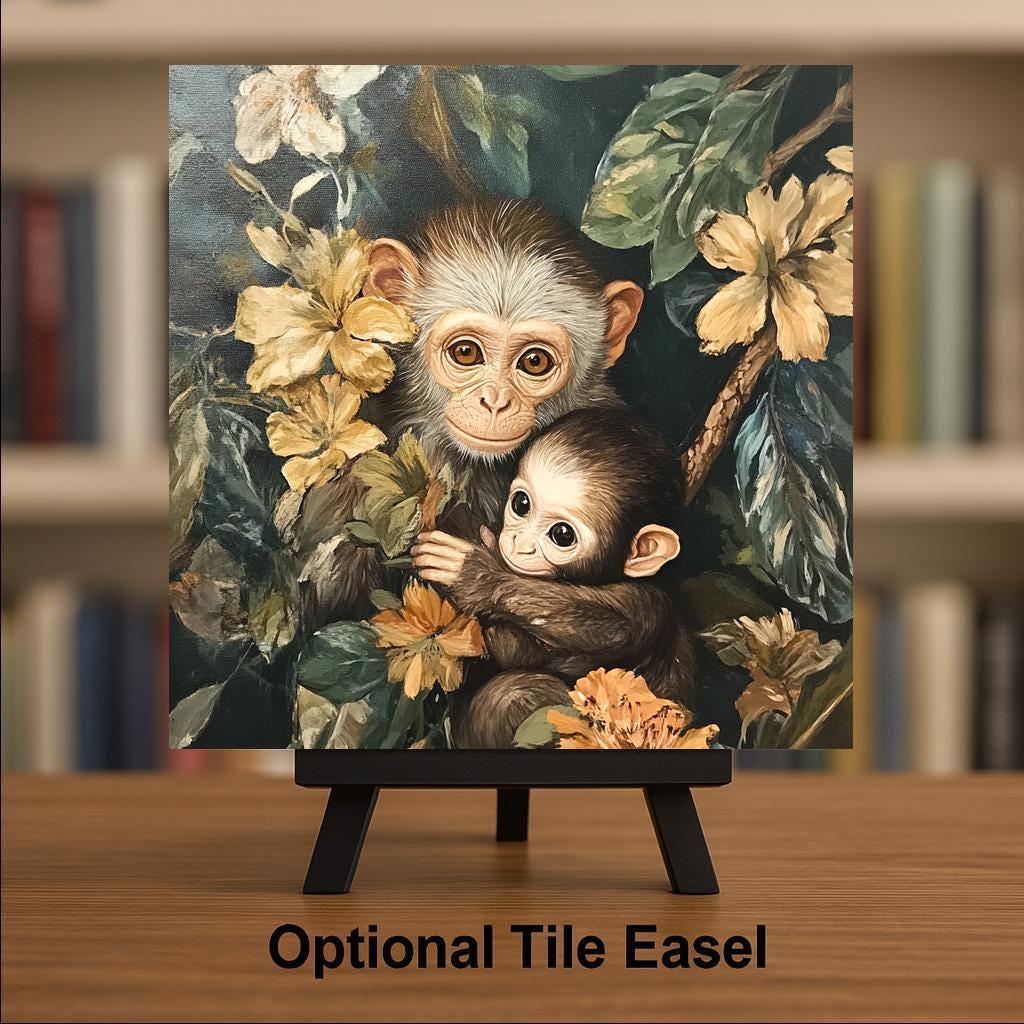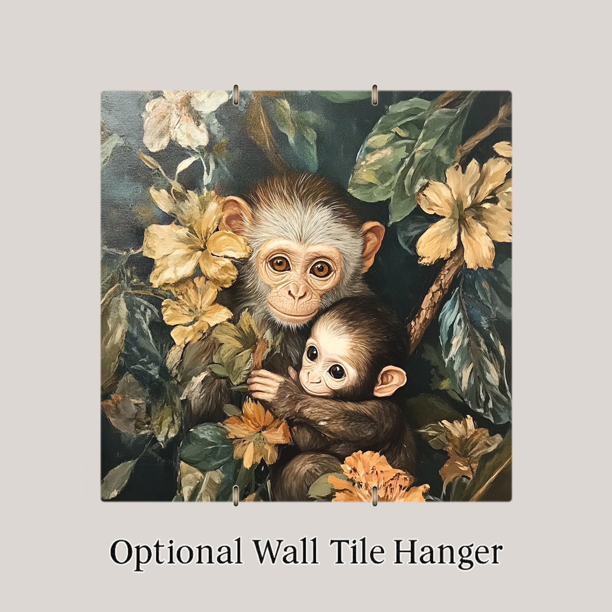 Bring nurturing jungle charm into your home with this woodland monkey ceramic tile, inspired by classic William Morris motifs. A sweet mother and baby monkey cuddle among golden hibiscus and lush greenery, blending wild nature with vintage botanical elegance. The deep greens and warm amber tones make it ideal for cozy kitchens, boho bedrooms, or whimsical nature-themed spaces.