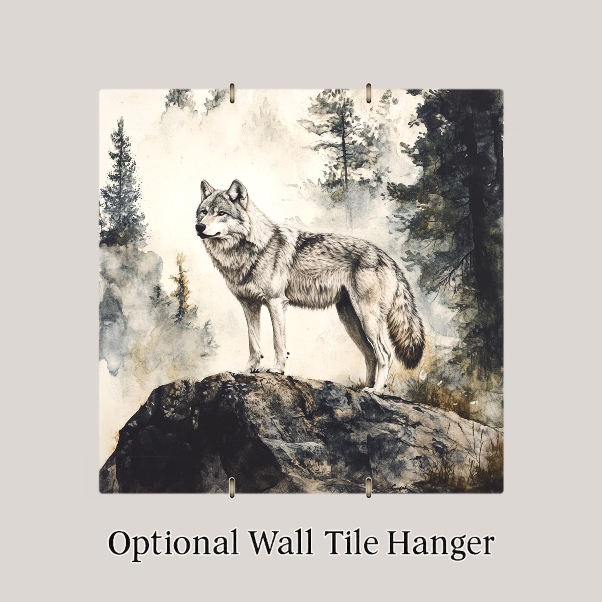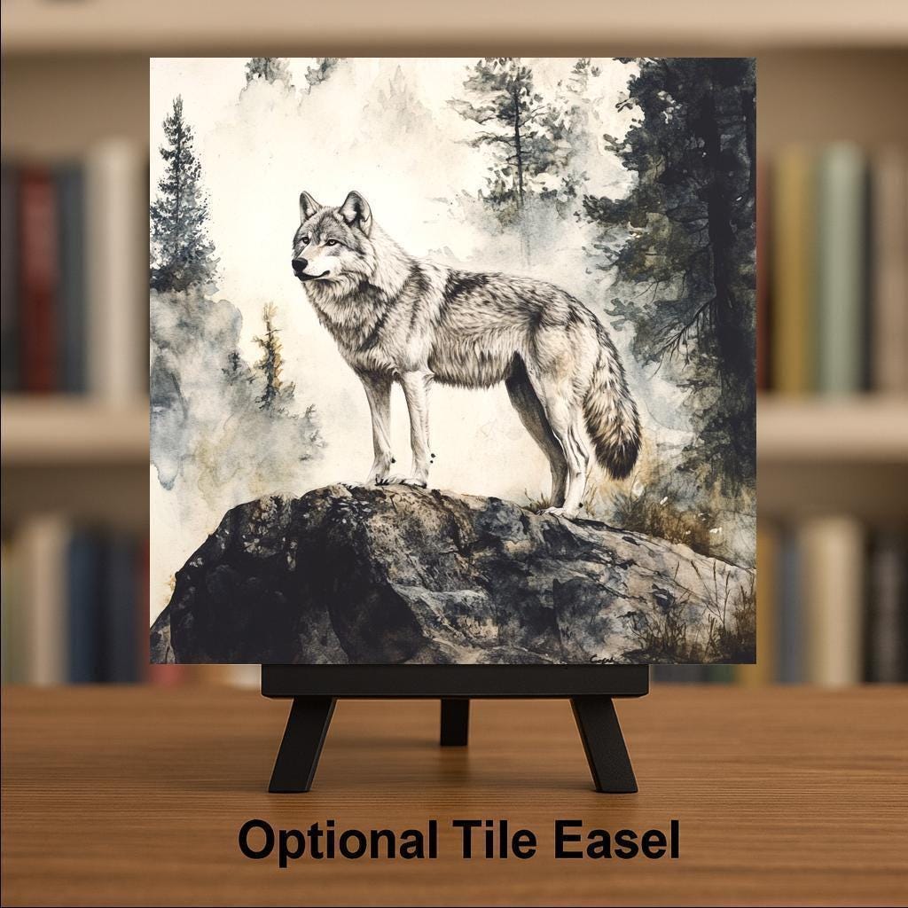 Bring the wild heart of the forest into your space with this Audubon-inspired grey wolf ceramic tile, featuring a lone wolf standing watch atop a rocky cliff. The design, reminiscent of vintage wildlife prints, showcases muted browns, greys, and woodland greens that blend seamlessly with rustic and cabin-style interiors. It's a peaceful yet powerful depiction of one of nature’s most iconic animals.
