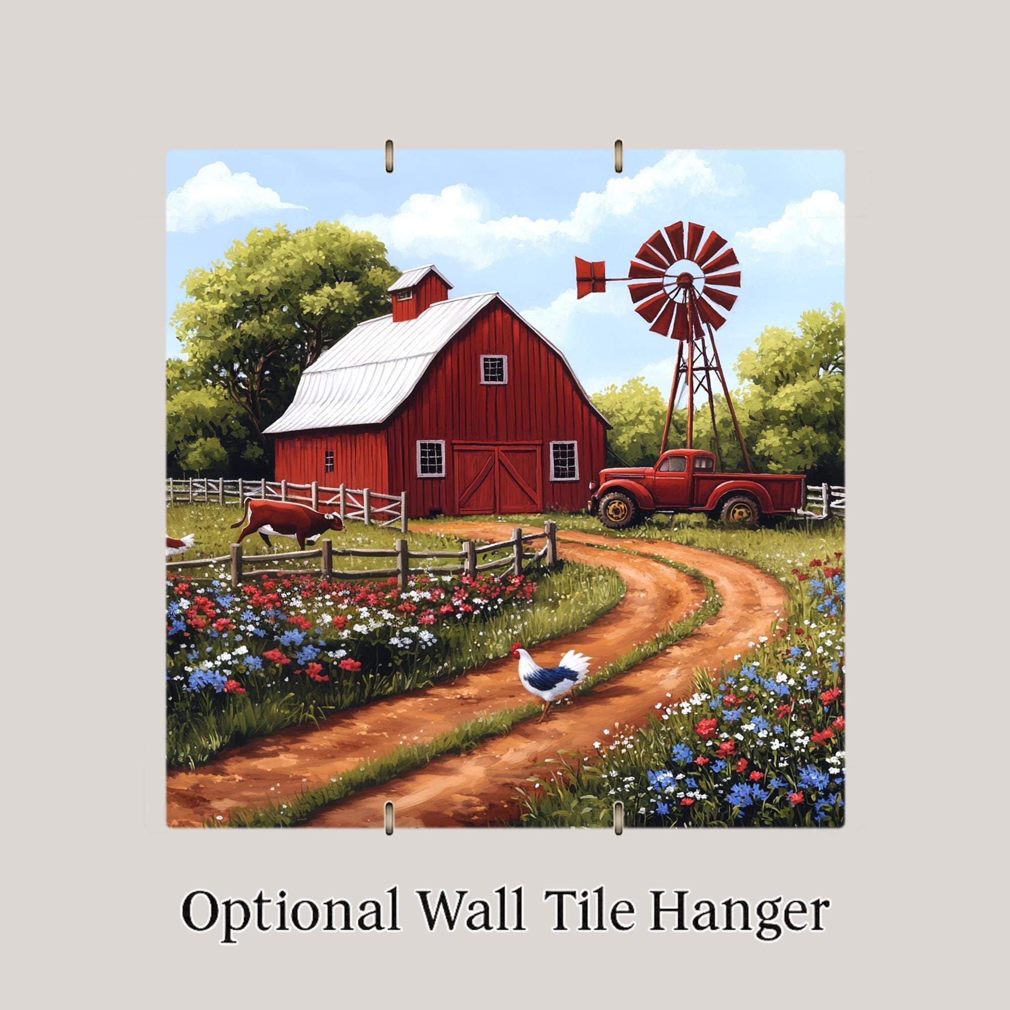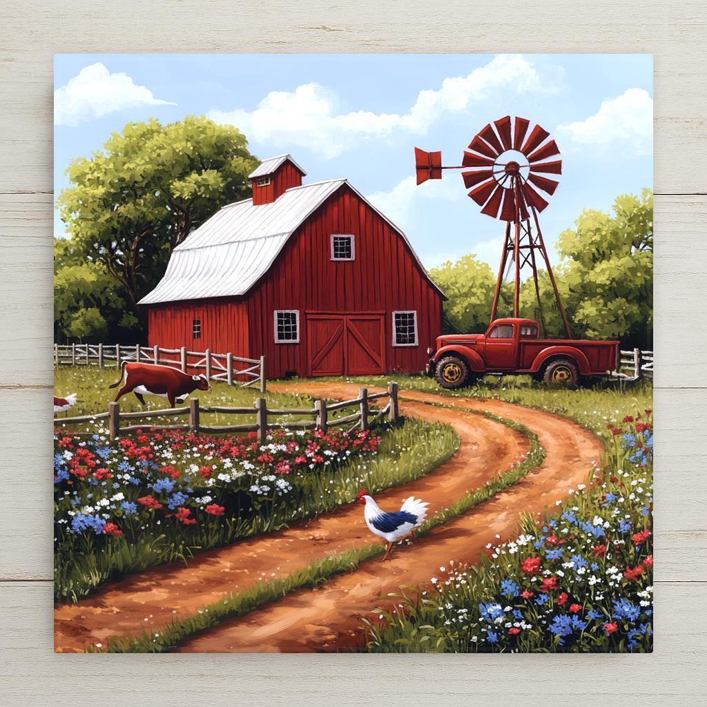 Bring the countryside home with this rustic red barn ceramic tile. A nostalgic scene unfolds with a weathered barn, tall windmill, blooming wildflowers, and a bright red truck parked near a shady tree. Roaming chickens and grazing cows complete the story, making this a peaceful, pastoral moment captured in ceramic.