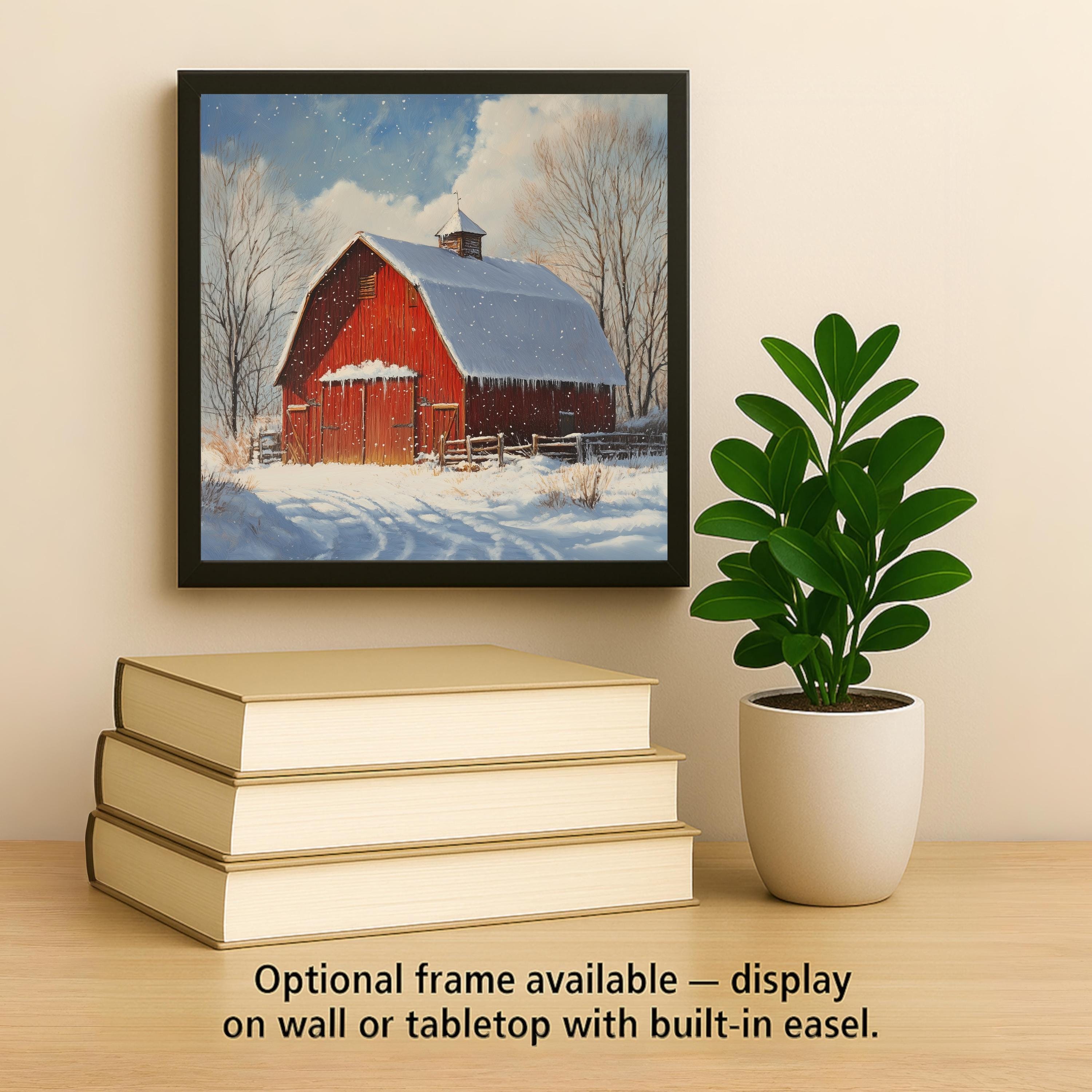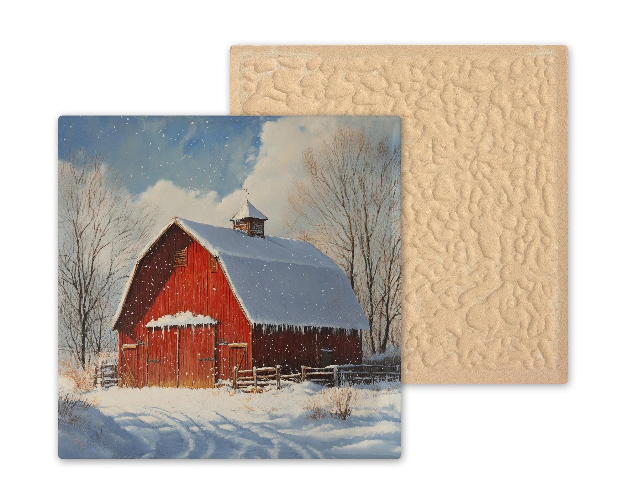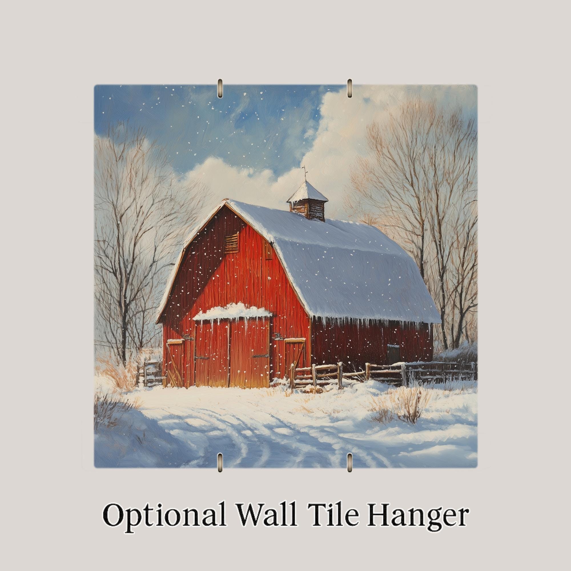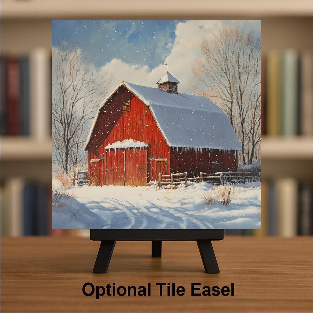 Bring seasonal charm into your home with this red barn winter scene ceramic tile. The snow gently falling across the barnyard creates a peaceful mood, making this piece perfect for cozy winter decorating. The bold red barn, paired with soft snow and bare winter trees, brings contrast and warmth to any space. This tile captures a classic rural moment and adds a nostalgic farmhouse feel to your decor.