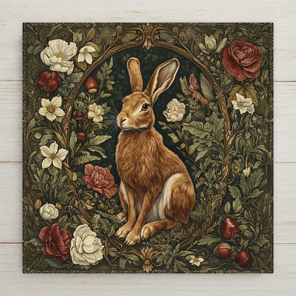 Celebrate timeless design and woodland beauty with this William Morris-inspired ceramic tile featuring a stately hare. Set against a richly detailed tapestry of flowers, berries, leaves, and vines, the rabbit sits at the center of an ornate Art Nouveau frame. The vintage palette of forest green, deep red, and cream evokes the romance of old-world textiles and antique wallpaper.
