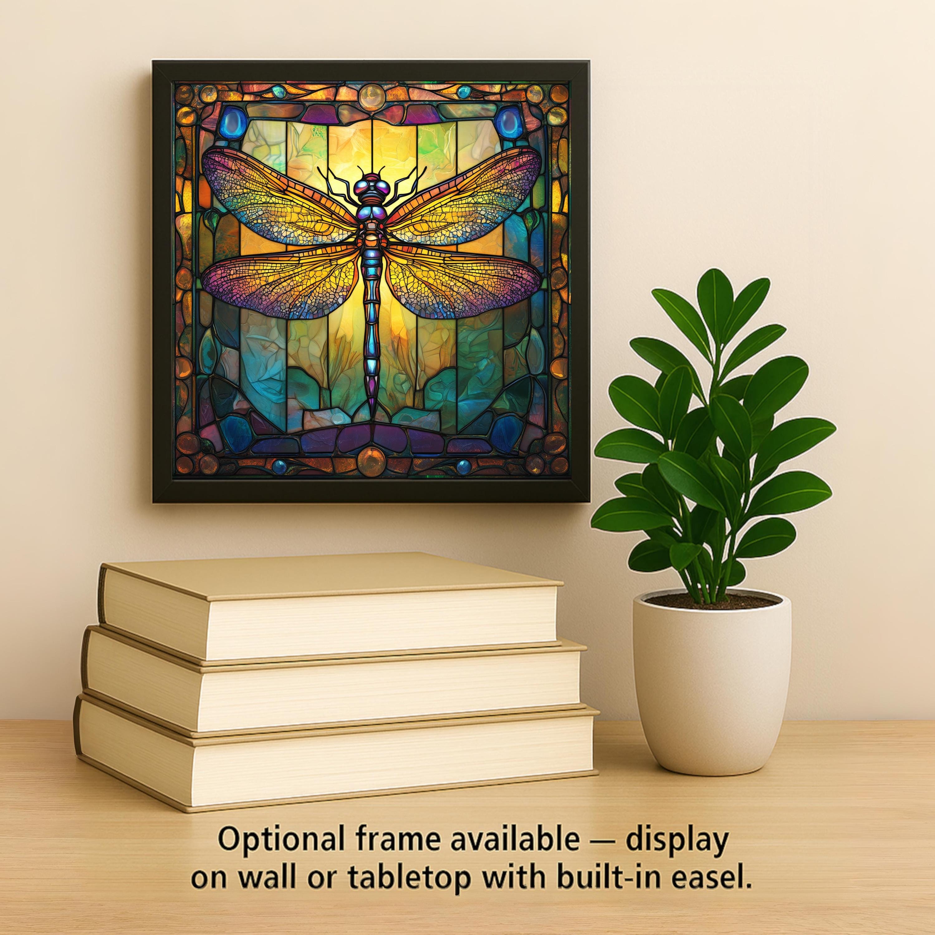 Ideal for nature lovers and dragonfly enthusiasts, the tile fits seamlessly into garden rooms, kitchens, sun porches, or studios. The design is timeless, evoking stained glass cathedral windows and vintage botanical illustrations. Use the optional tile wall hanger for vertical display, or place it on a shelf or mantel with the coordinating easel tile stand. If you prefer a flat, soft base, cork backing is also available.