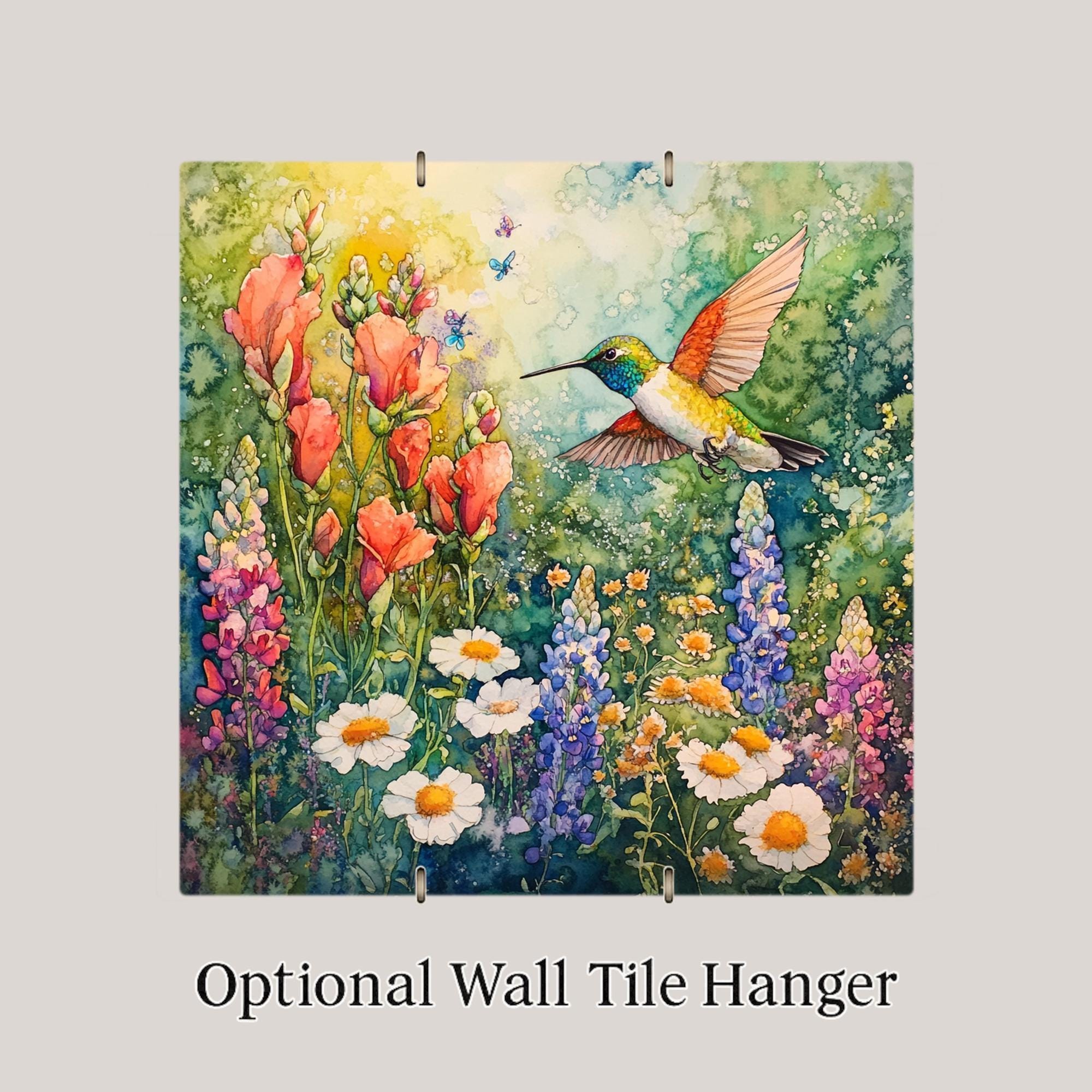 This watercolor hummingbird ceramic tile brings the essence of a sunlit wildflower garden into your home. Featuring a delicate ruby-throated hummingbird mid-flight among a lush patch of daisies, snapdragons, and lupines, this vibrant design captures the spirit of spring in every detail. It's a beautiful piece of nature-inspired art perfect for bird lovers and garden dreamers alike.