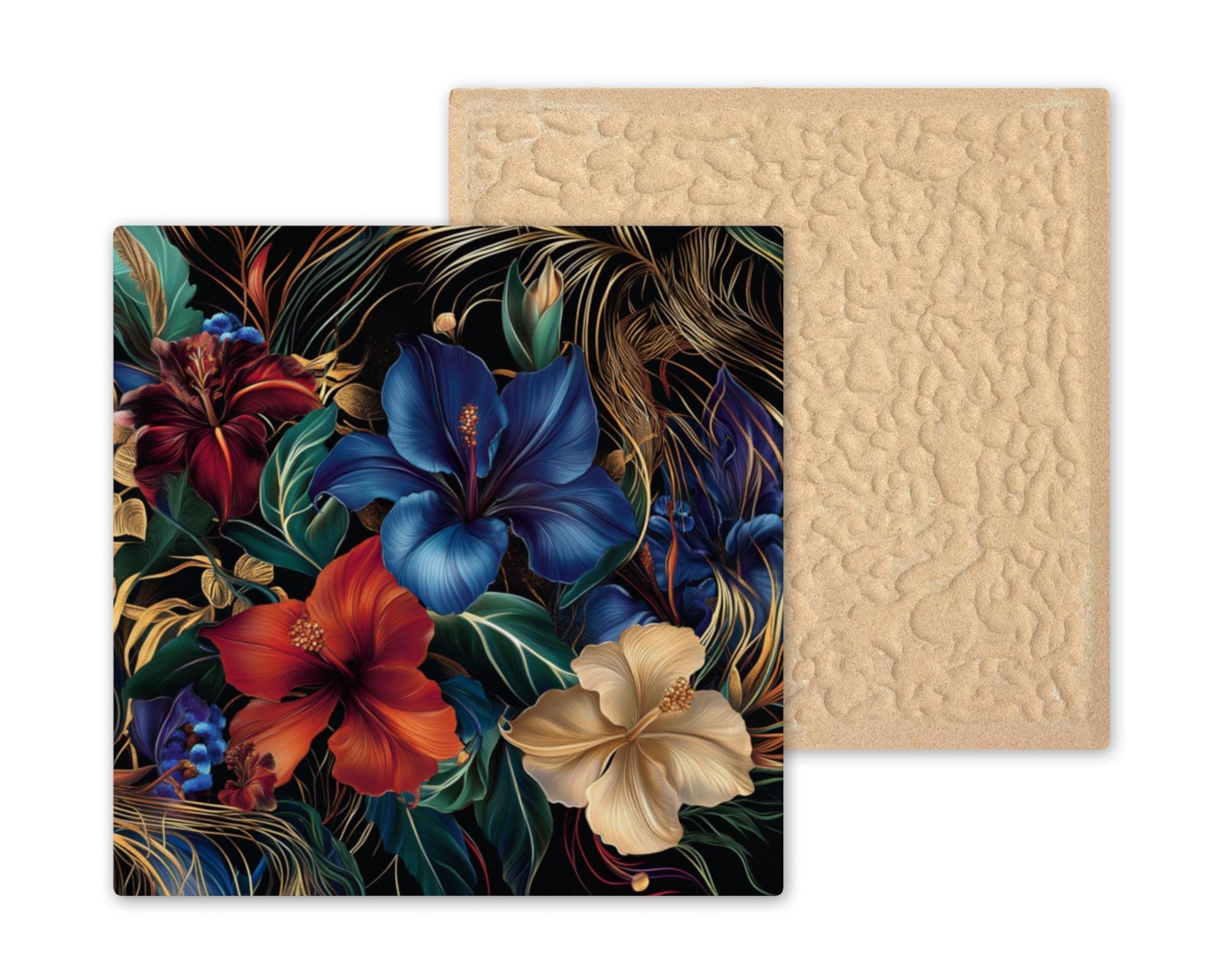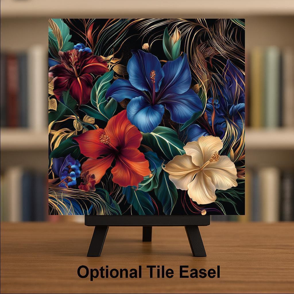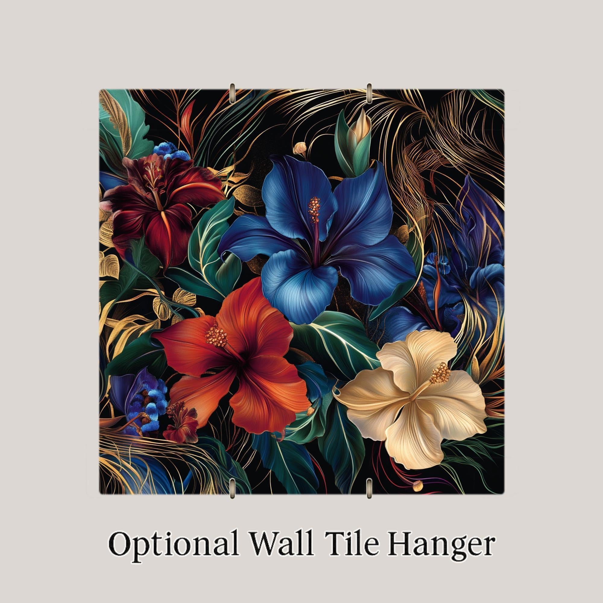 Whether you love romantic florals or bold color palettes, this tile blends both in a breathtaking way. Each flower is rendered with rich texture and movement, creating the feel of a living painting. The dark background makes the colors glow, while the gold accents dance across the surface like wind-blown vines.