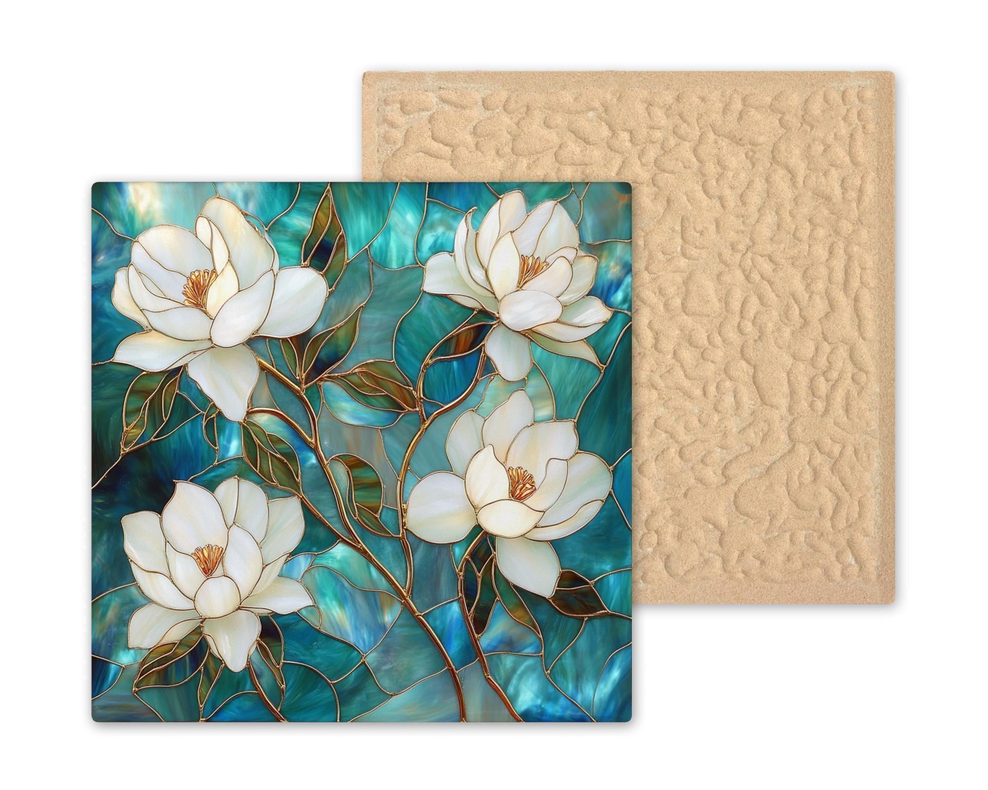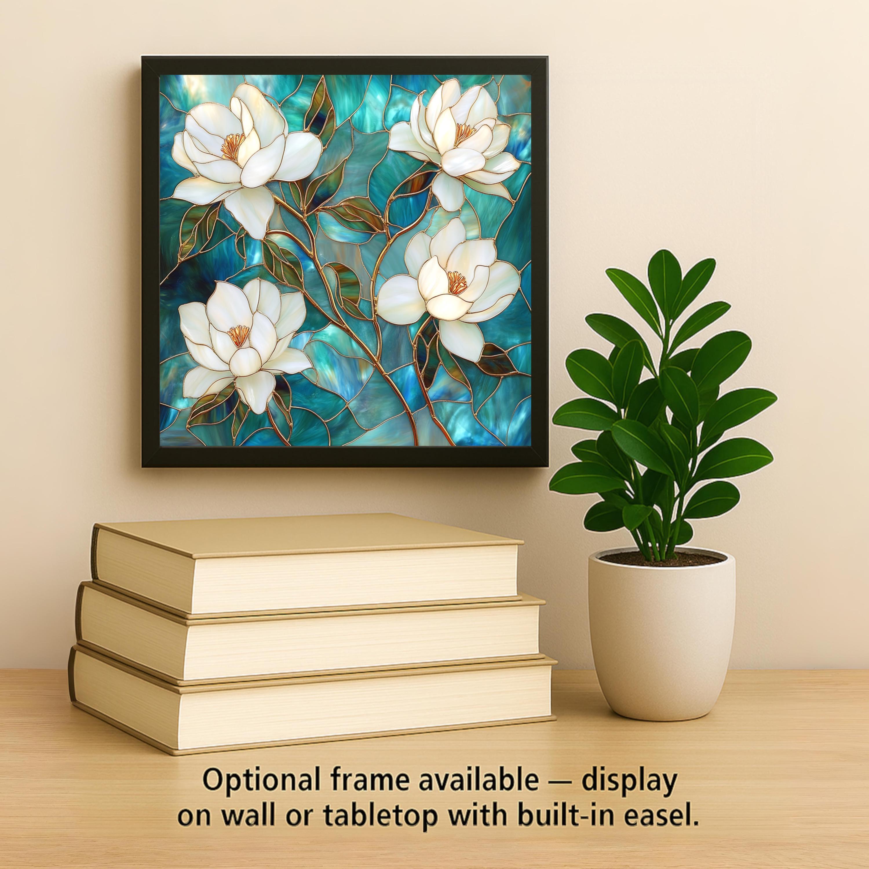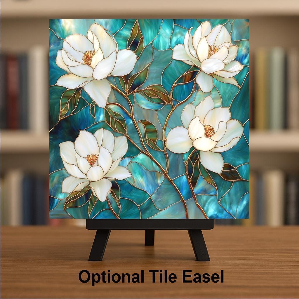 Let your space bloom with luminous beauty. This stained glass magnolia tile features oversized, iridescent flowers and curling gold-lined vines against a glowing teal mosaic. It feels like something from a fantasy world—lush, peaceful, and glowing like sunlight through glass. Whether part of a gallery wall or standing alone, it’s a striking piece that brings magic into any room.