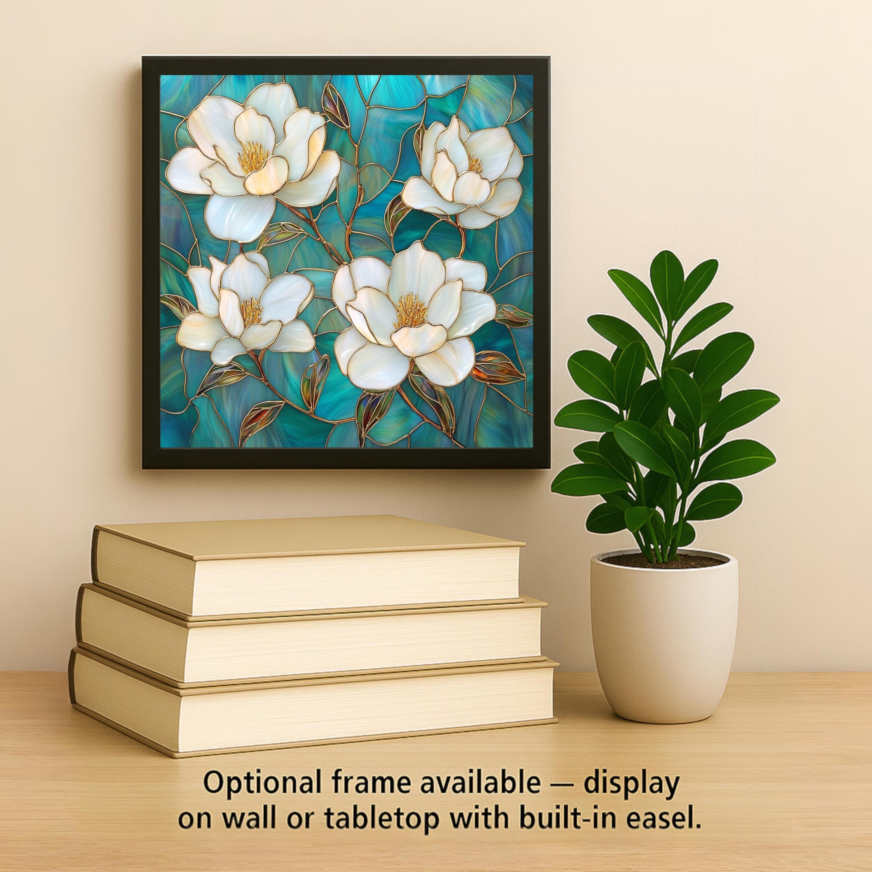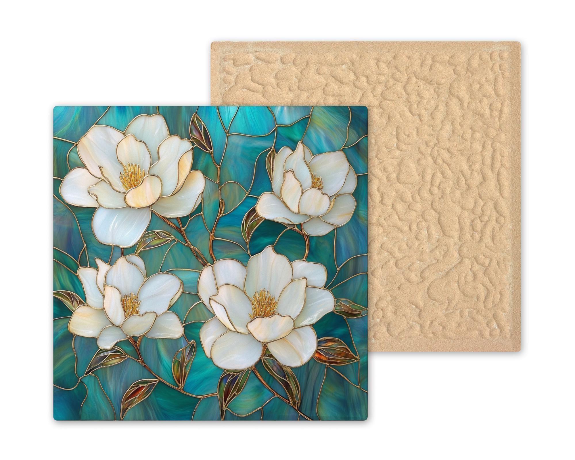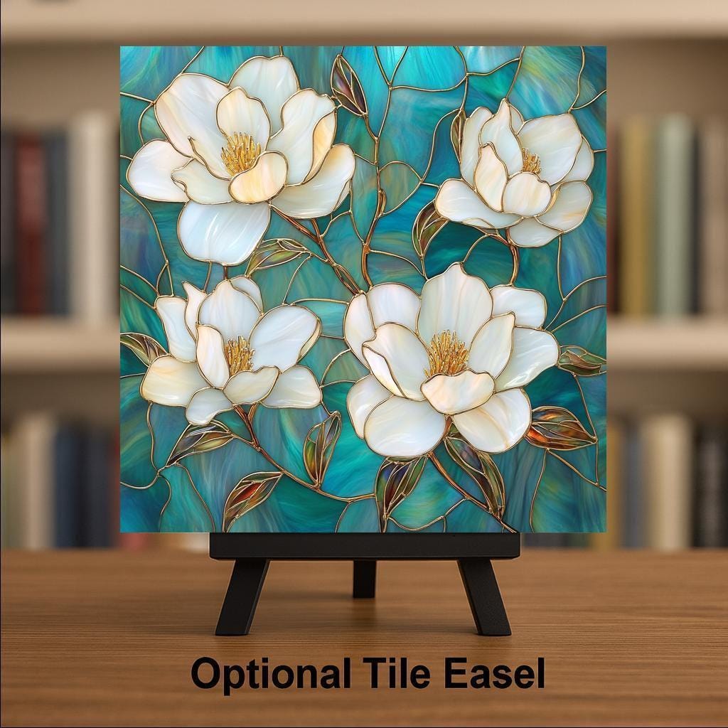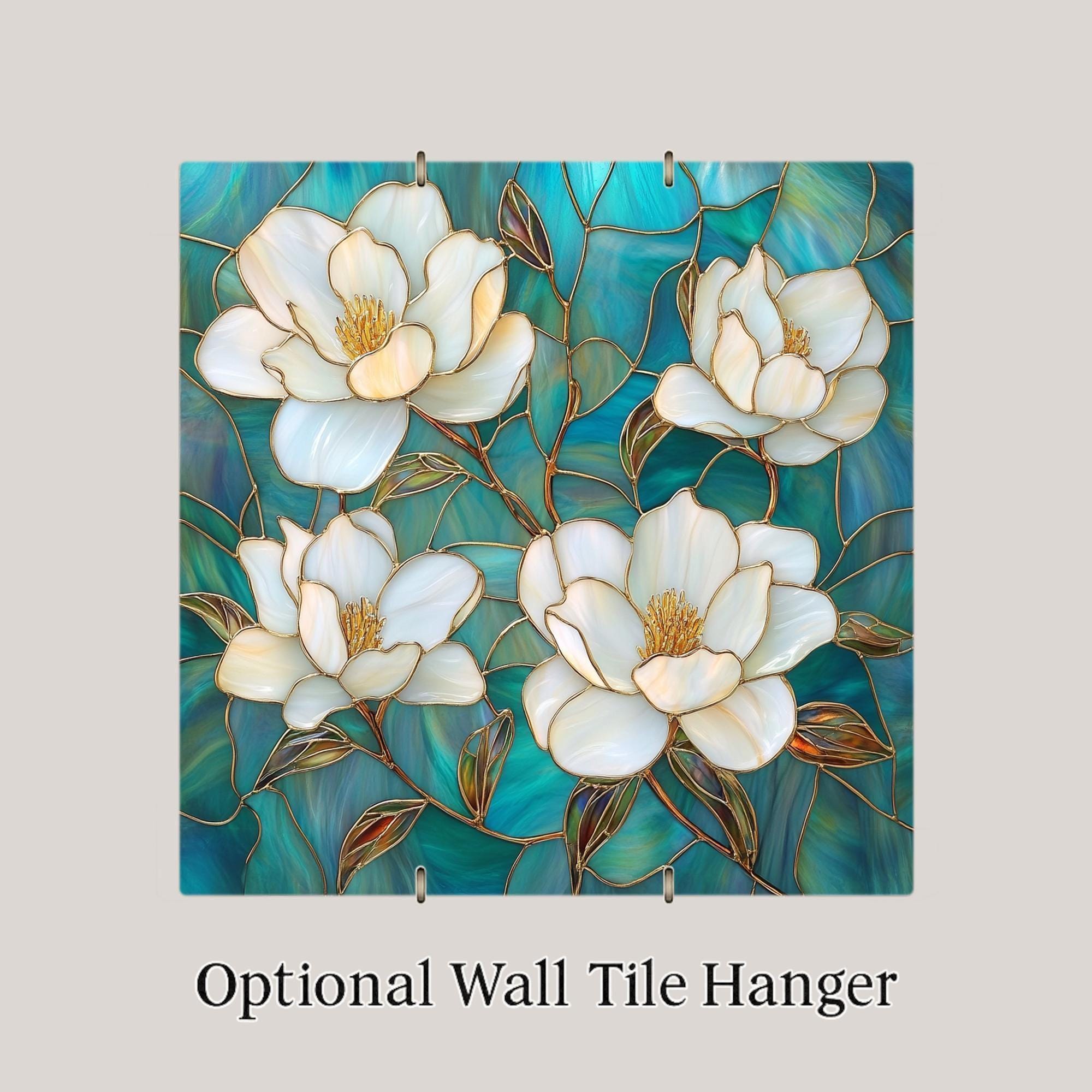 This handcrafted tile captures the beauty of magnolia flowers in a stained glass style, combining creamy white blooms, golden outlines, and a vibrant teal mosaic background. Its clean square format makes it ideal for use as accent wall art, kitchen or bathroom décor, or a standout piece on shelving. An excellent choice for nature lovers, floral enthusiasts, or those seeking a fresh botanical touch.