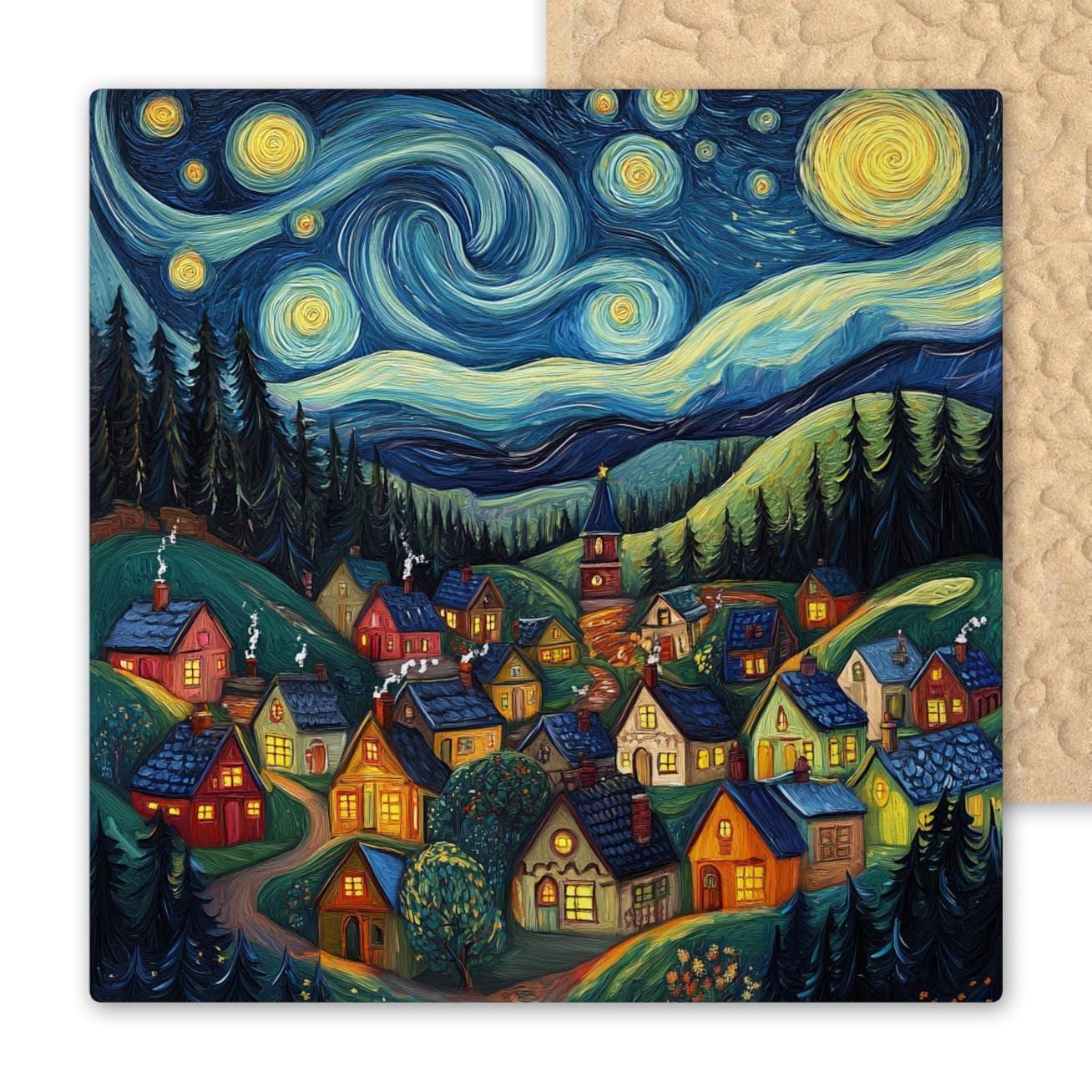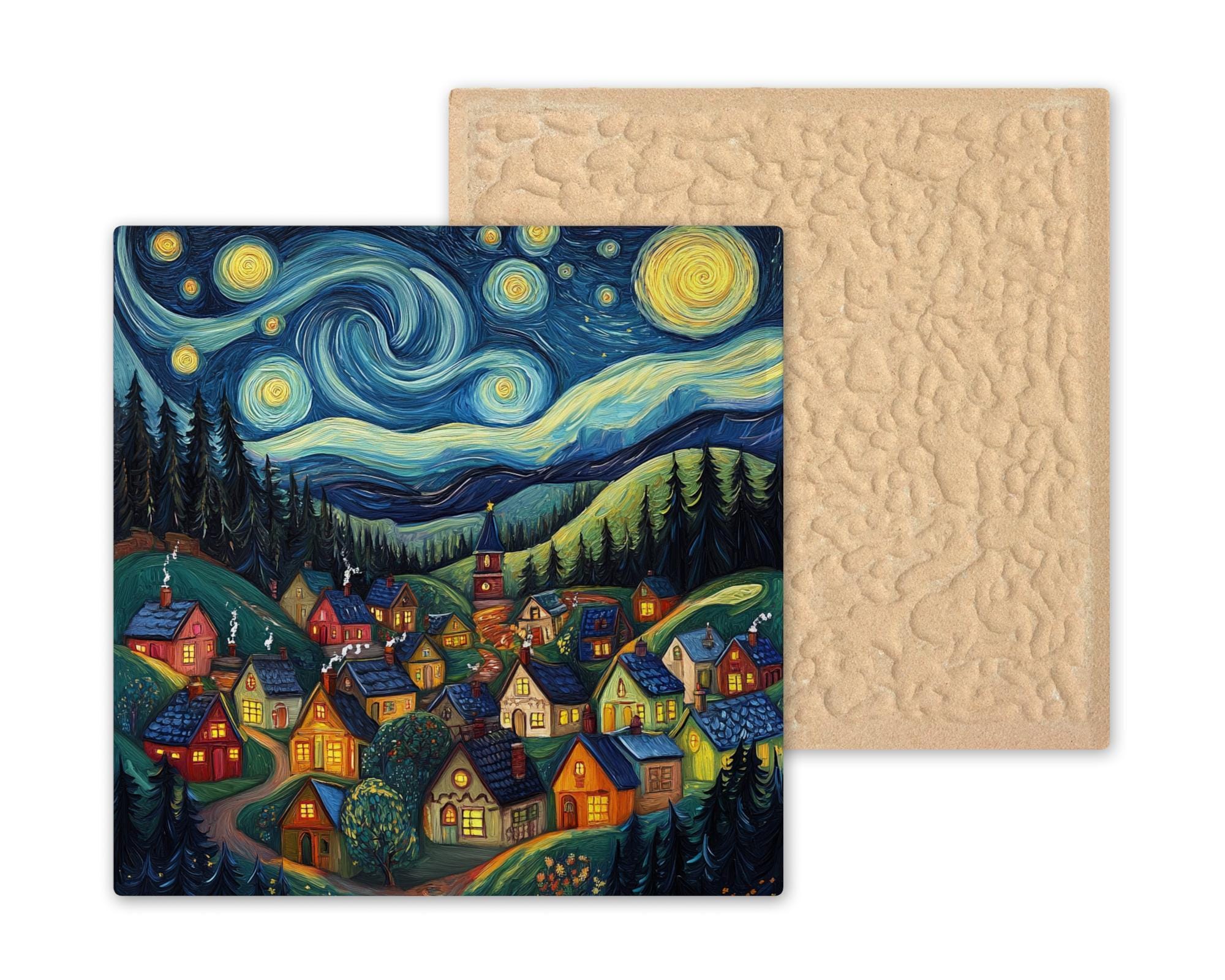 This Fantasy Starry Night Village Ceramic Tile transforms a sleepy hilltop town into a magical dreamscape beneath swirling stars and rolling night clouds. Inspired by Van Gogh's "Starry Night," this tile pairs iconic brushstroke skies with the warm glow of whimsical cottages, creating a cozy yet celestial scene.