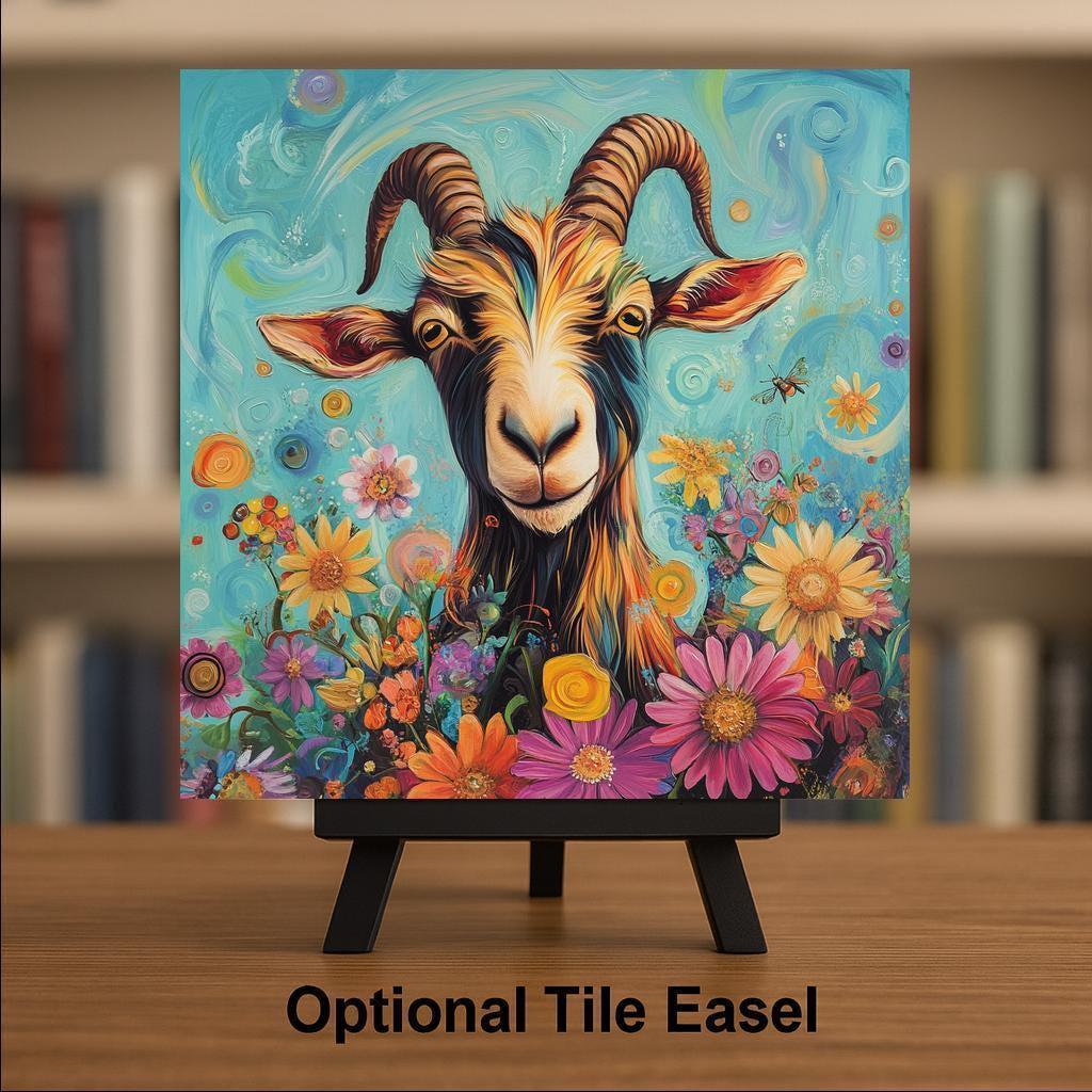 Step into a floral fantasy with this psychedelic goat ceramic tile. Full of whimsical charm, the tile features a colorfully illustrated goat surrounded by swirling blooms and cheerful spirals against a teal-blue sky. The goat’s playful expression and vibrant coloring make it a standout piece for eclectic walls, boho interiors, and folk-art-inspired homes.