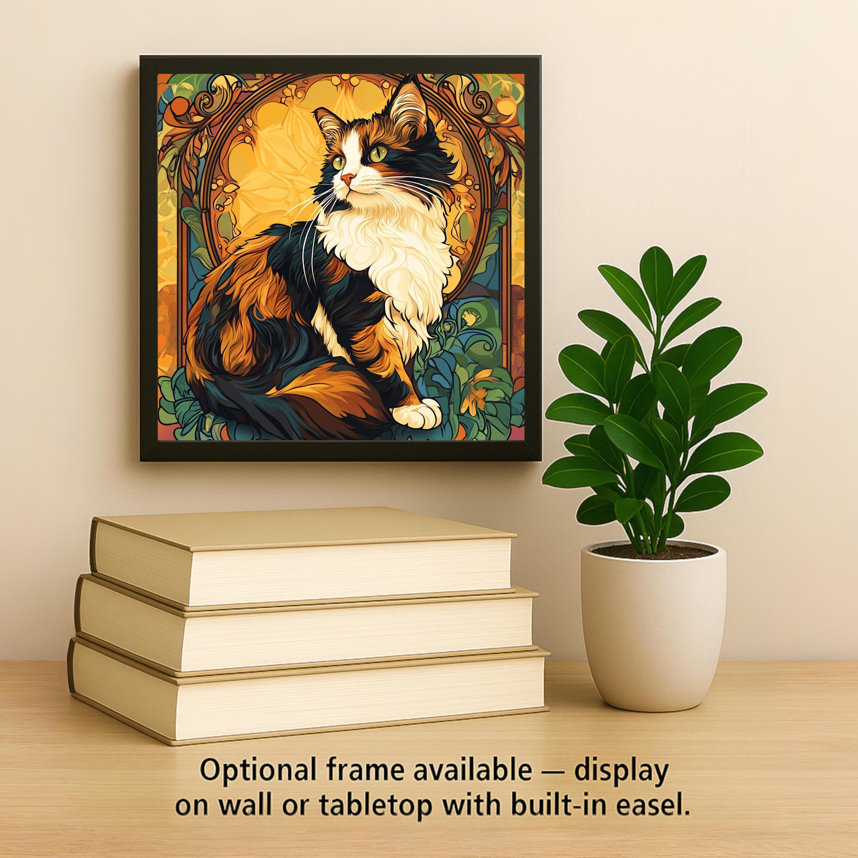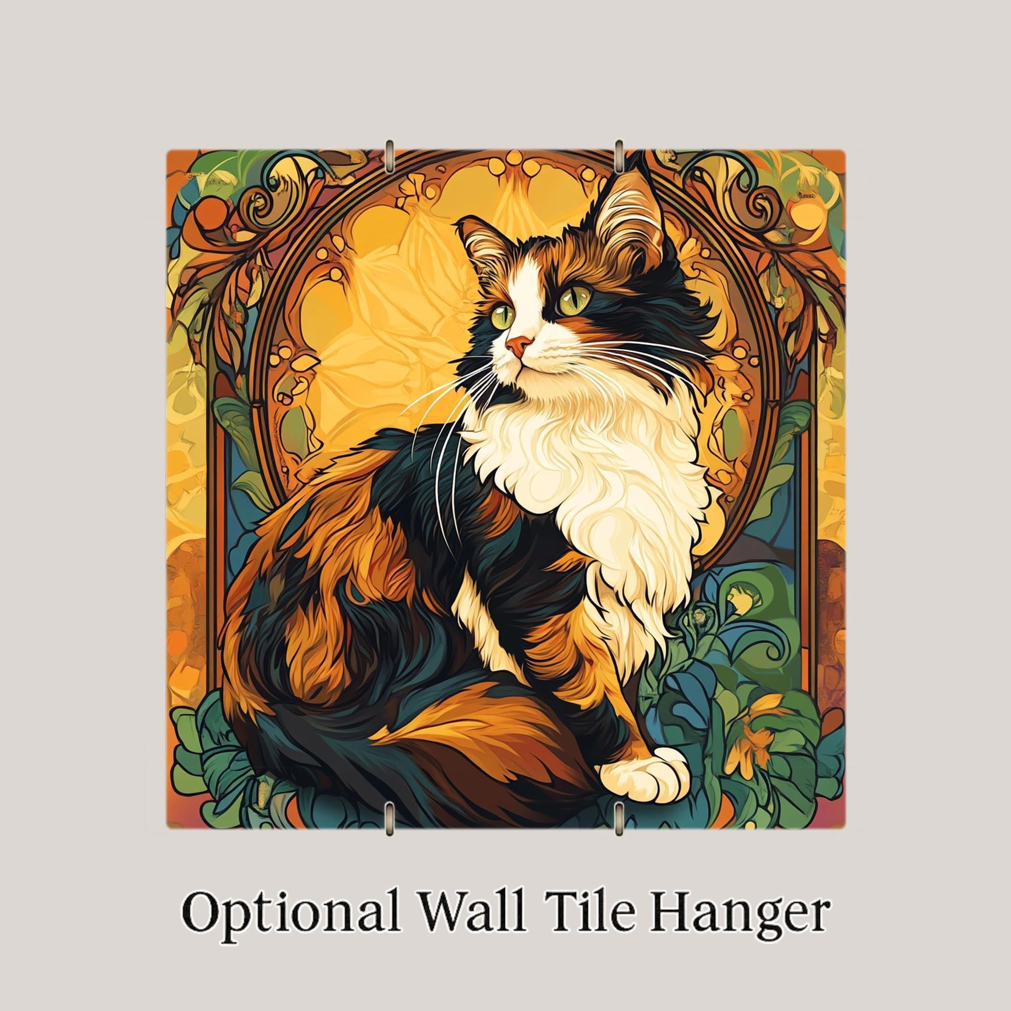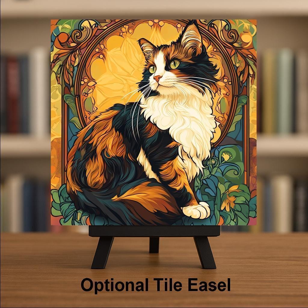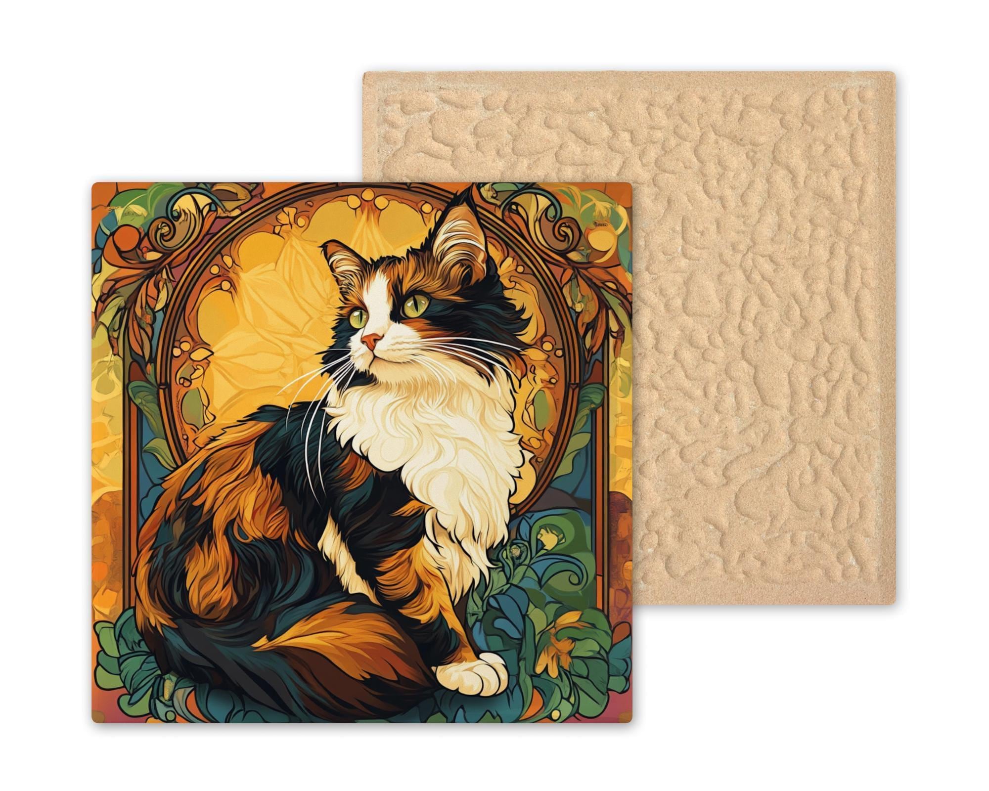 This Art Nouveau-style calico cat ceramic tile is a tribute to feline beauty and vintage charm. With sweeping lines, warm amber tones, and floral framework inspired by the golden age of decorative art, it brings timeless elegance to any space. The calico cat sits poised and confident, its vibrant fur patterns complemented by detailed linework and earthy botanical motifs. Perfect for those who love cats, Art Nouveau design, or handcrafted gifts with personality.
