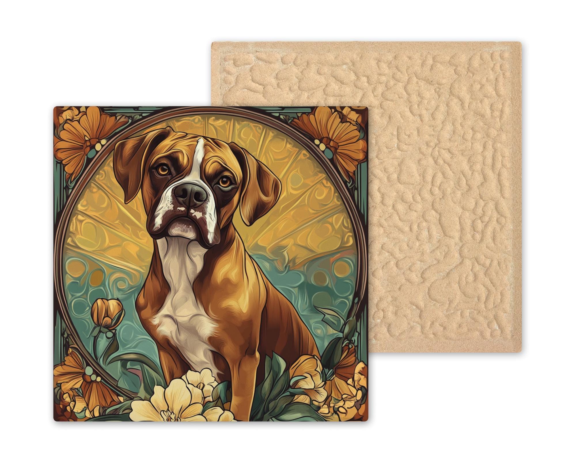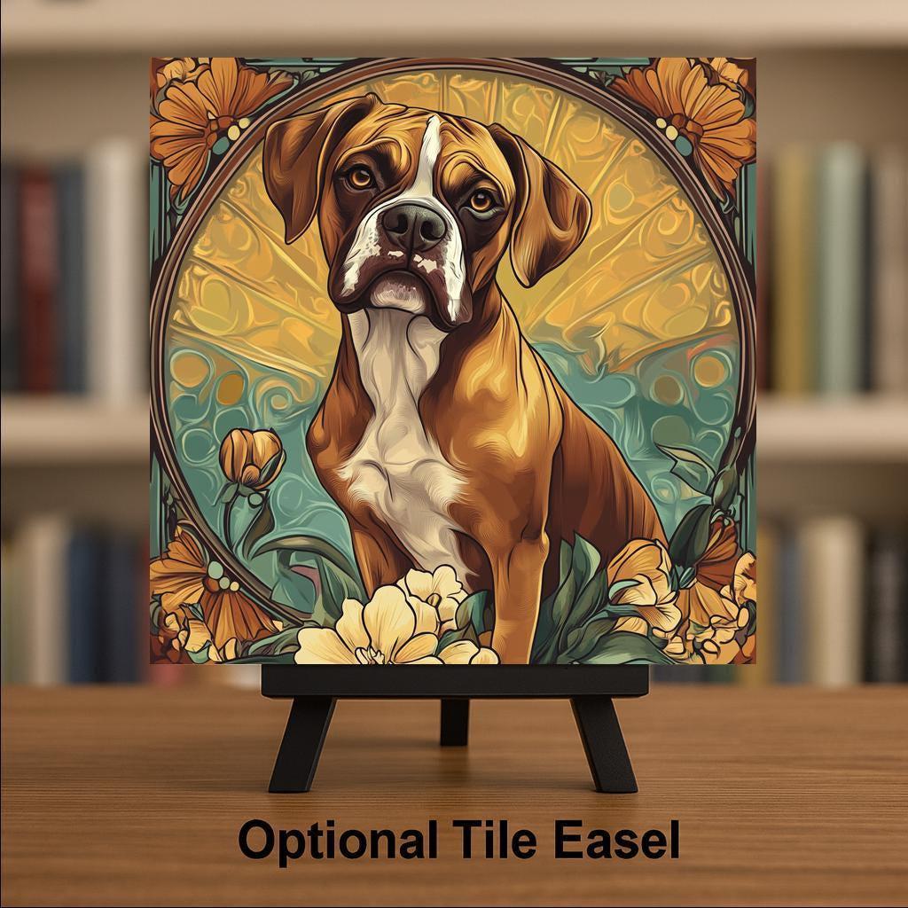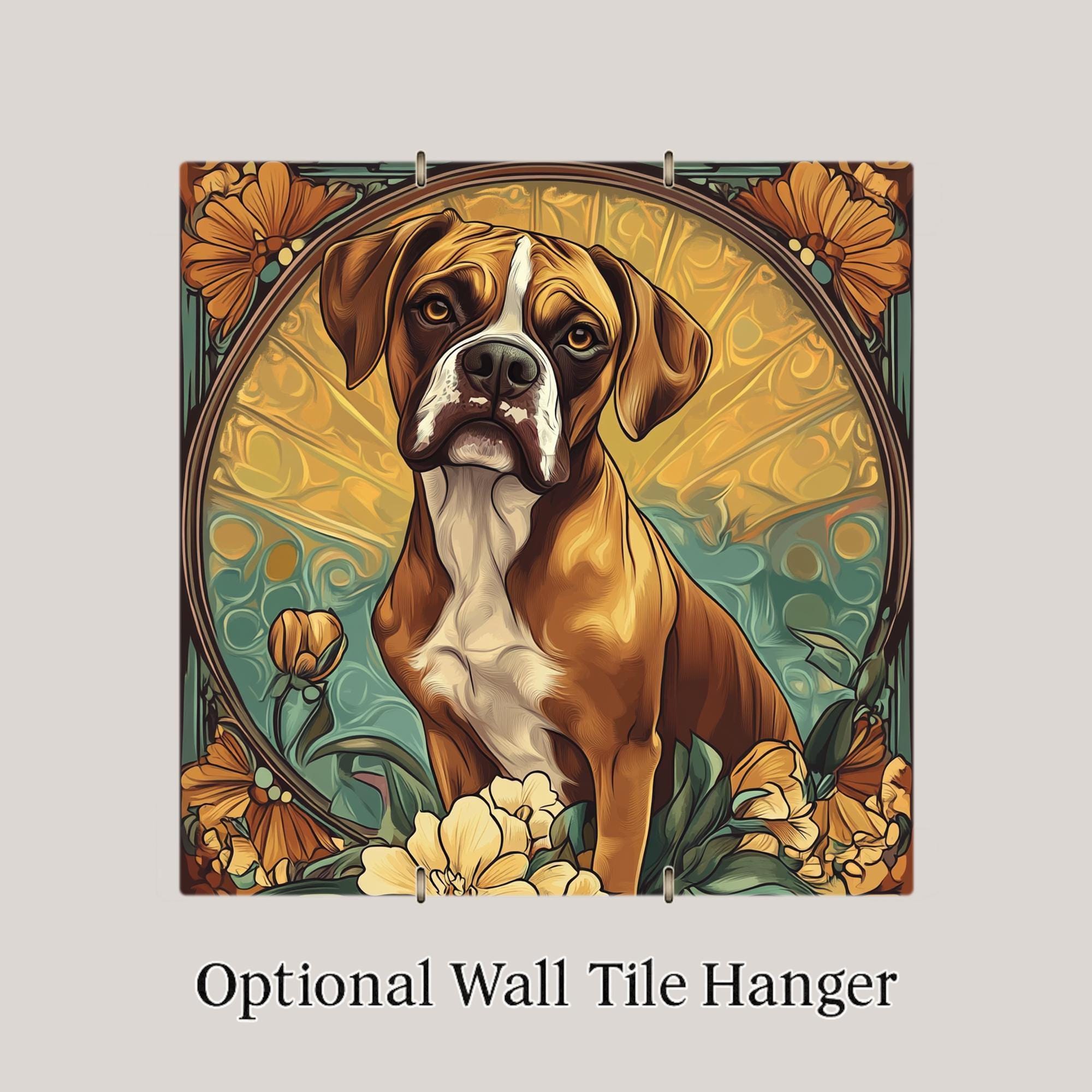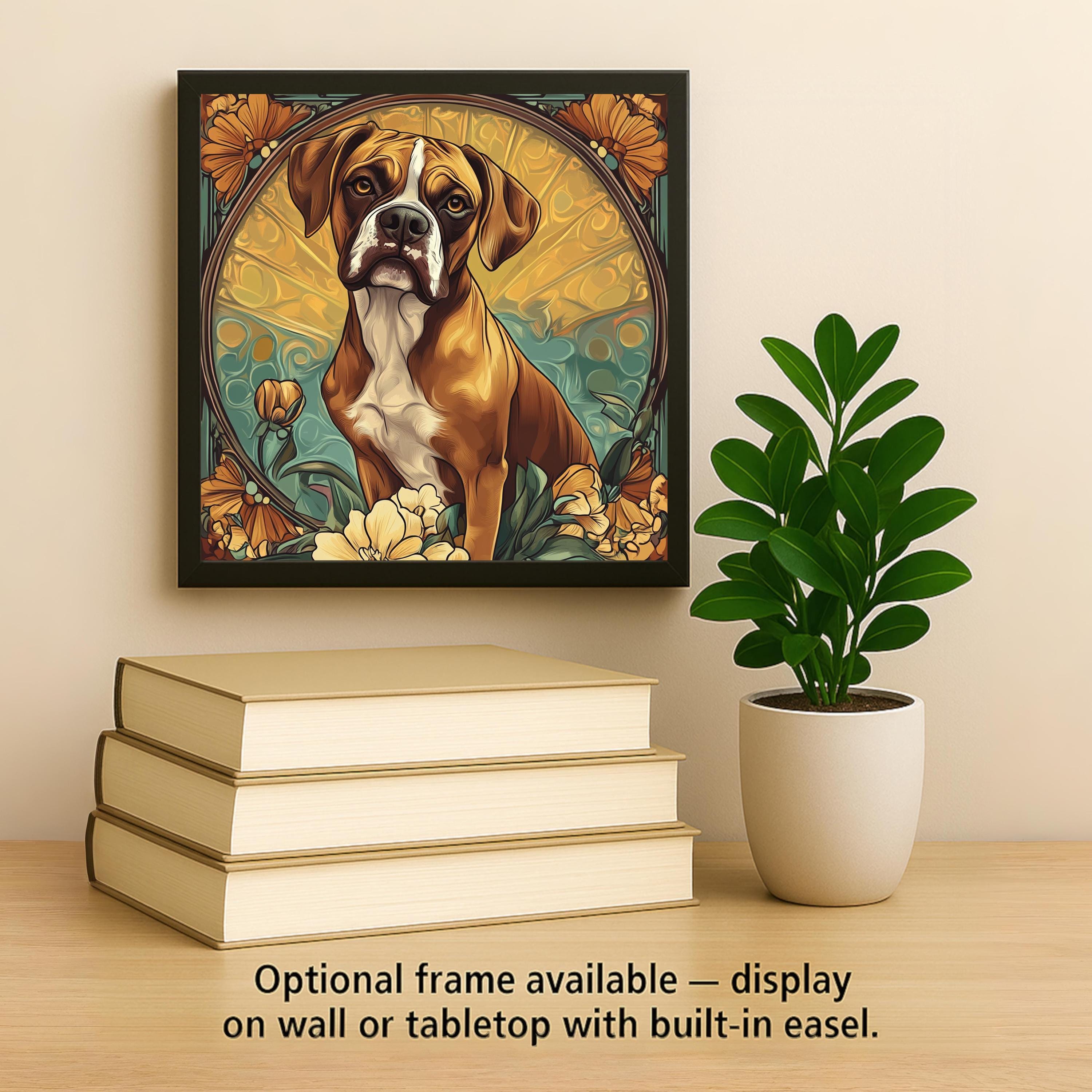 The warm sunburst background creates a radiant focal point while the surrounding botanical elements frame the Boxer in a balanced and elegant Art Nouveau composition. The soft floral palette and flowing lines give the piece a timeless decorative feel that blends beautifully with many interior styles.