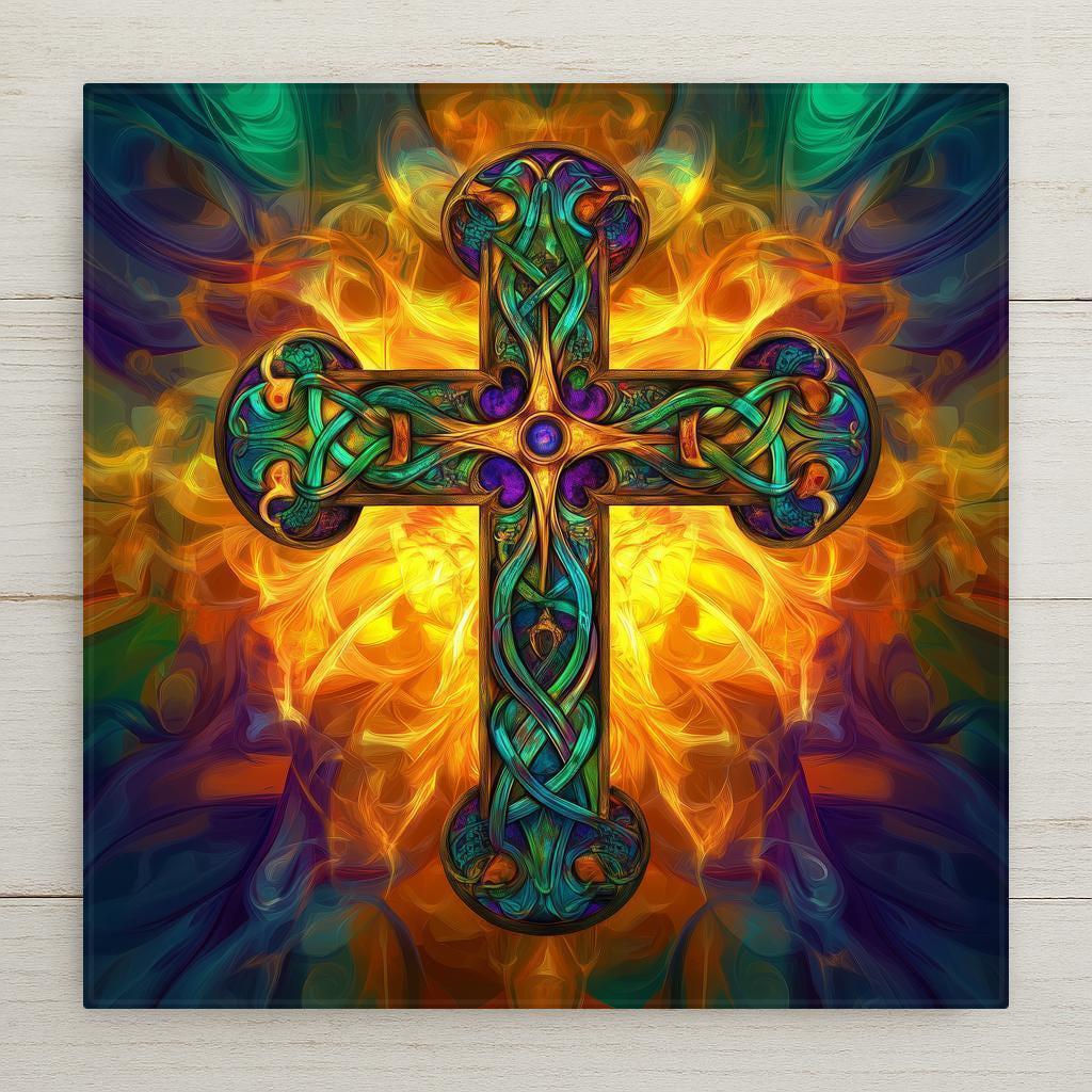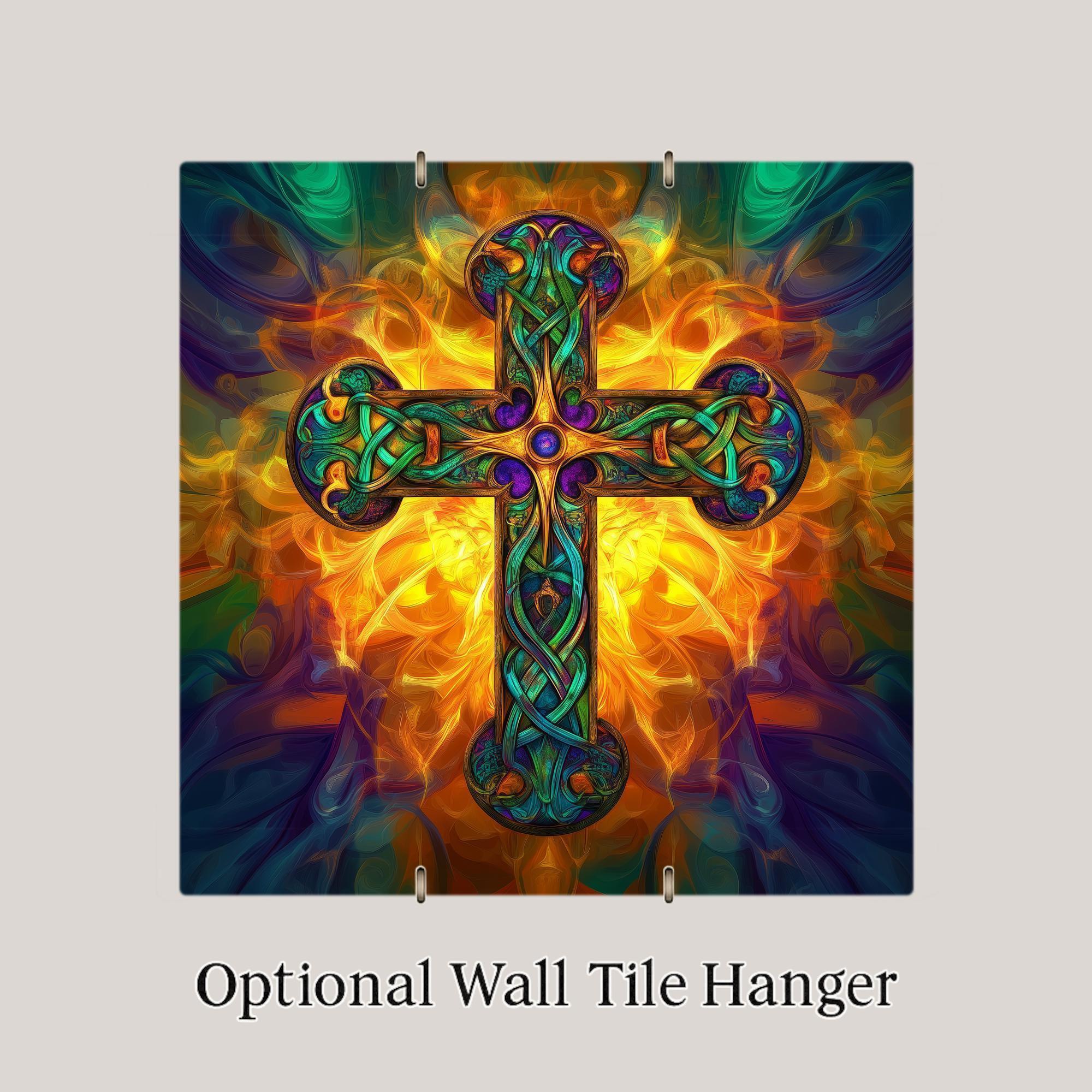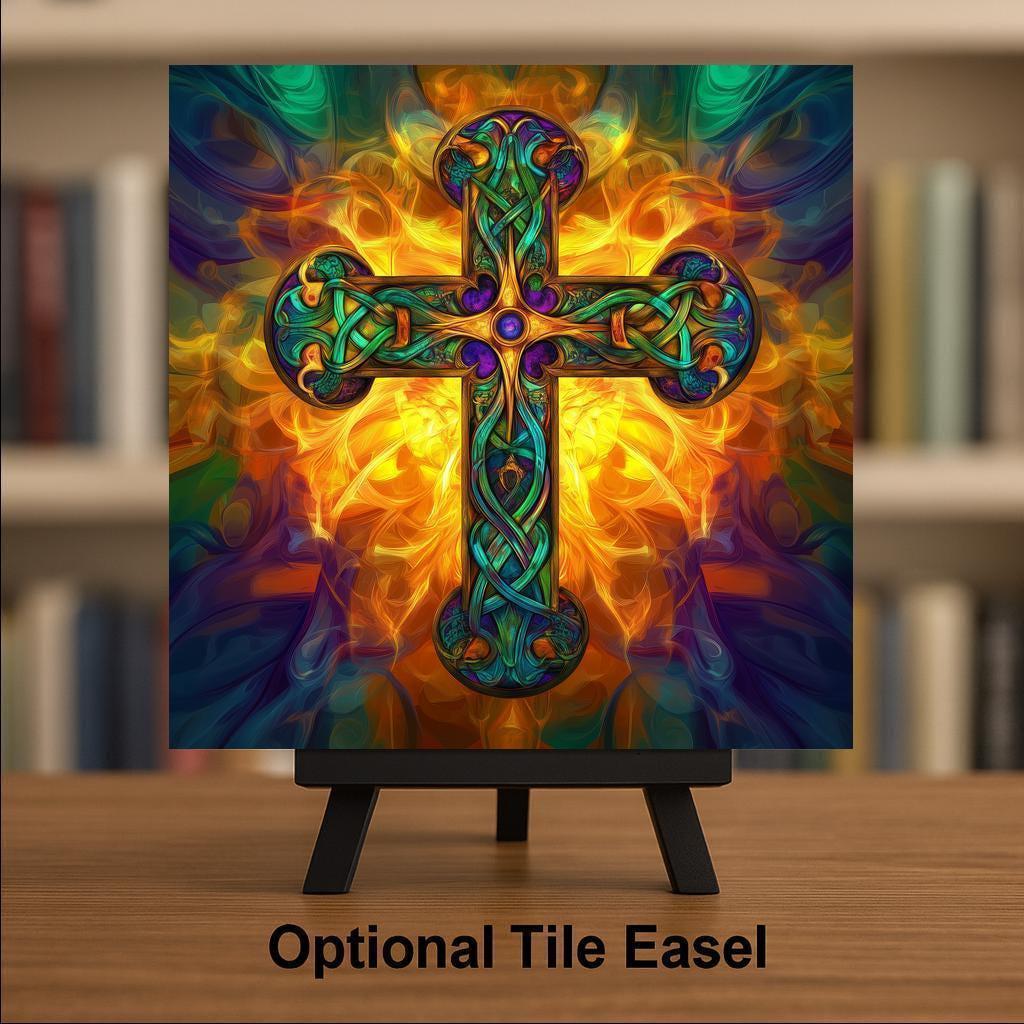 Celebrate Irish tradition and Christian faith with this stunning Fiery Celtic Cross ceramic tile. Designed with vibrant knotwork details in rich jewel tones, the cross radiates from a glowing sunburst background, symbolizing divine light and eternal strength. The stained glass-inspired style adds a dramatic visual effect, making this tile a beautiful spiritual accent for your home.