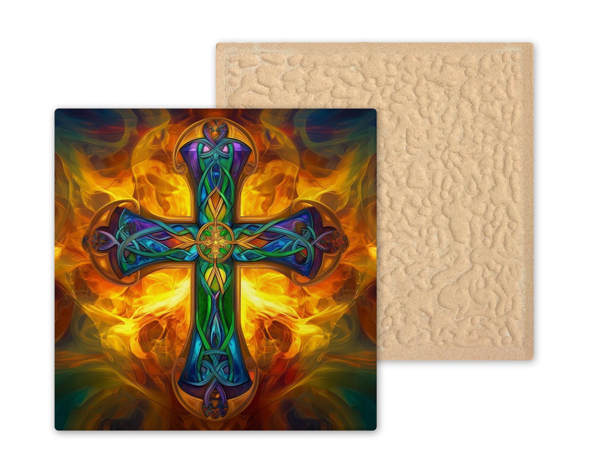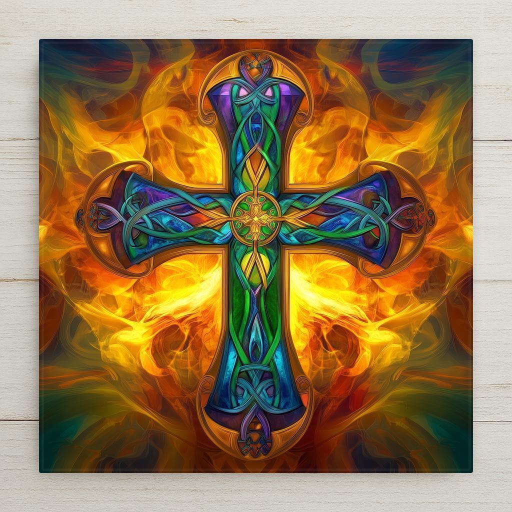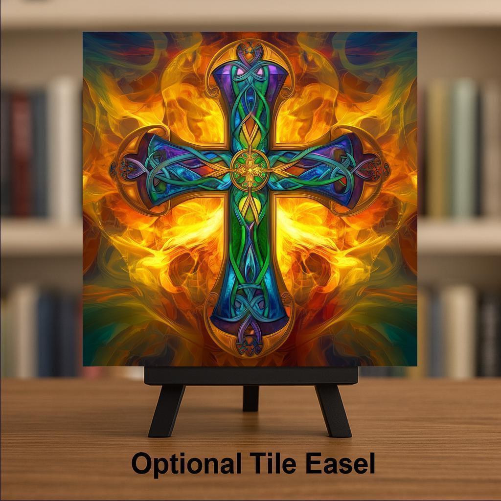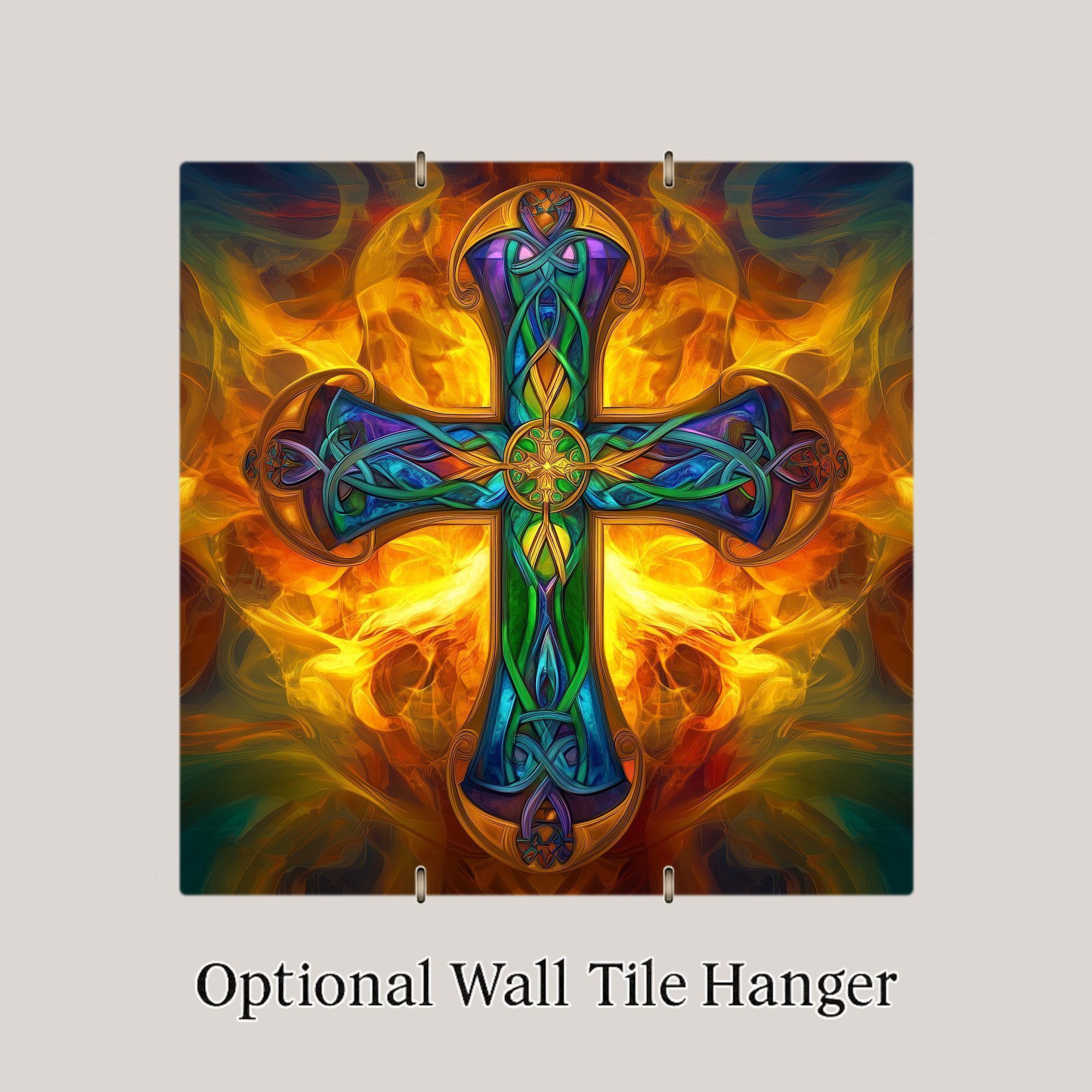 The intricate knotwork reflects themes of eternal life, divine protection, and spiritual strength. Whether you place it in a quiet corner for meditation or showcase it as a conversation piece in your living room, this tile brings powerful visual energy. The vivid cross glows with inner light, making it a stunning addition to Christian and Celtic-themed decor.
