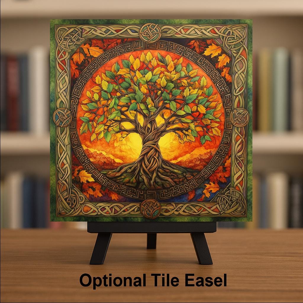 Invite strength, balance, and Celtic symbolism into your home with this Tree of Life Ceramic Tile Wall Art. Showcasing a majestic tree surrounded by intertwining knotwork and autumn leaves, this design evokes the spiritual connection between earth, sky, and self. The rich sunset backdrop and vibrant foliage represent the sacred turning of the seasons and the eternal cycle of renewal.