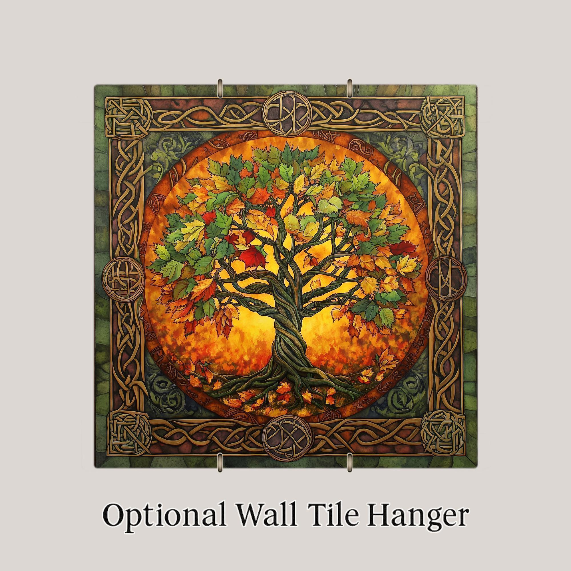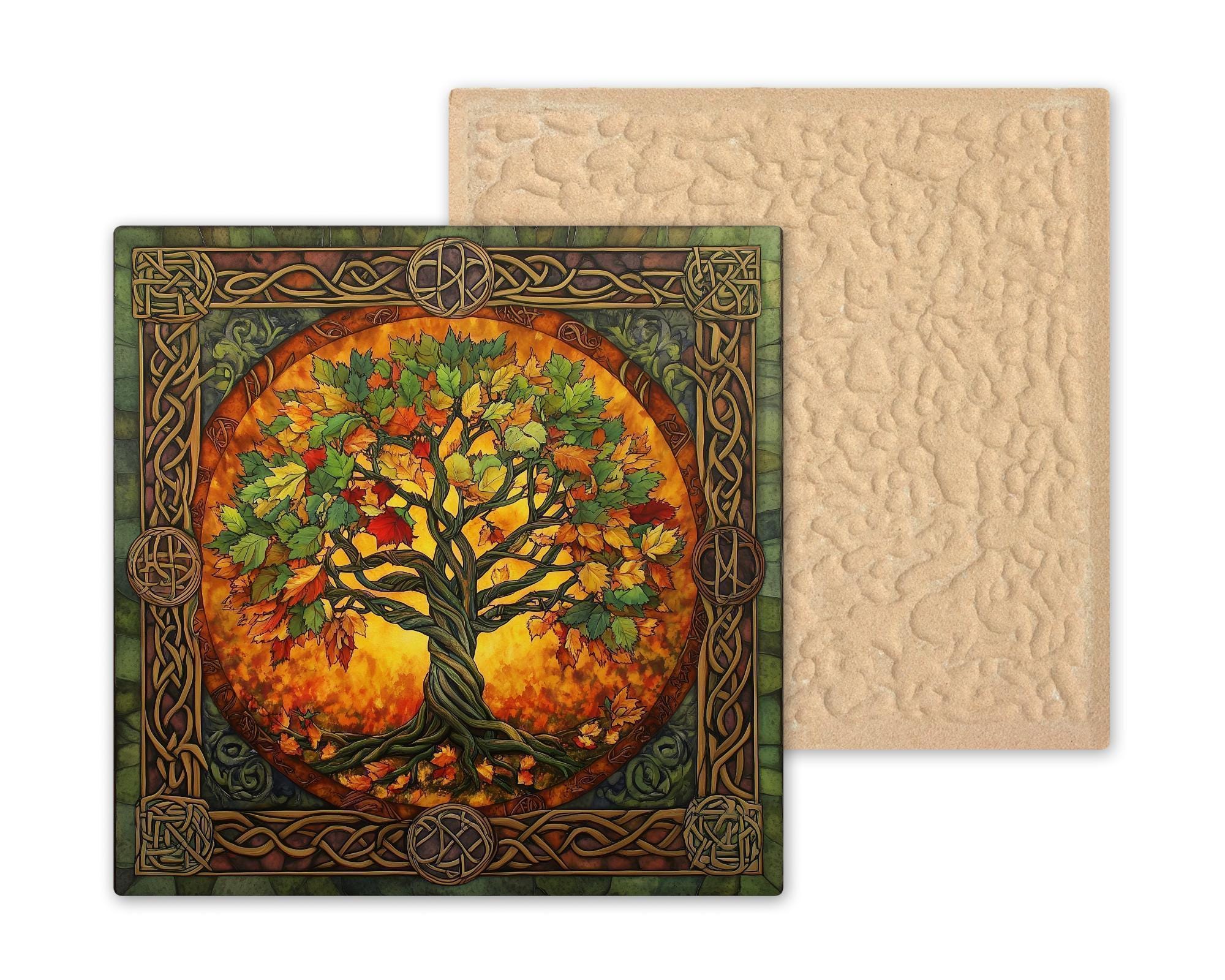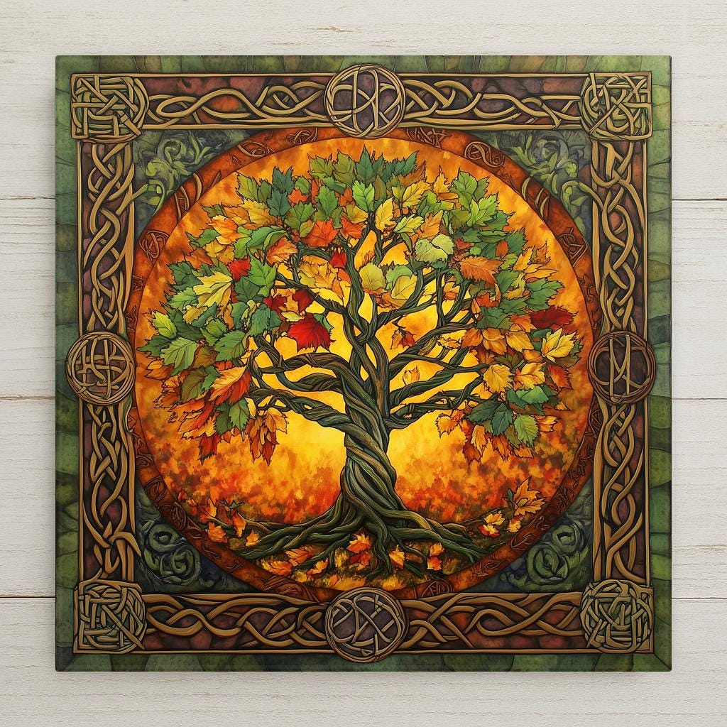 Rooted in ancient symbolism and wrapped in autumnal warmth, this Celtic Tree of Life Ceramic Tile offers a beautiful expression of the sacred connection between Earth and spirit. Inspired by Celtic art and pagan tradition, the tree’s twisting limbs and roots echo eternal cycles, surrounded by glowing fall foliage and framed in elaborate knotwork reminiscent of Greenman energy and Druidic lore.
