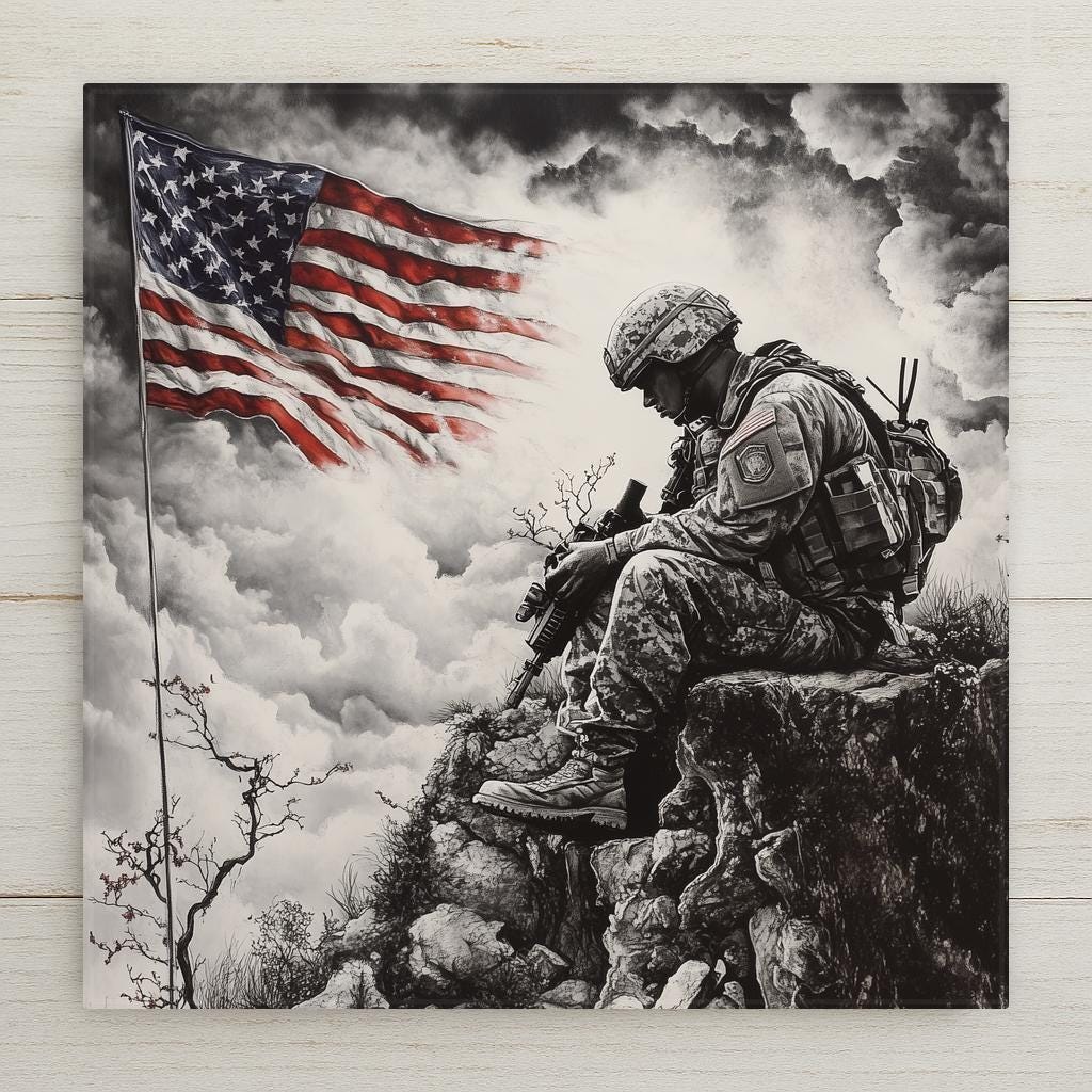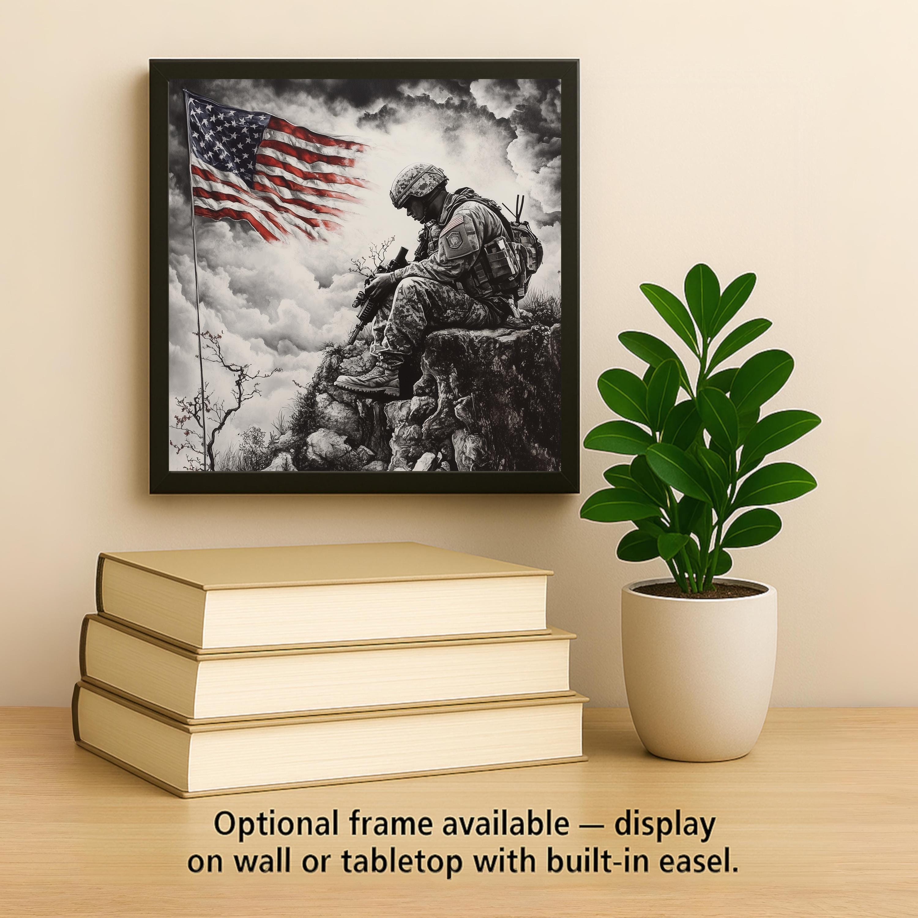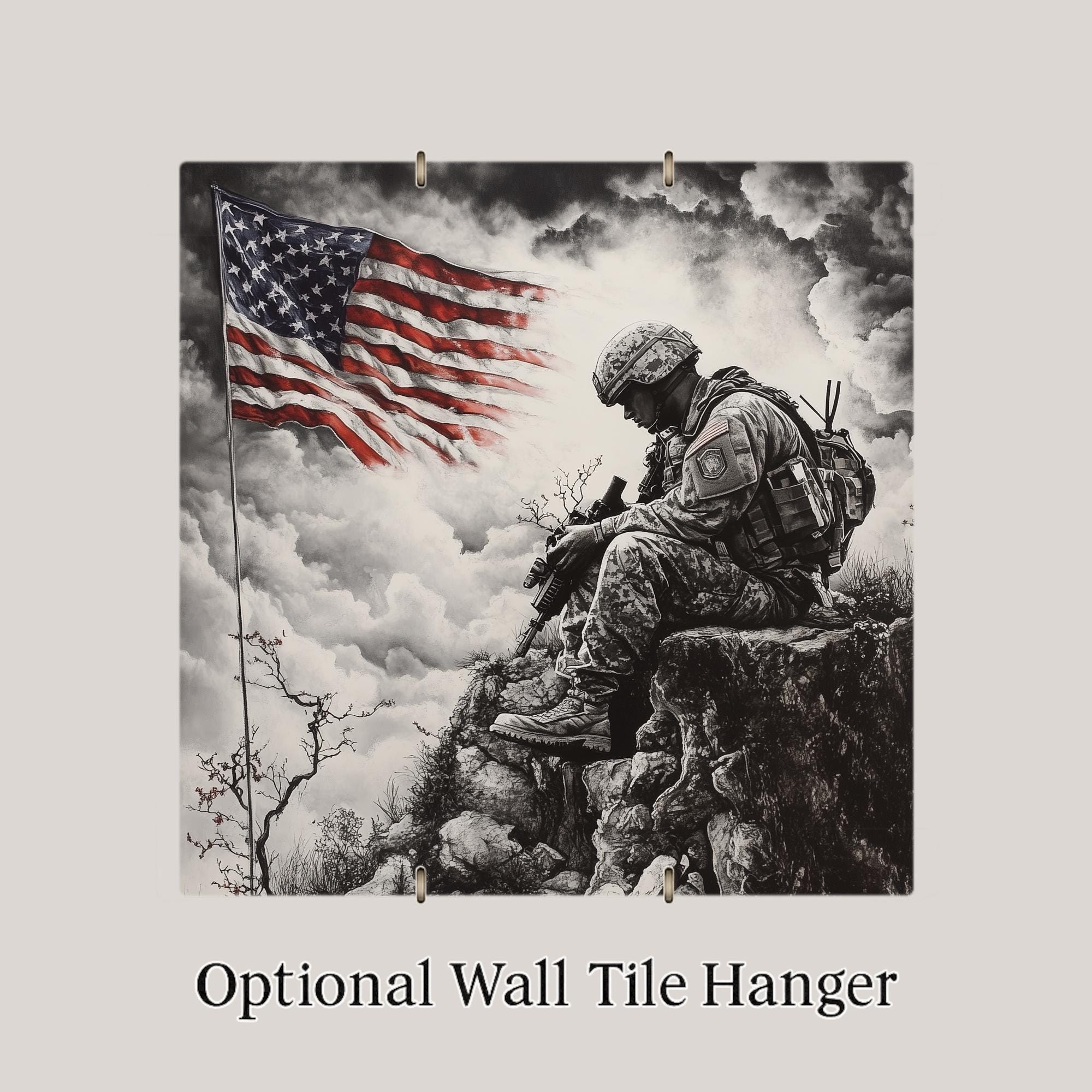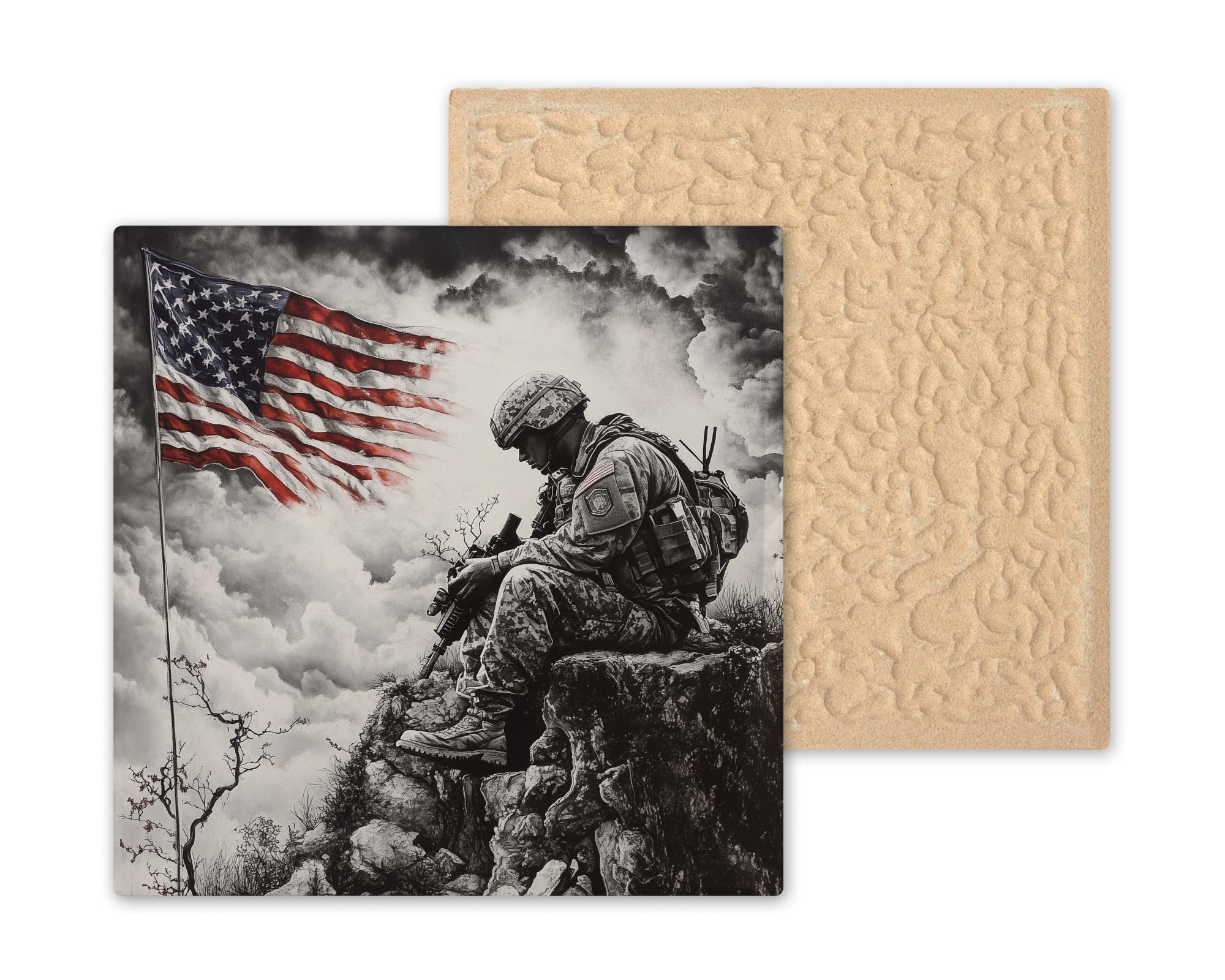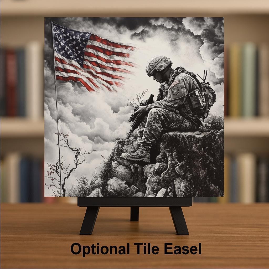 This ceramic tile pays solemn tribute to the brave. With a grayscale depiction of a soldier bowed in reflection beneath a bold American flag, the image evokes honor, duty, and sacrifice. It’s a perfect piece for those who want to memorialize a loved one or express patriotic gratitude through home decor.