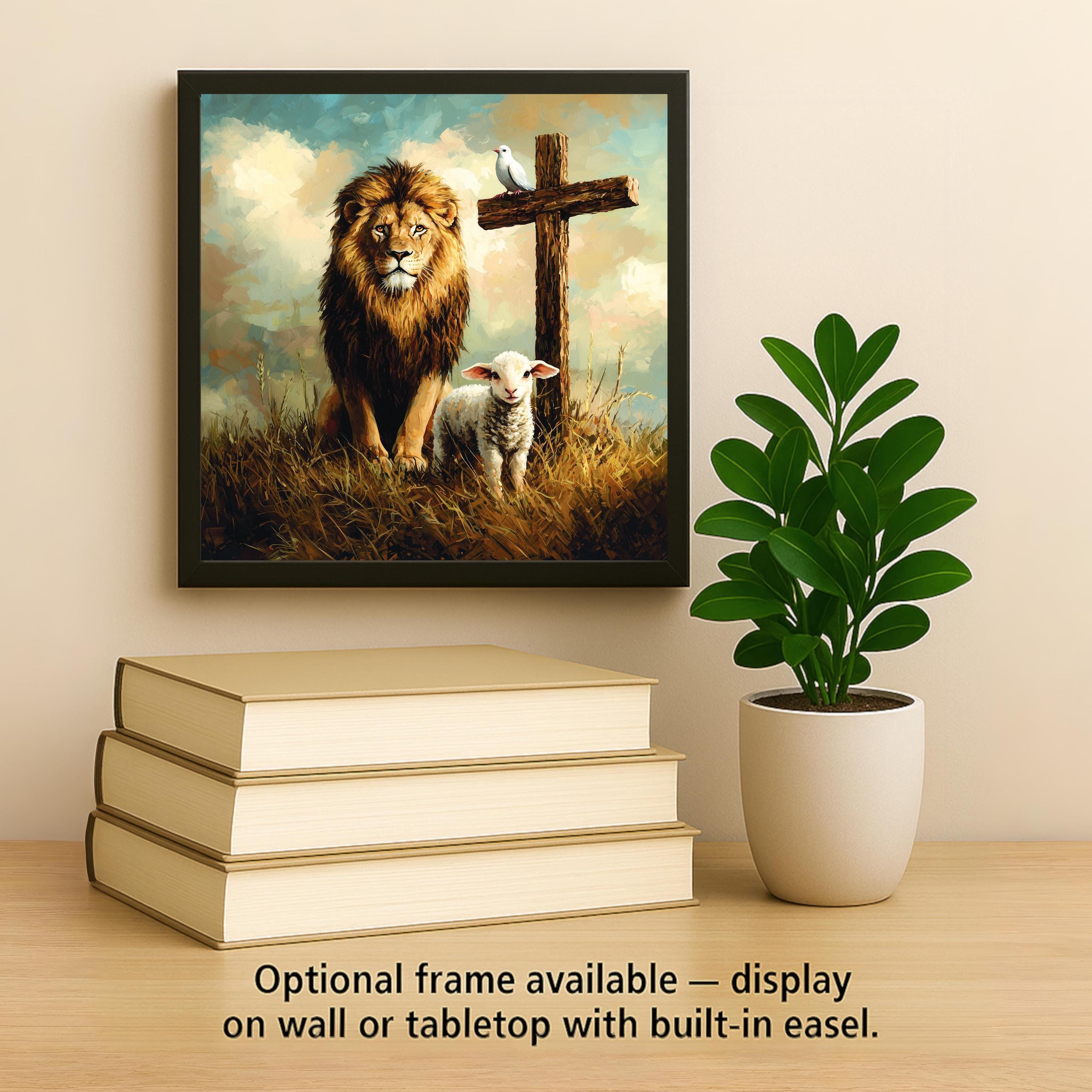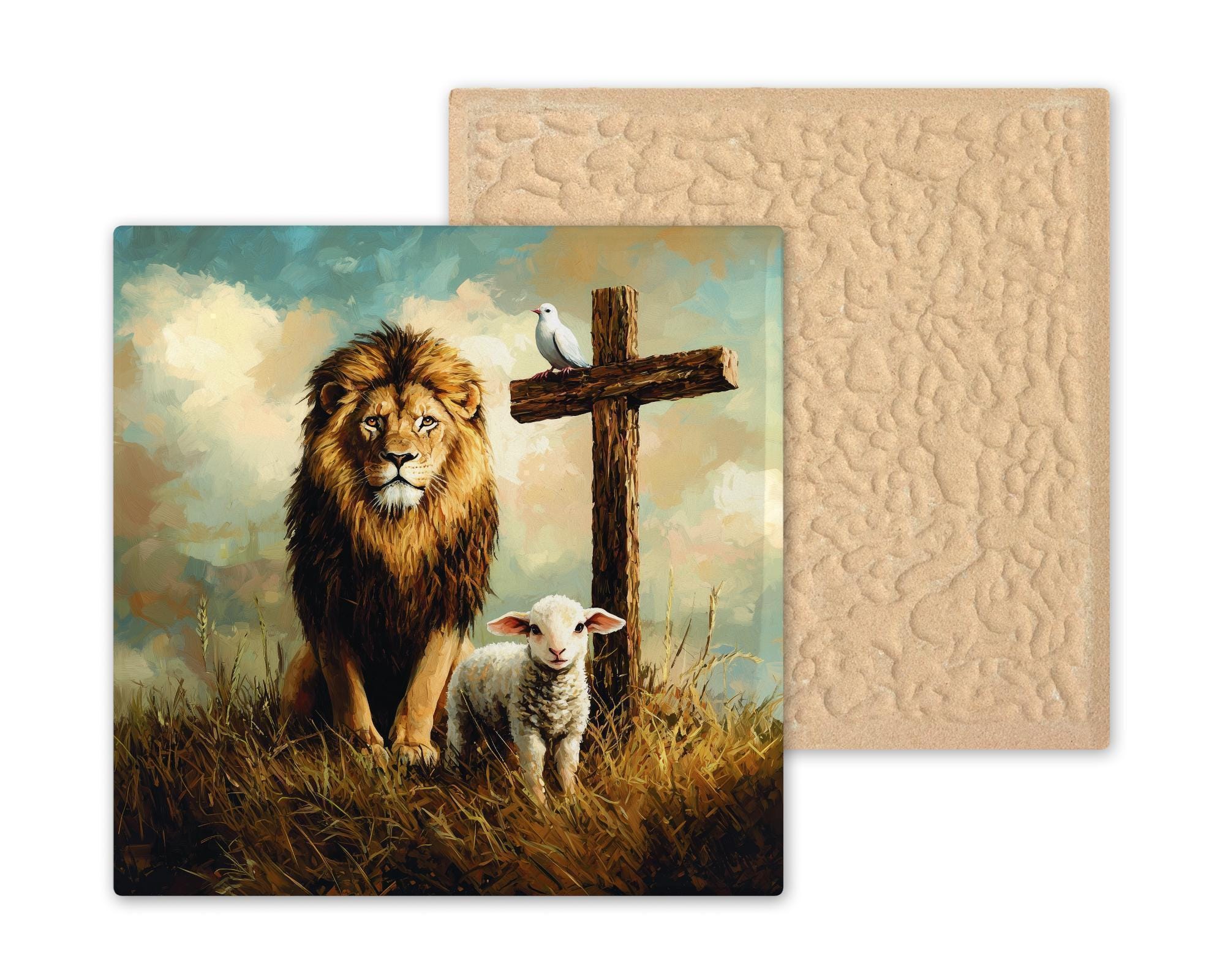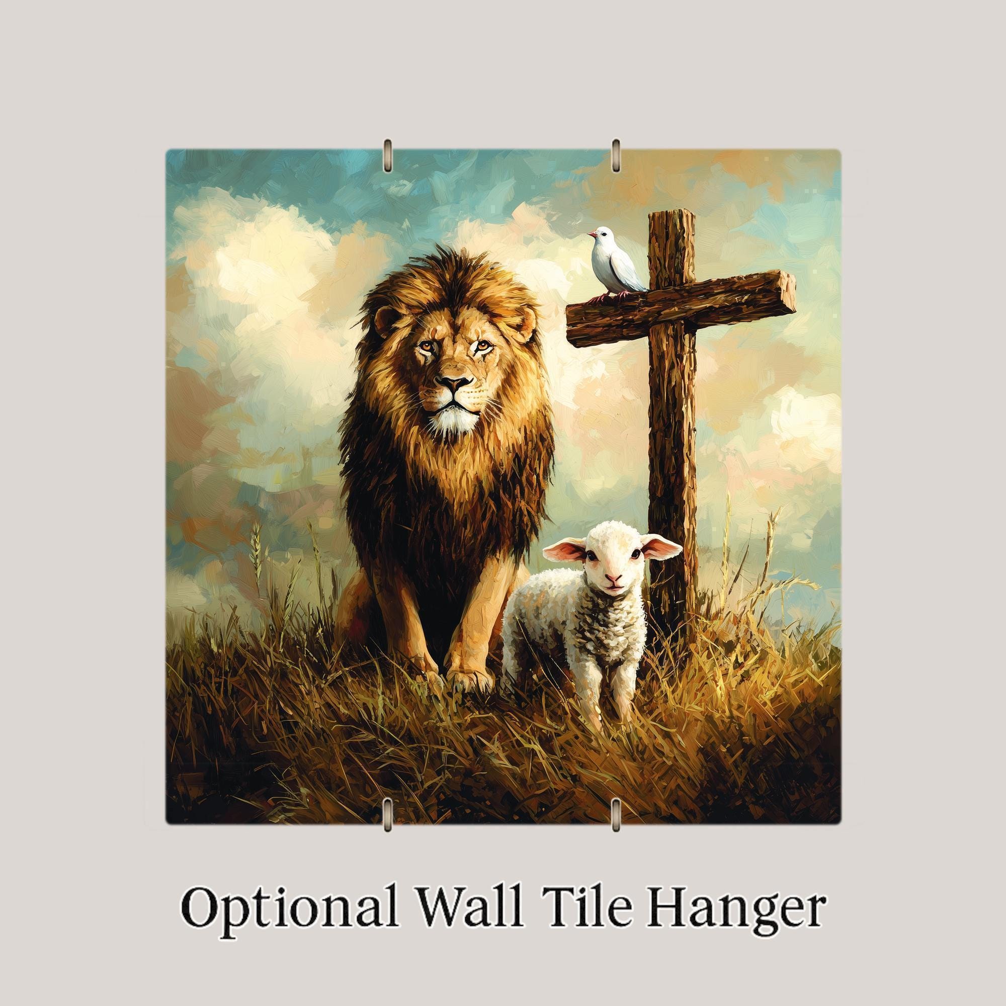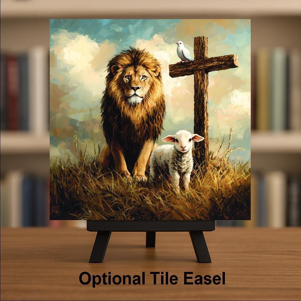 For easy display, choose a tile wall hanger for hanging, an easel tile stand for shelves or altars, or cork backing for tabletop stability. Whether gifted in celebration or used as a daily reminder of God’s promises, this lion and lamb tile brings faith to life through beautiful design.