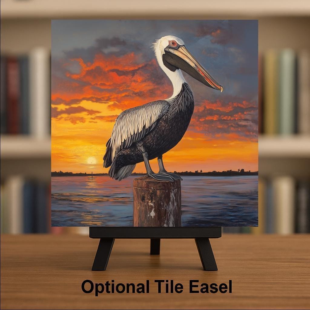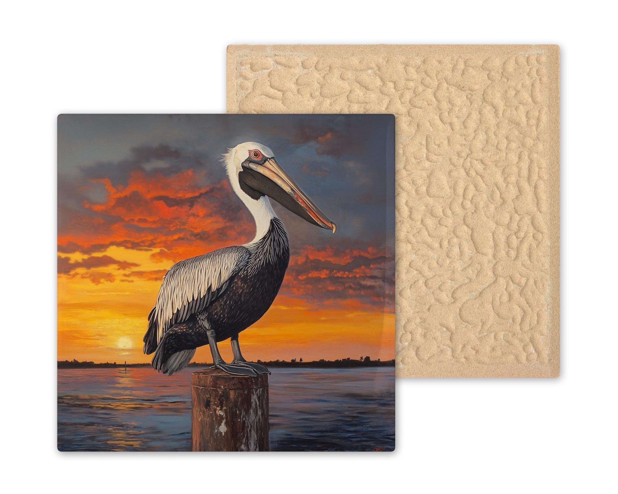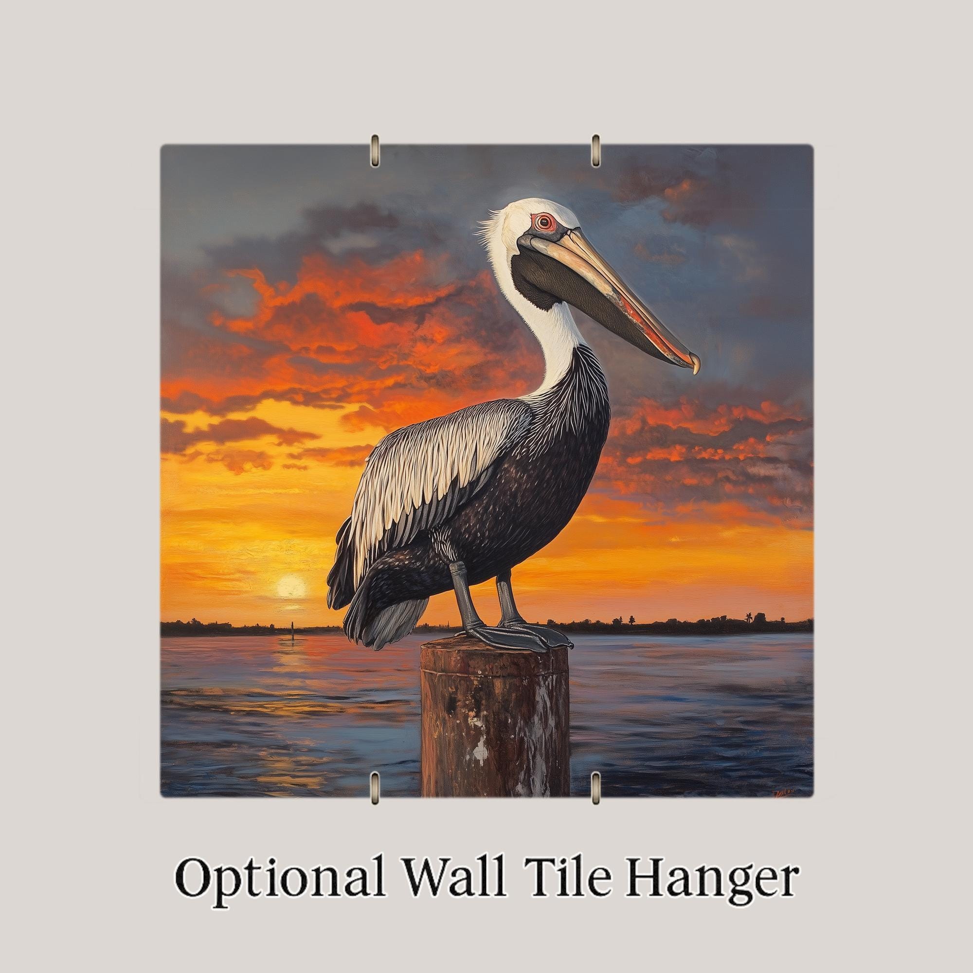Watch the sun set over the water with this stunning coastal pelican ceramic tile. A majestic pelican perches proudly on a wooden piling, framed by a glowing sky of orange, amber, and dusky blue. The calm water below reflects the fading light, creating a peaceful, beachy scene full of mood and warmth.