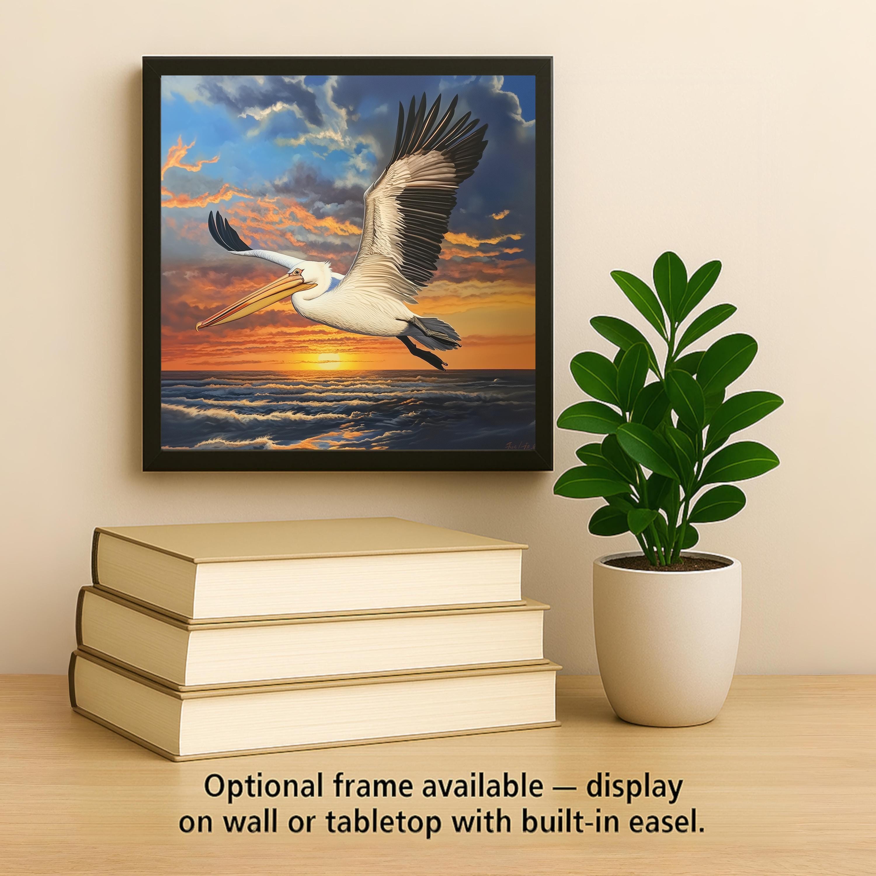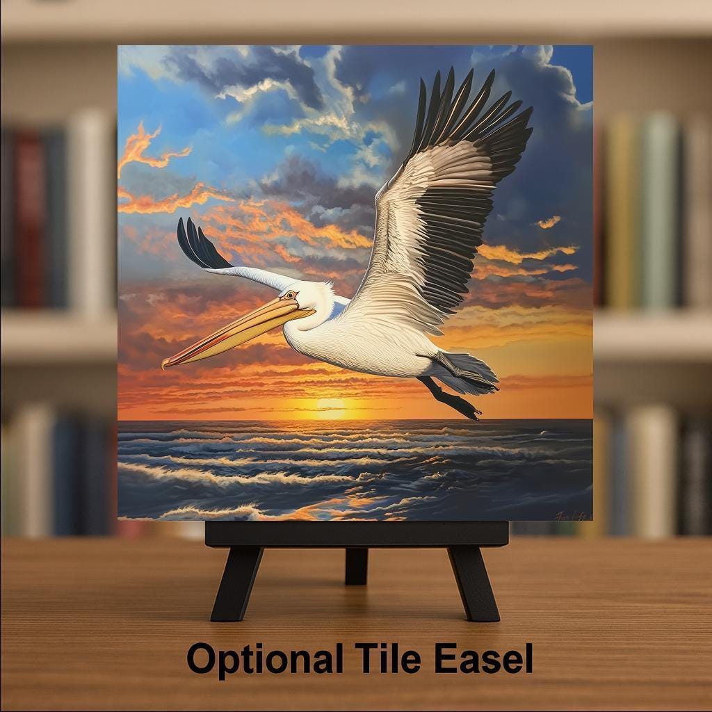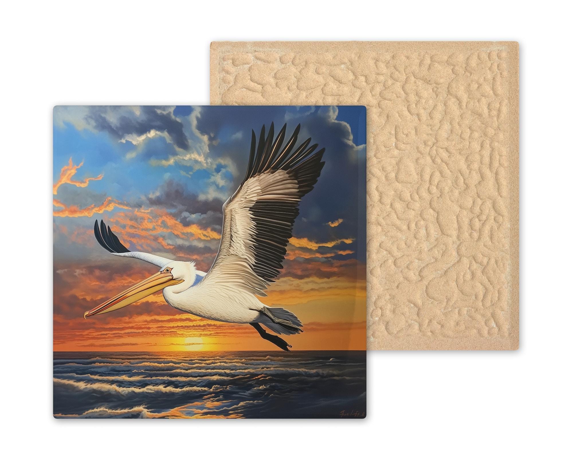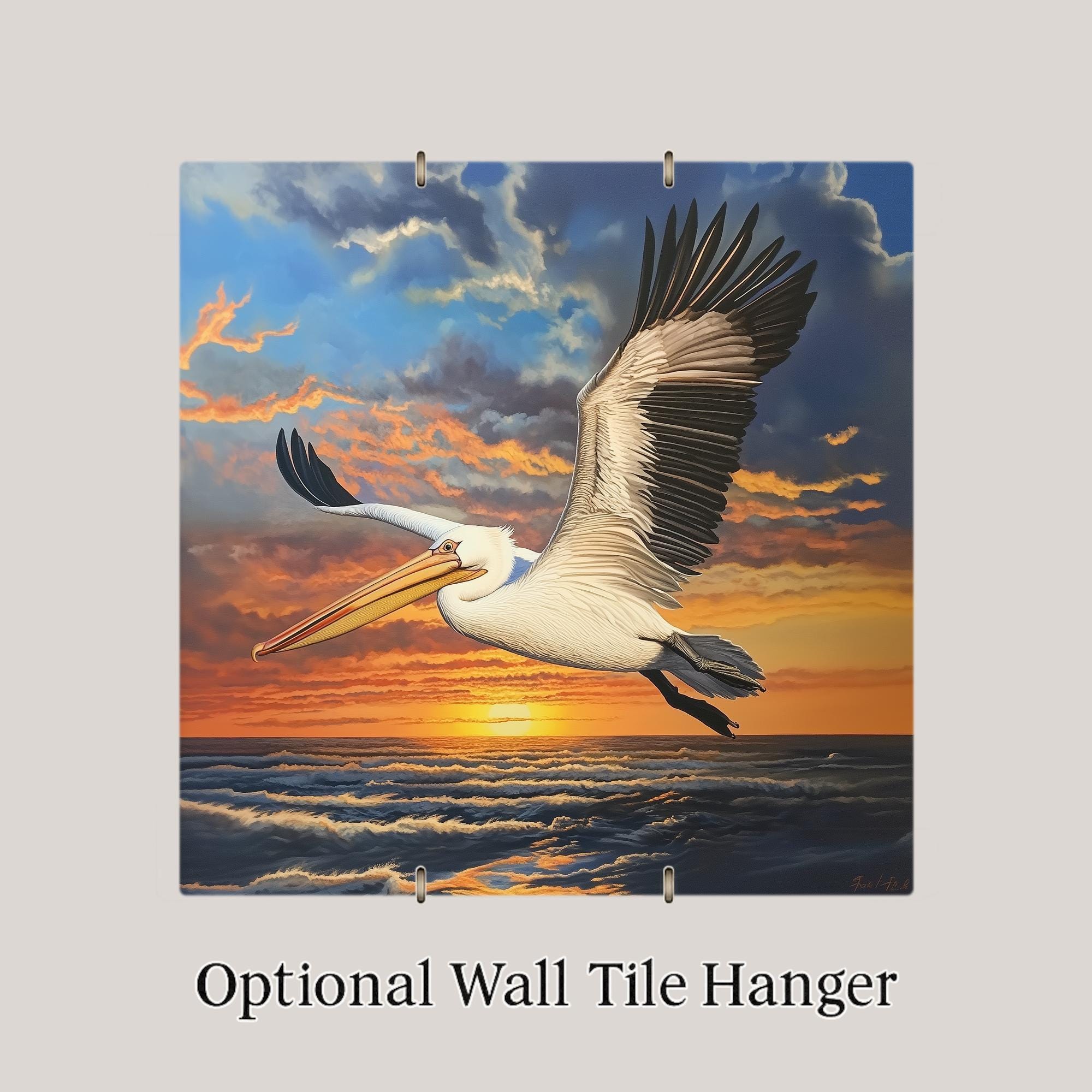 Celebrate coastal beauty with this stunning pelican tile wall art, showcasing a soaring bird over waves at sunset. The detailed illustration highlights the pelican’s bold wingspan, curved beak, and graceful movement, all set against a vivid horizon of orange, gold, and deep blue tones. The ocean glows beneath him, creating a dynamic scene filled with peace and power.