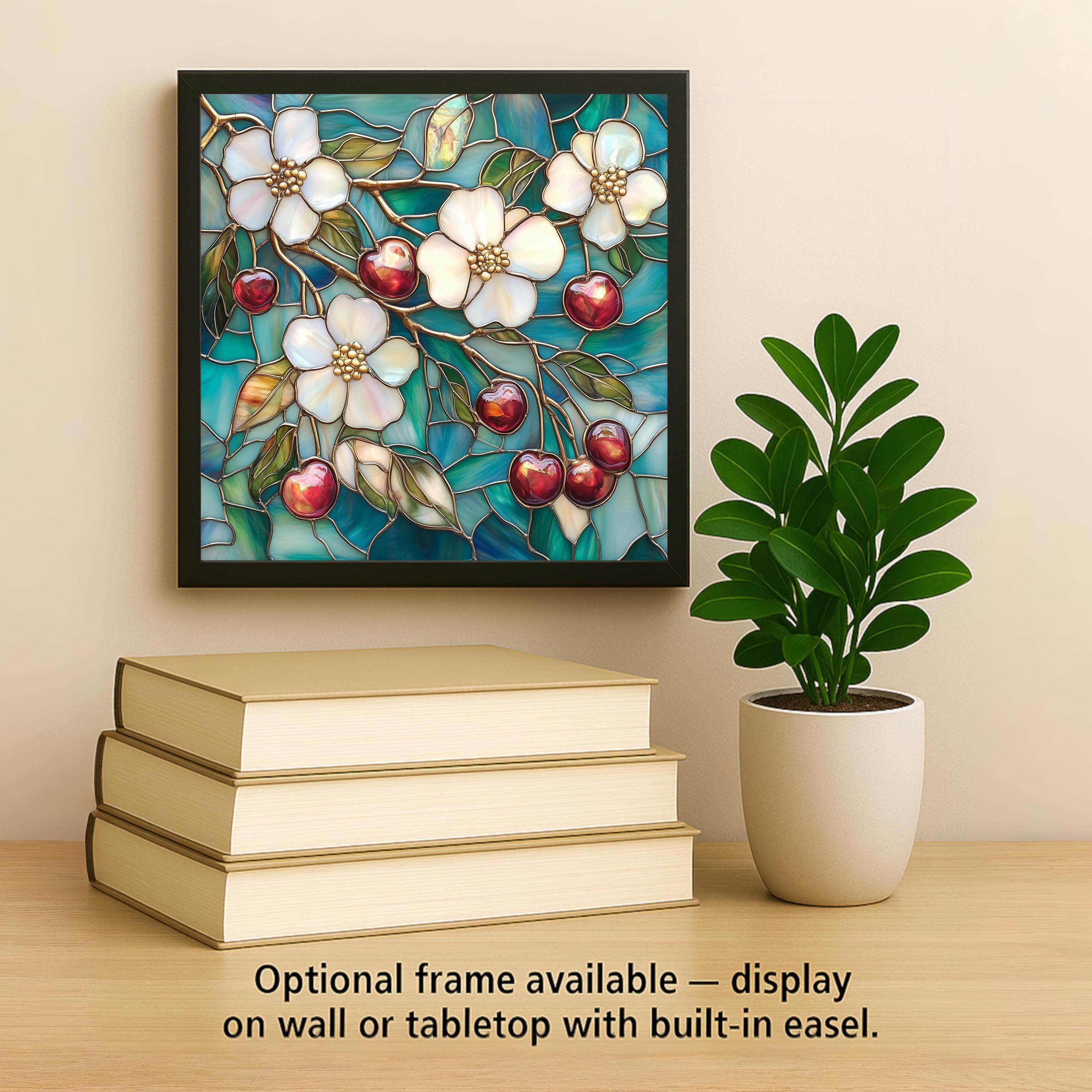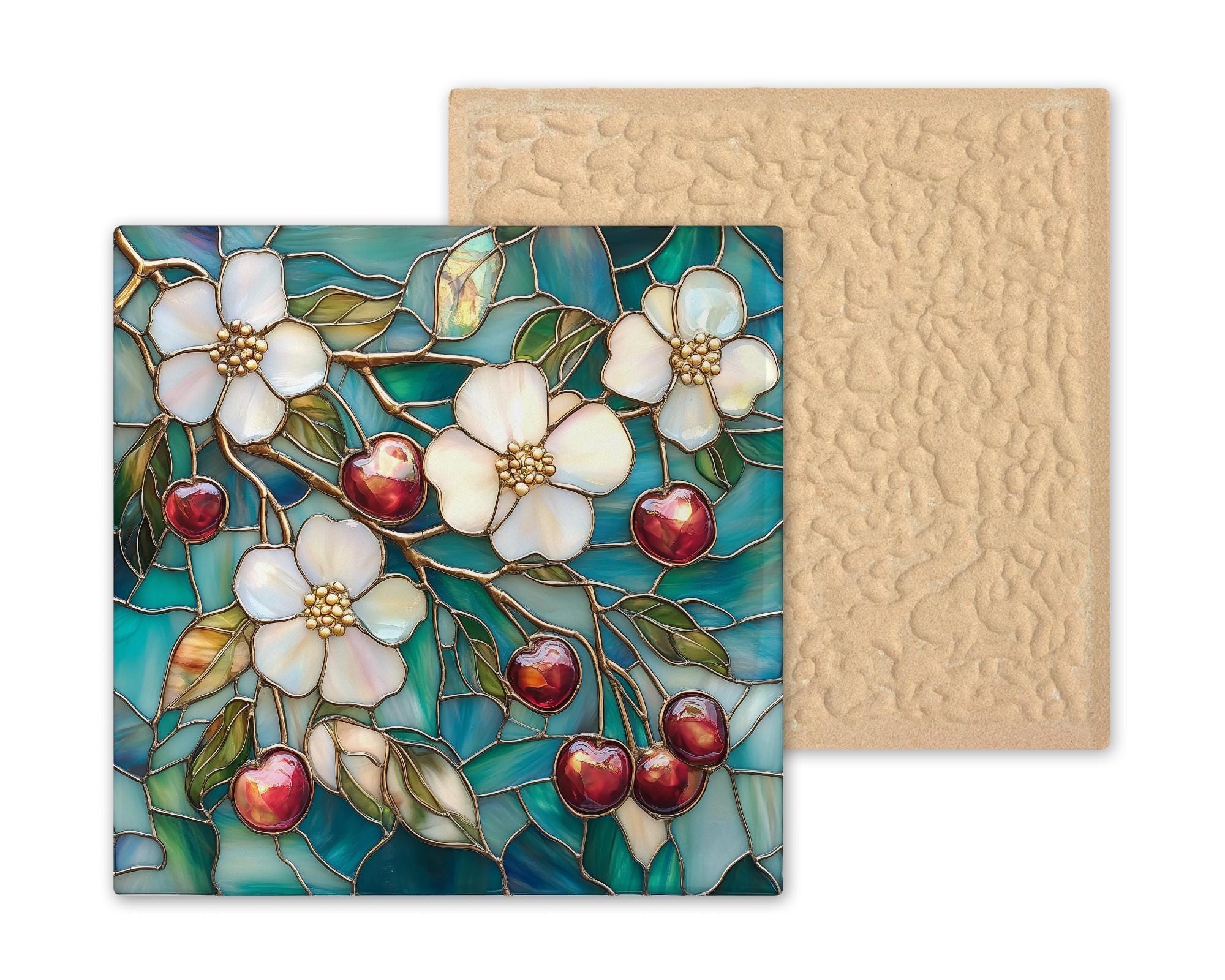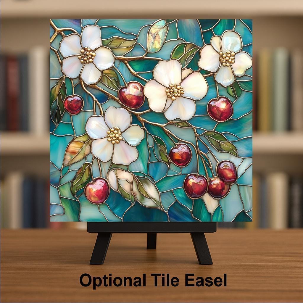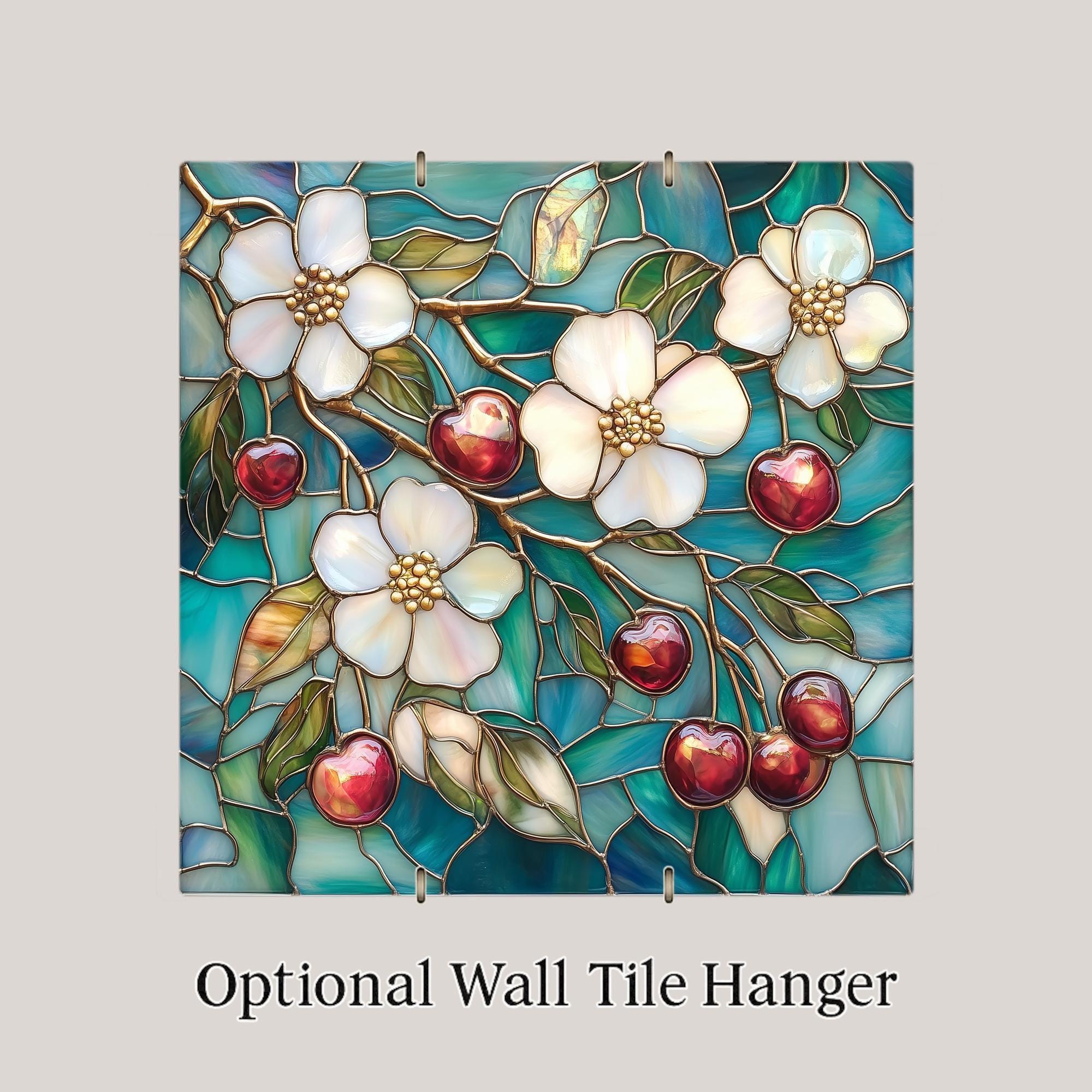 Celebrate the delicate beauty of nature with this cherry blossom ceramic tile, designed in the style of stained glass. Lush clusters of red cherries and white blossoms are framed by warm bronze linework and layered over a vibrant teal and aqua background. The colors shimmer like glass, while the ceramic finish provides long-lasting durability and charm.