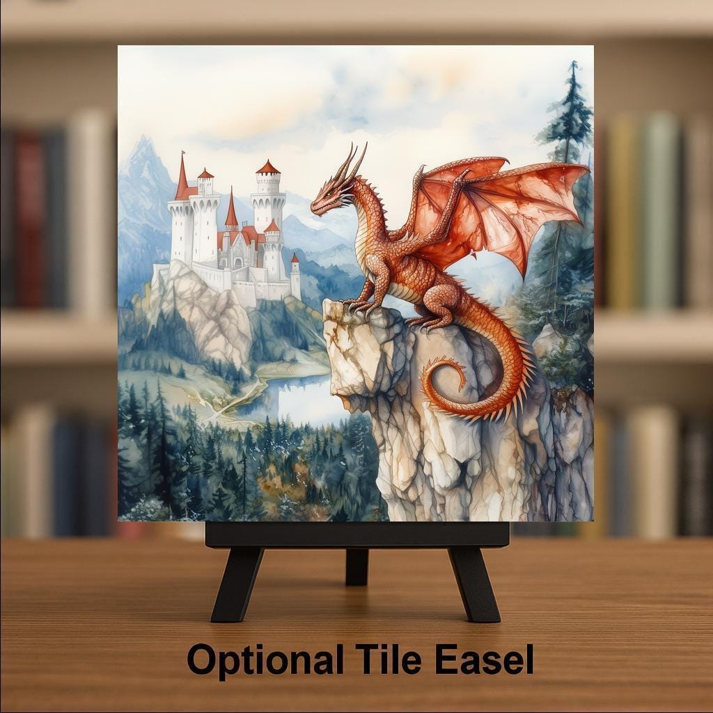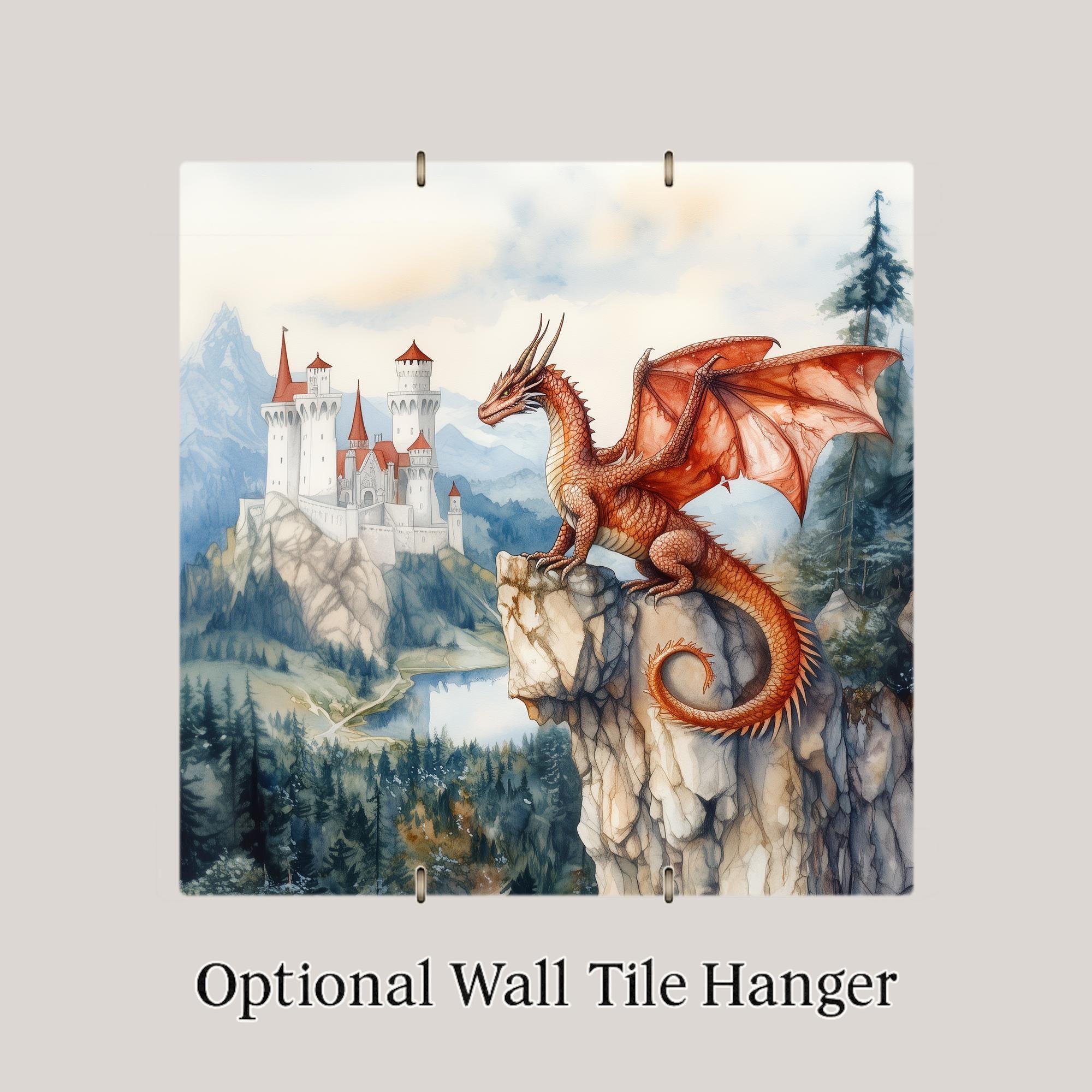 This Watercolor Dragon and Castle Tile Art is ideal for anyone who loves fantasy wall art, medieval storytelling, and gentle watercolor illustration. The artwork features a classic European dragon—styled after the creatures found in St. George legends—resting on a cliffside as it overlooks a castle nestled among mountains and forests. The bright red wings, soft sky lighting, and detailed environment create a peaceful yet majestic scene that blends medieval charm with fantasy imagination.