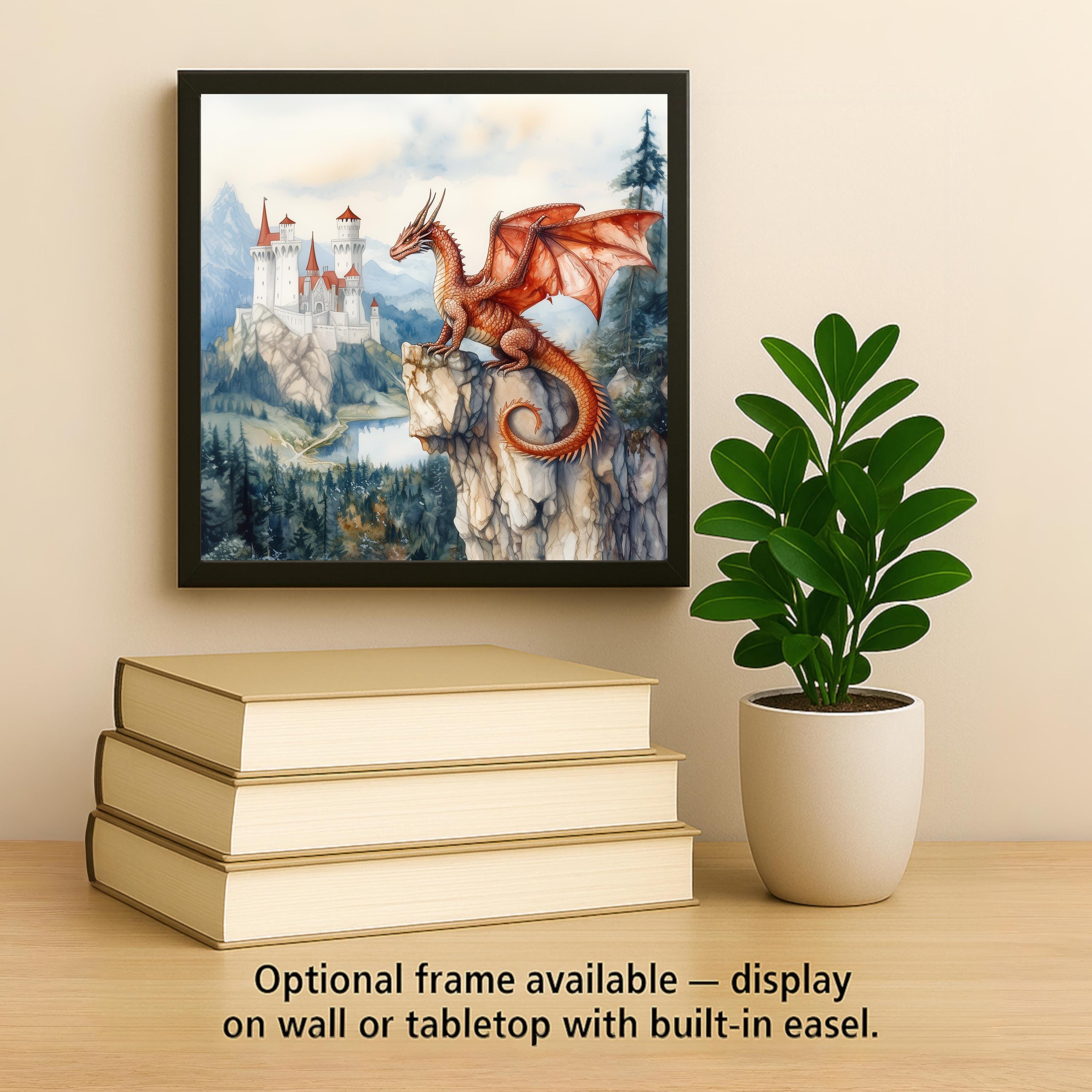 This design makes an excellent gift for lovers of medieval legends, fantasy books, dragons, and castle-themed artwork. The peaceful composition fits beautifully in reading nooks, offices, game rooms, and cottage-style or rustic home decor. The dragon’s protective pose overlooking the valley creates a sense of story and adventure that appeals to fans of folklore and mythical creatures.