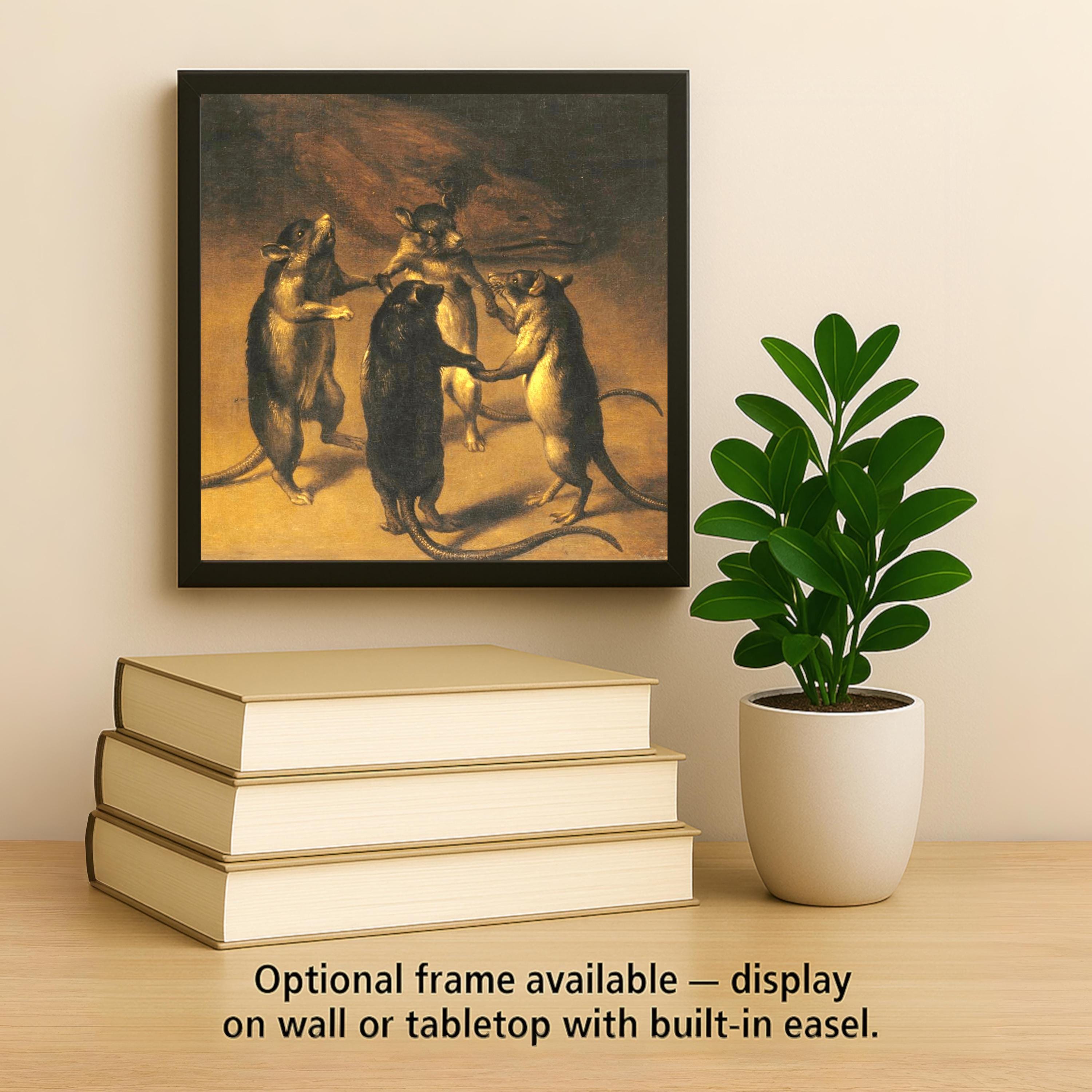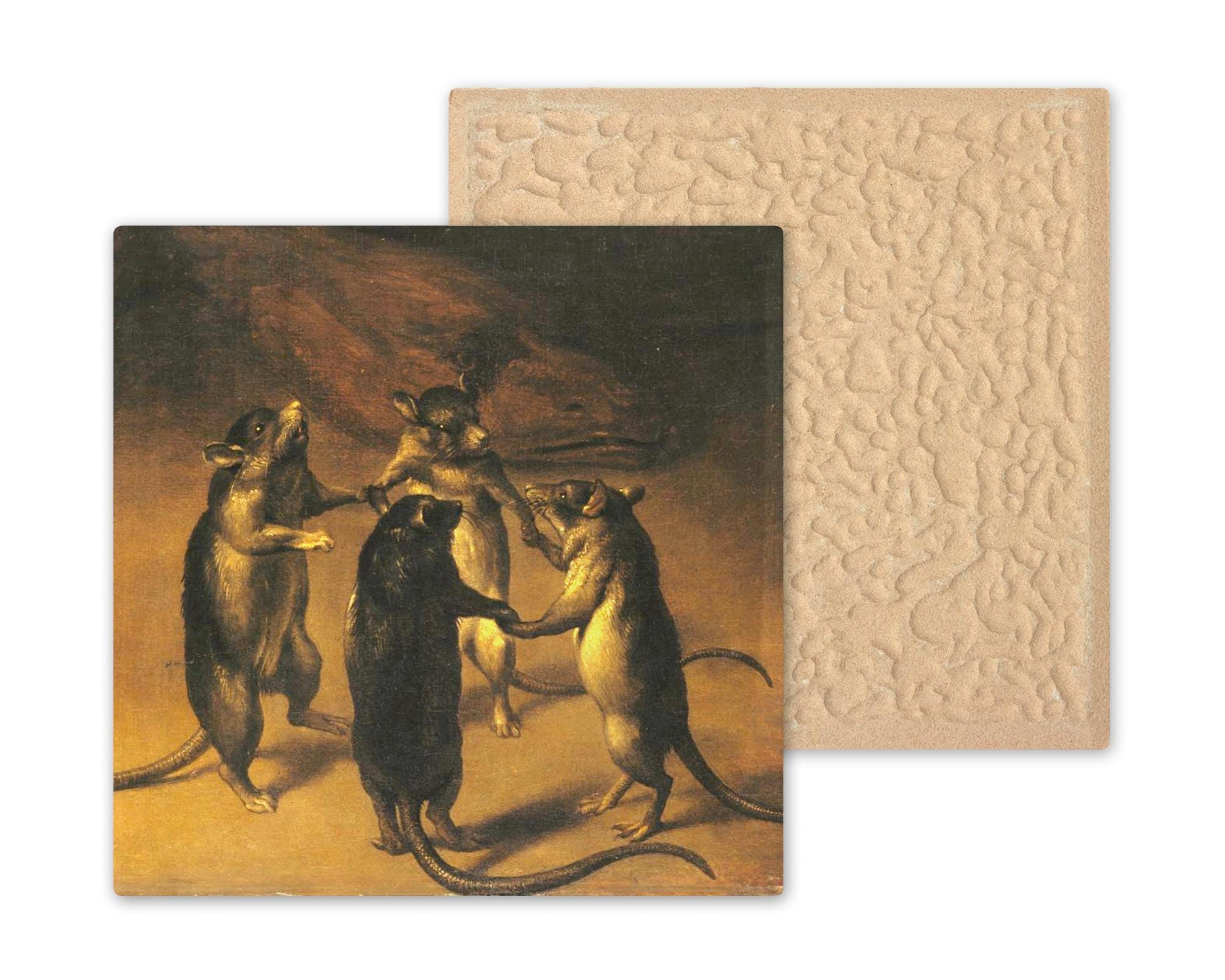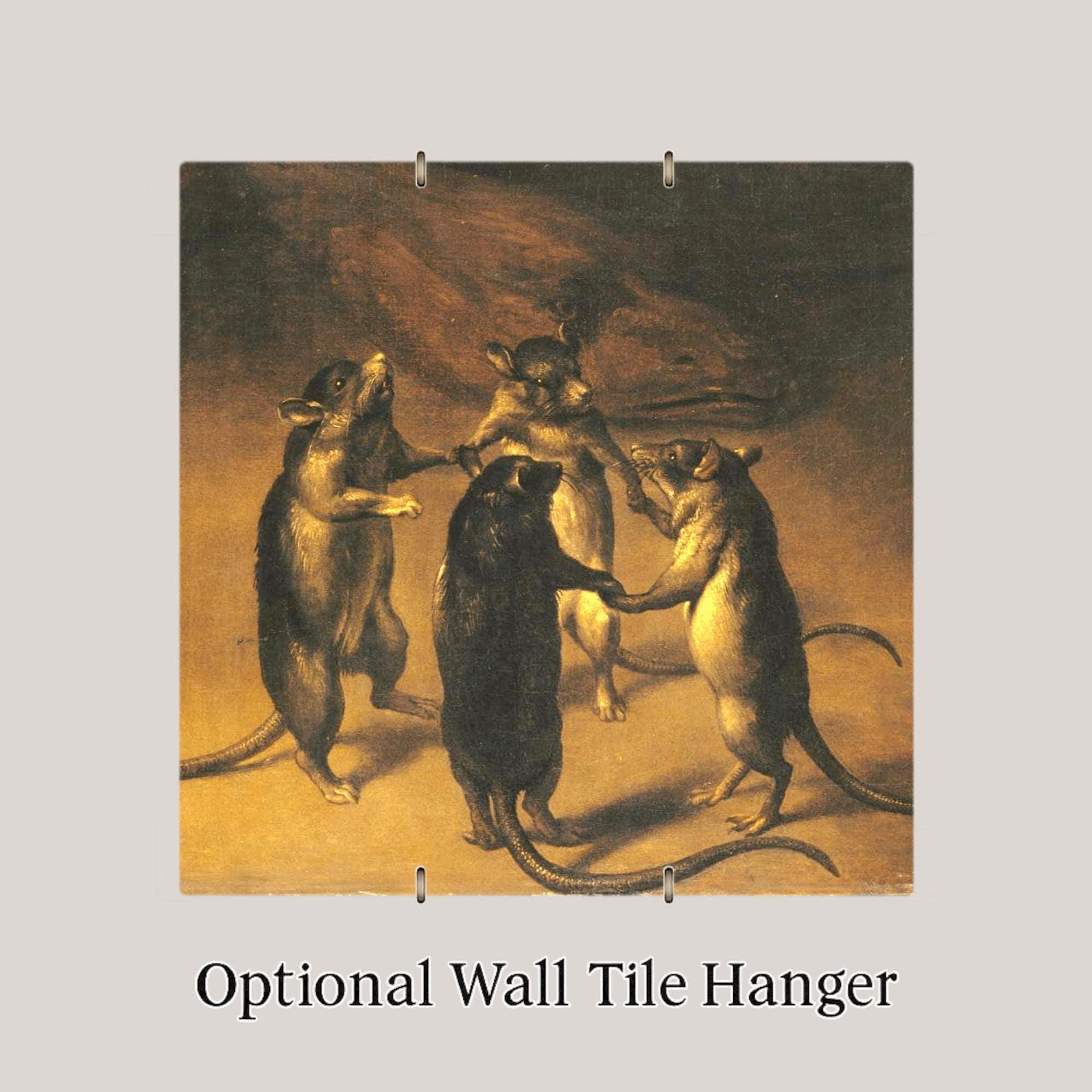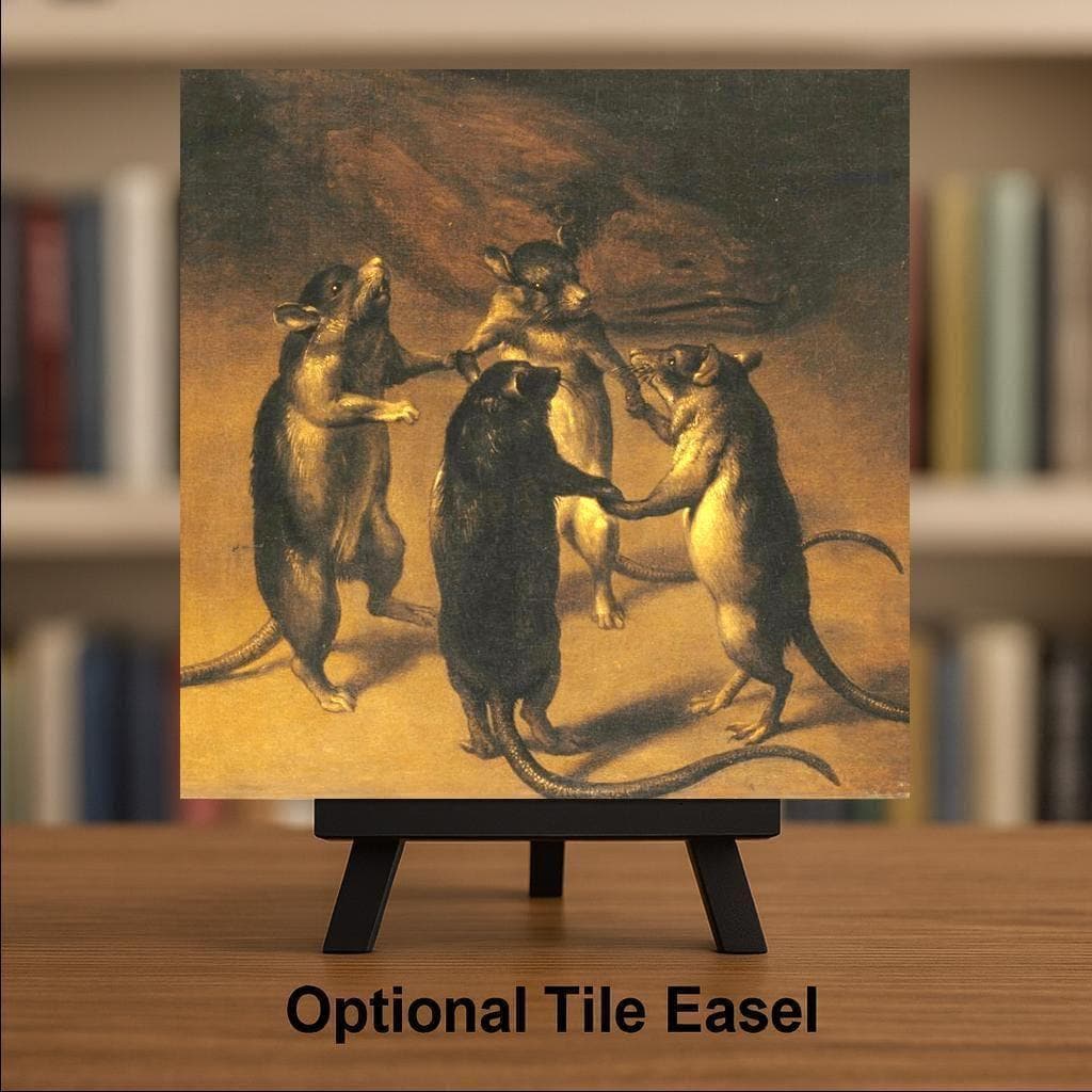 Bring an eerie elegance to your walls with this Gothic-inspired “Dance of the Rats” ceramic tile. Echoing the atmosphere of old-world oil paintings and candlelit castles, this moody piece depicts four anthropomorphic rats in a strange circular dance—an image that feels lifted from a forgotten folktale or medieval manuscript.