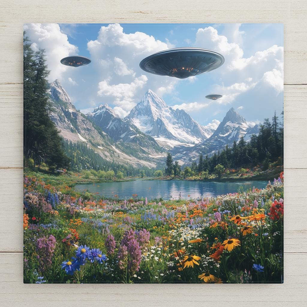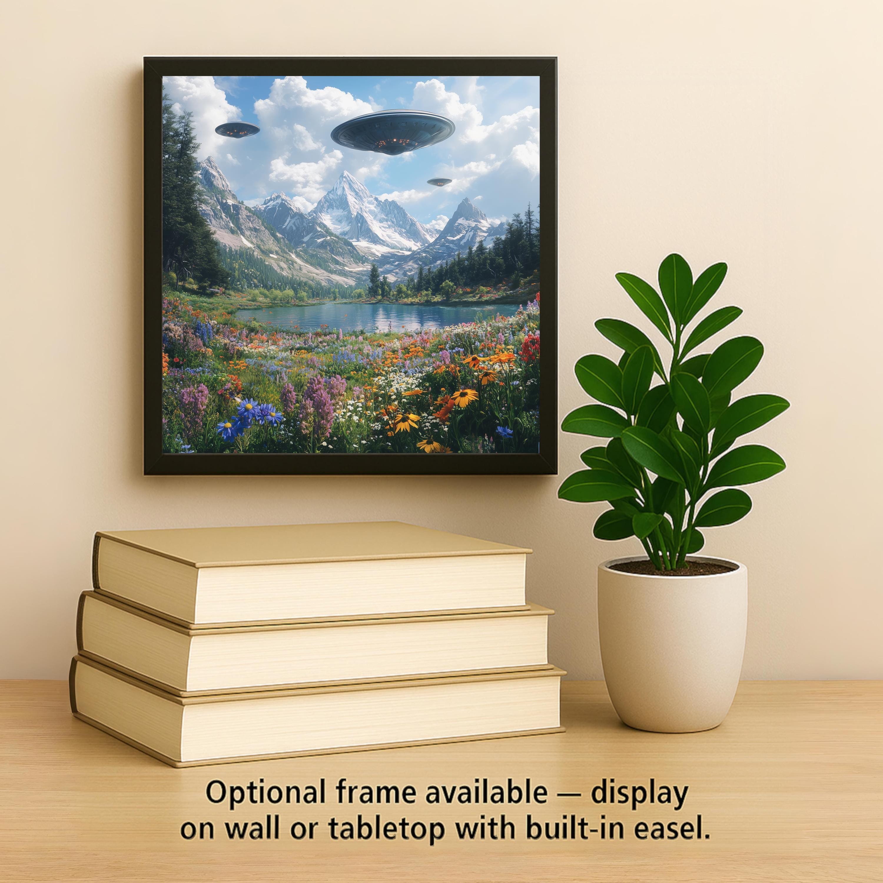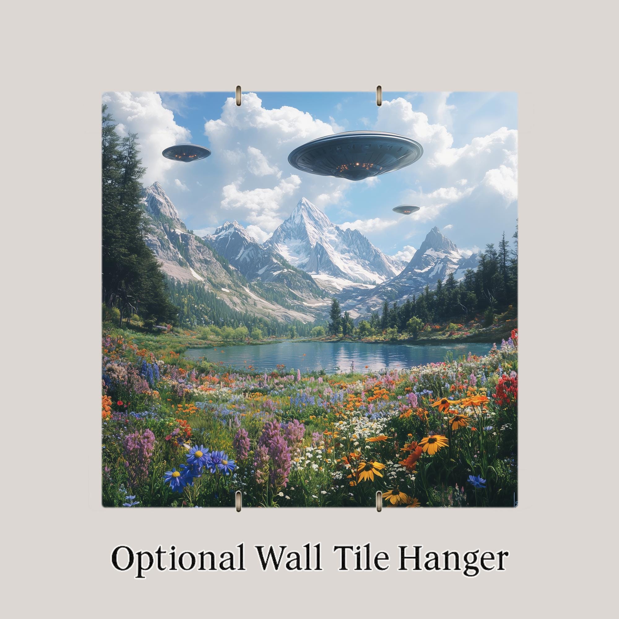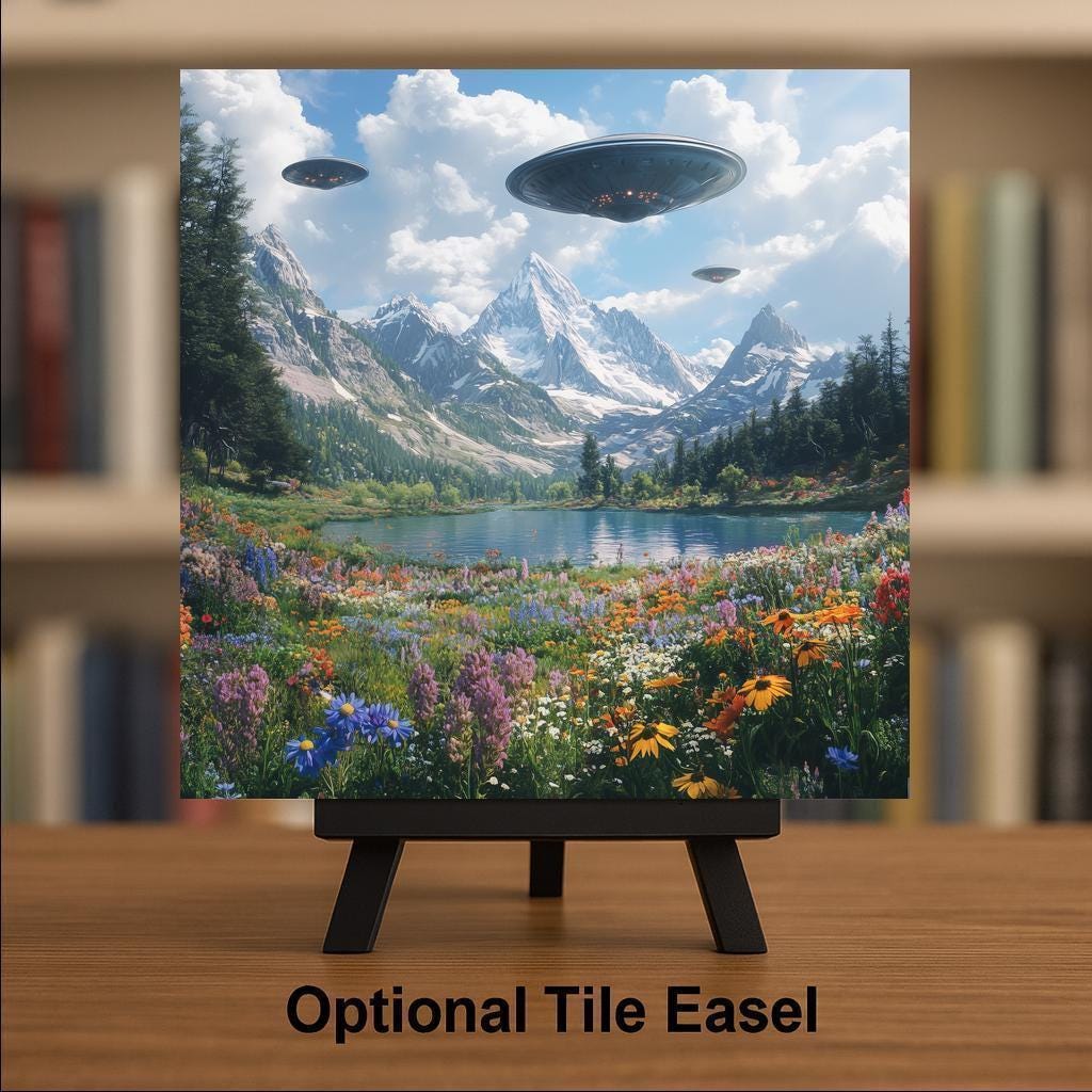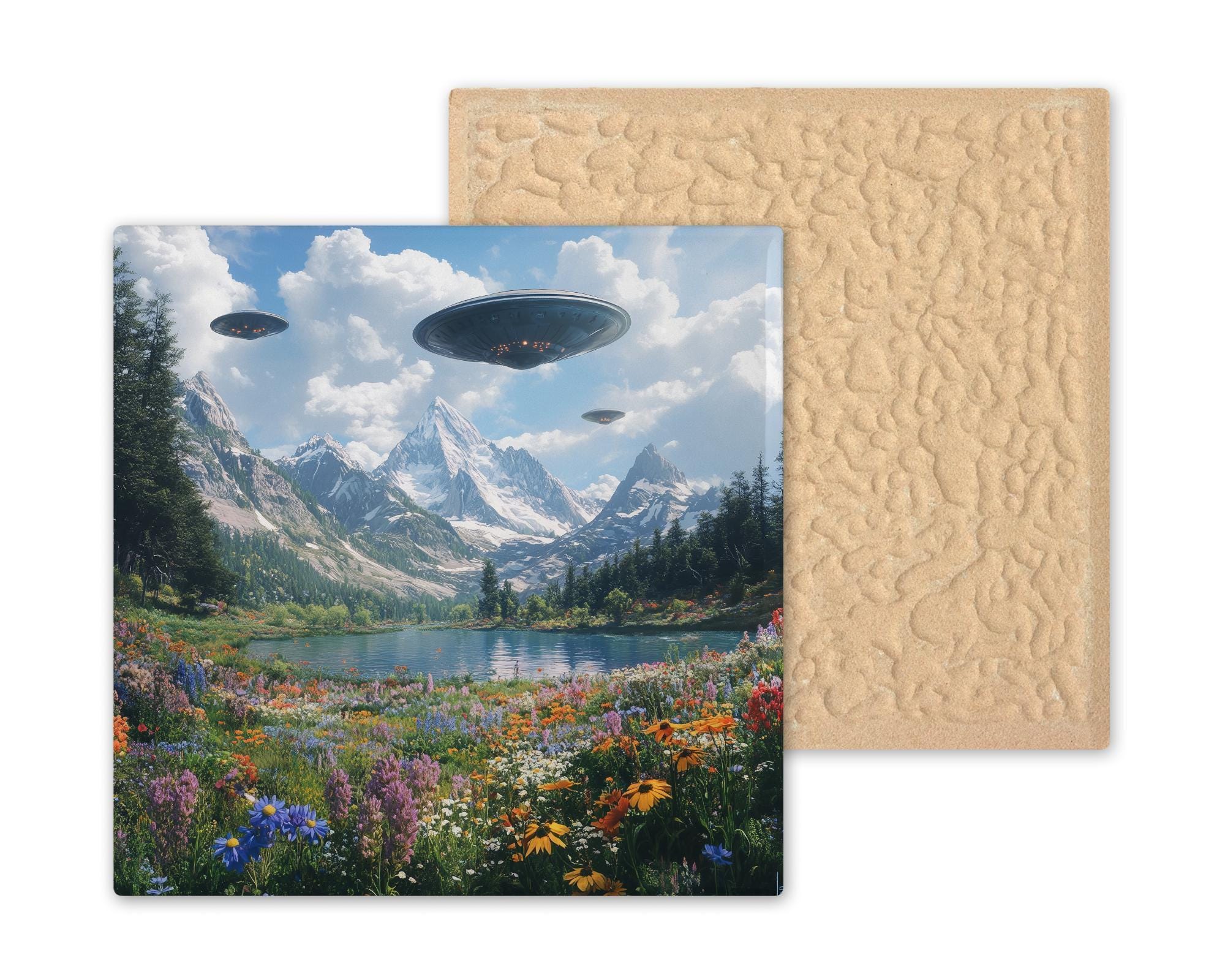Great for quirky home décor, outer space fans, or anyone drawn to artistic contrasts, this tile is both peaceful and playful. Hang it in an entryway, display it on a bookshelf, or use it to anchor a themed wall. It’s a unique gift for UFO enthusiasts, artists, sci-fi collectors, or lovers of fantasy landscapes with a splash of the unknown.