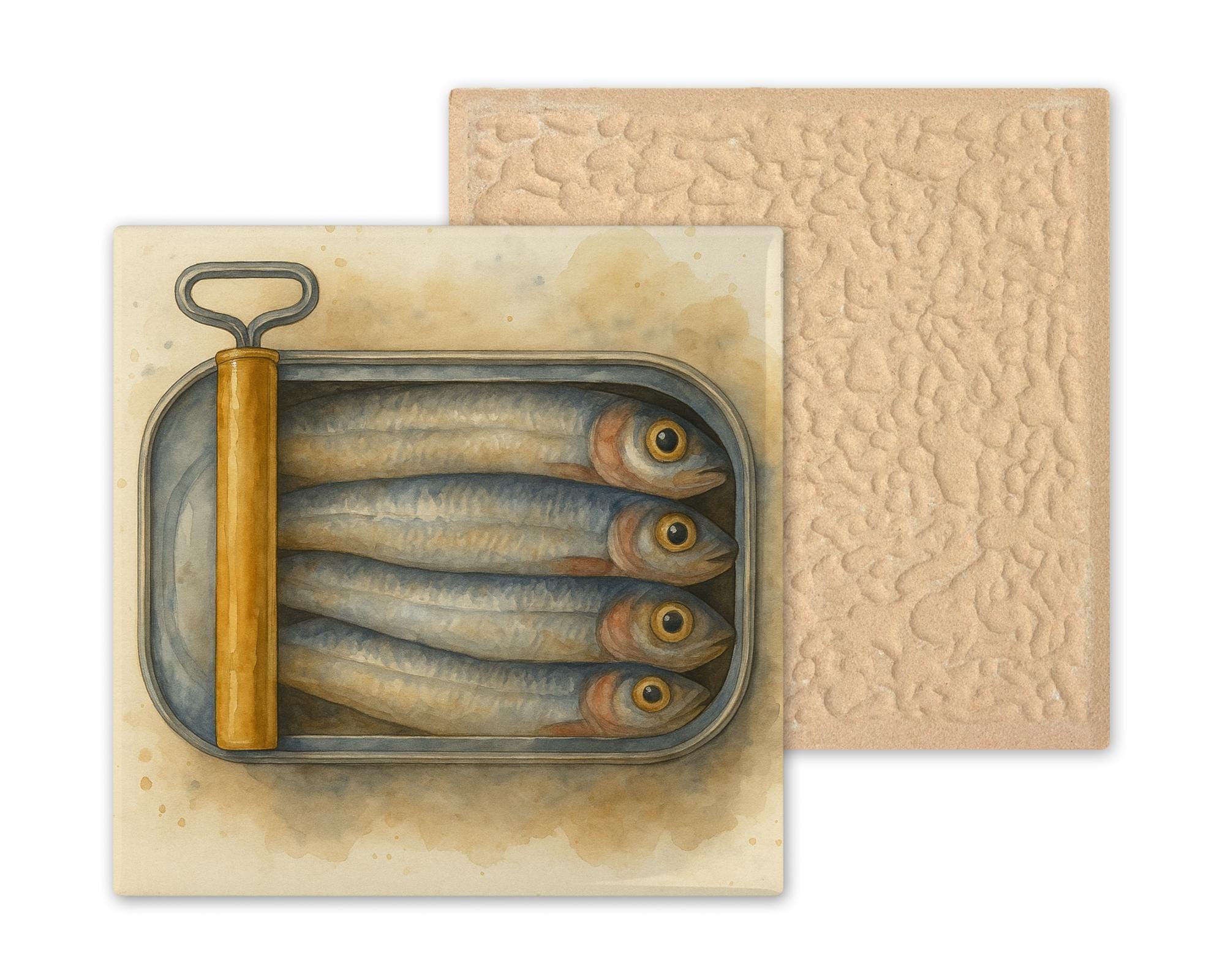 This vintage sardine can ceramic tile blends watercolor artistry and retro charm into a delightful kitchen decor piece. The detailed rendering of sardines packed tightly in an old-fashioned metal tin makes for a unique conversation piece, ideal for adding personality to any home or beach cottage.