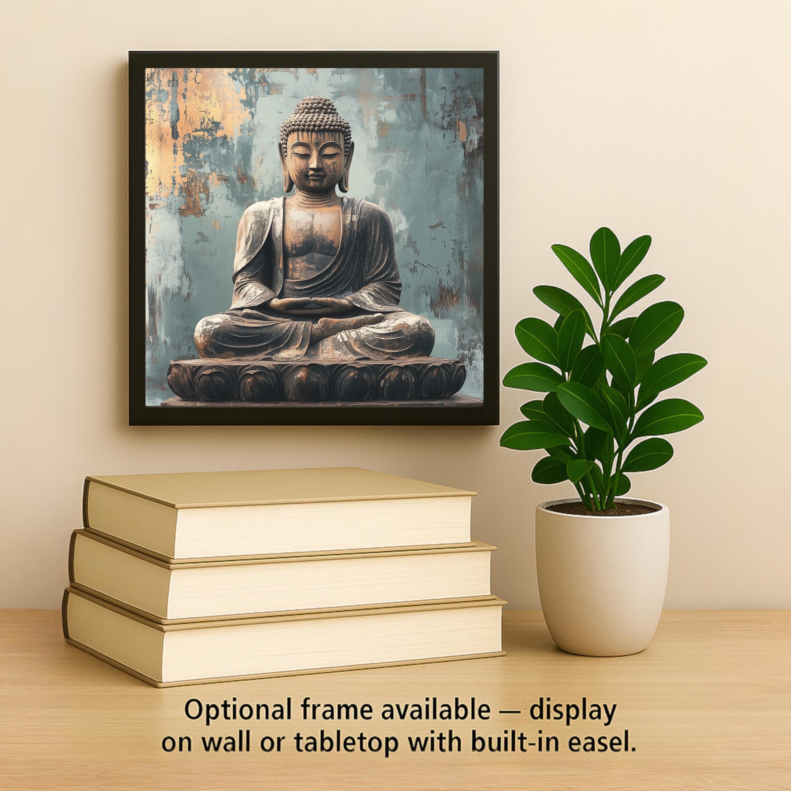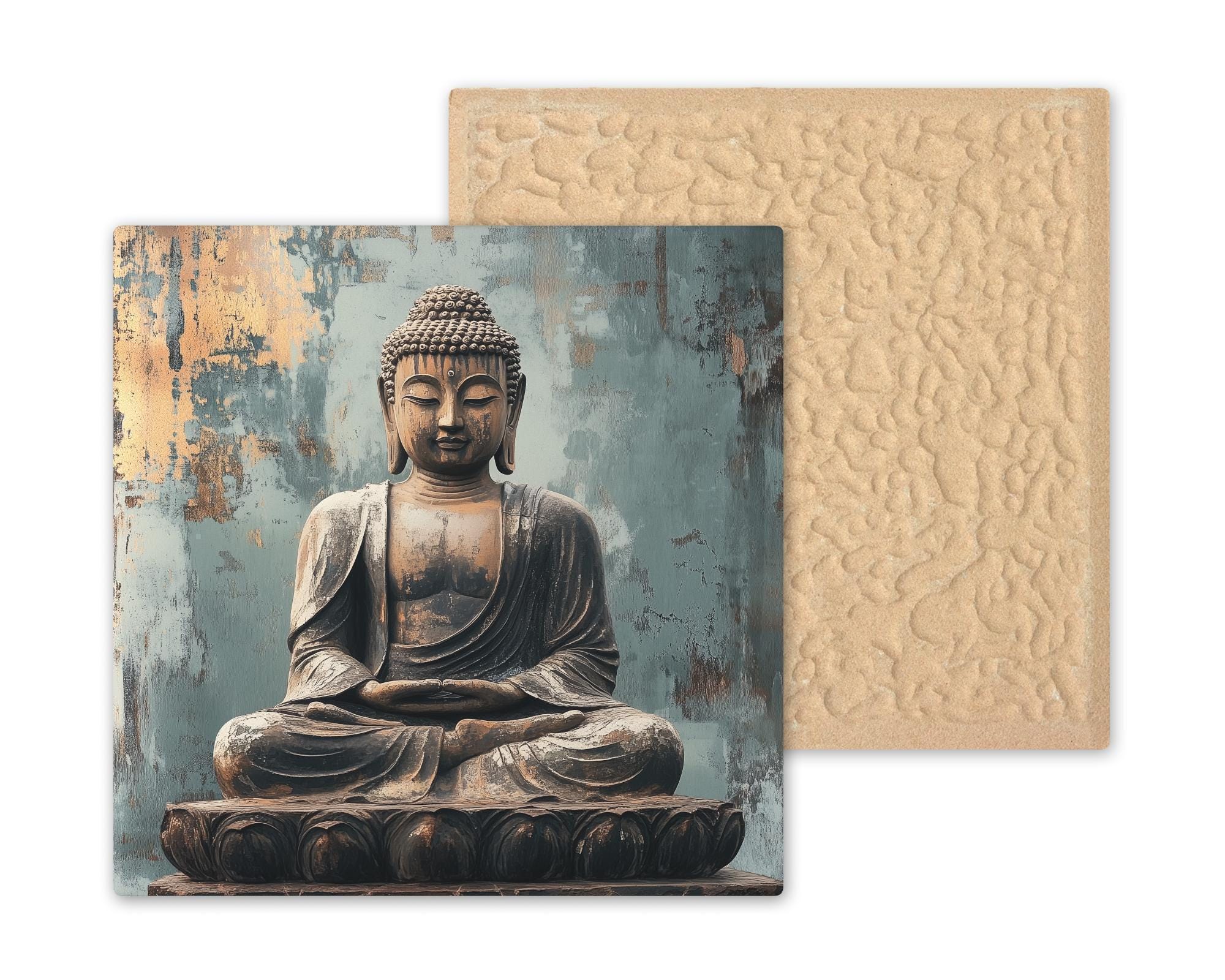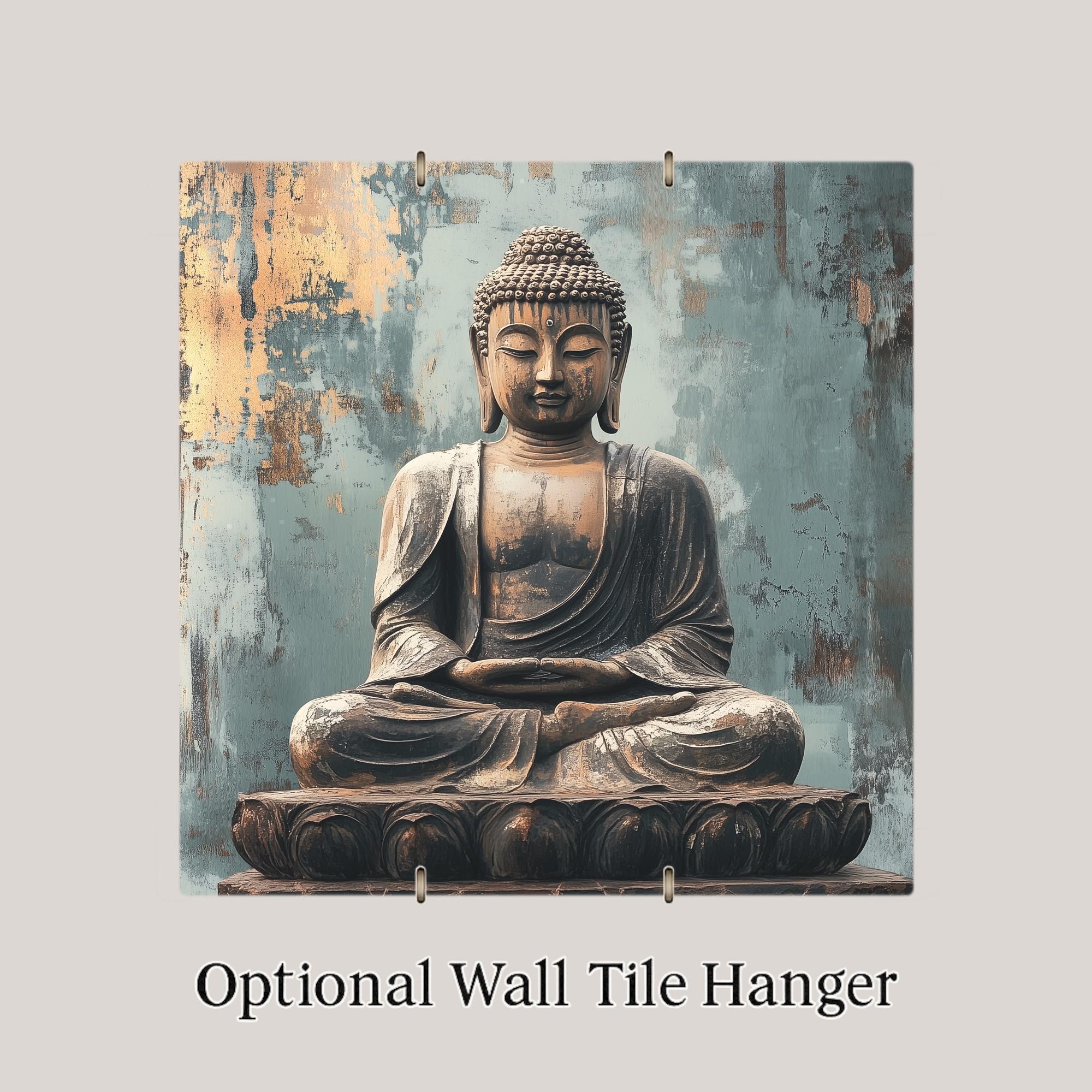 This ceramic Buddha tile blends peaceful aesthetics with spiritual meaning, offering a visual reminder to cultivate mindfulness in everyday life. The distressed background hints at age and wisdom, while the soft gold and blue hues create a calming atmosphere. Centered in the composition, the meditating Buddha evokes themes of inner peace, strength, and contemplation.