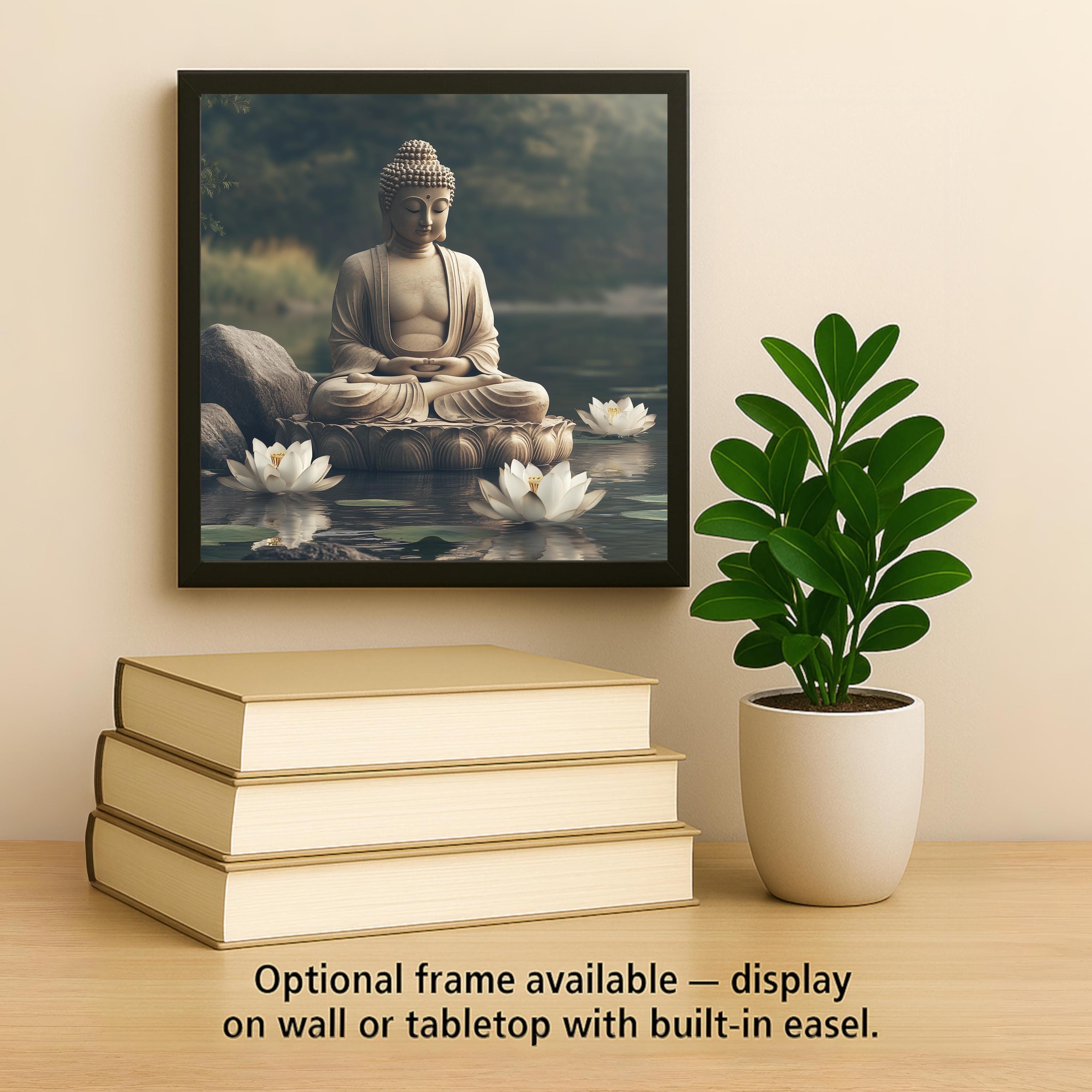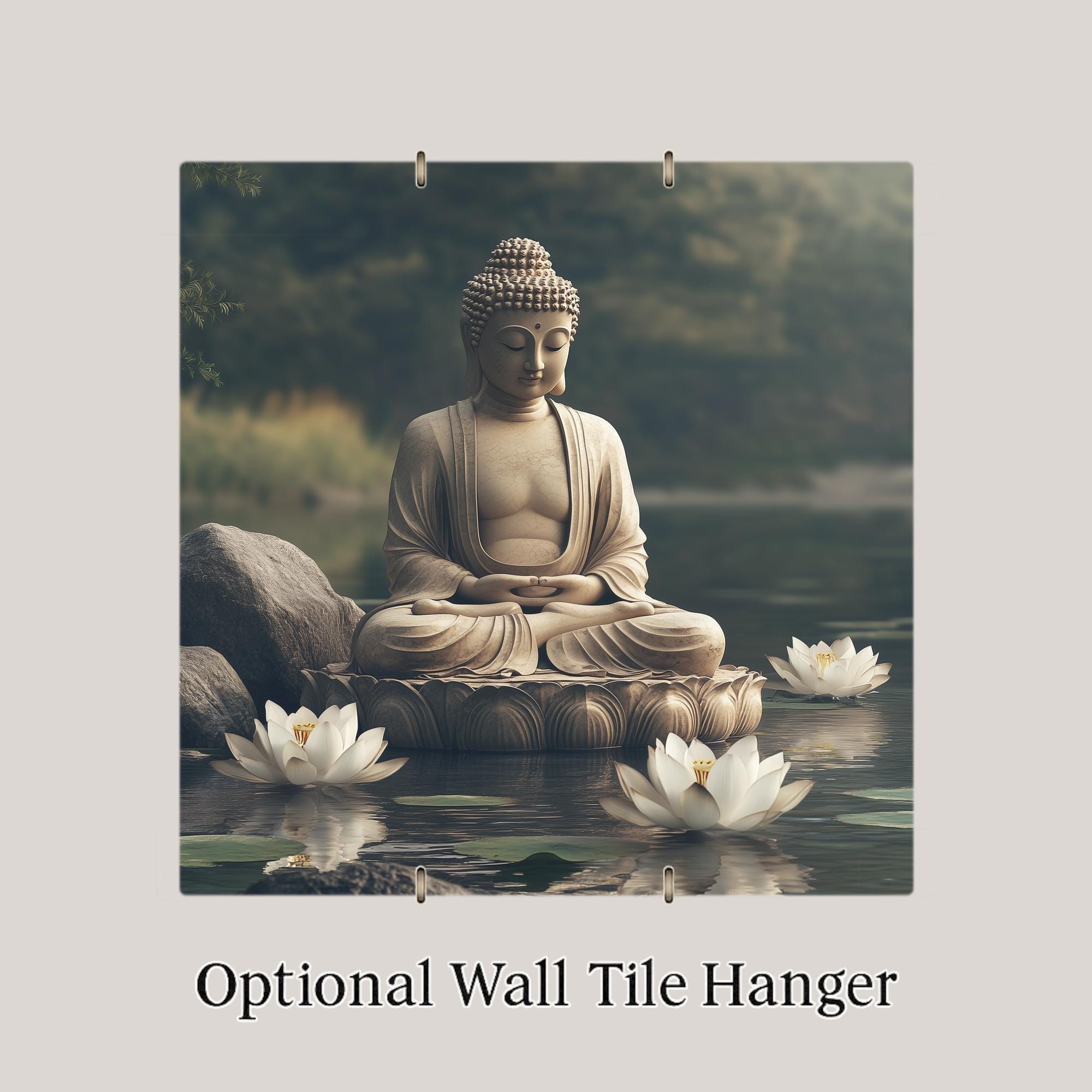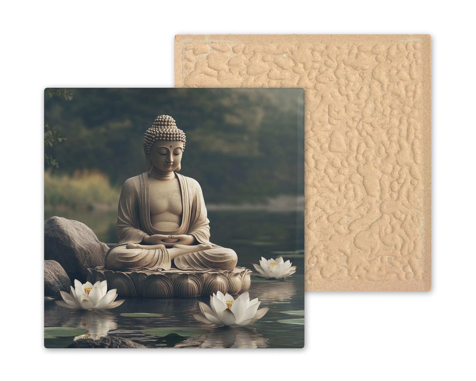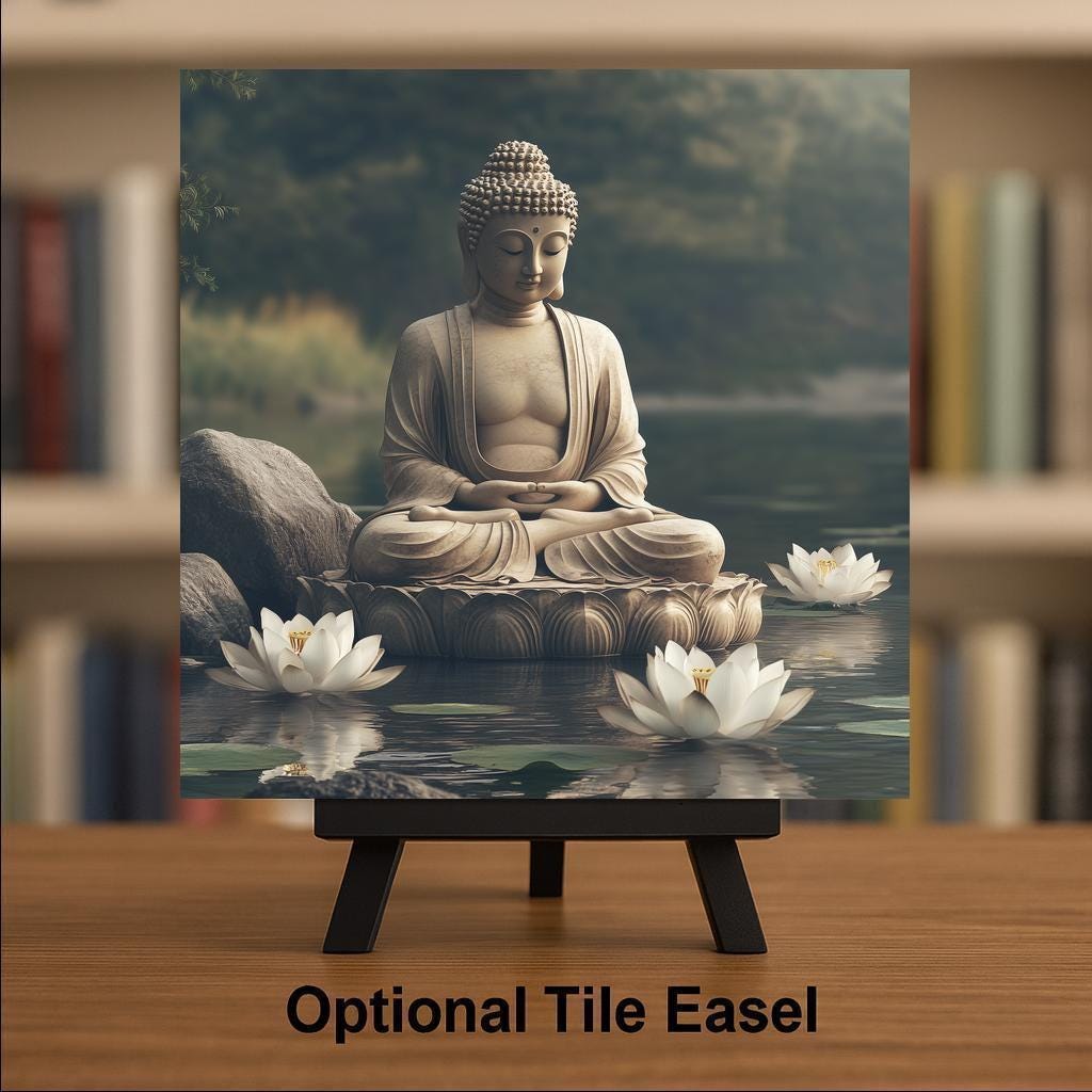 Create a peaceful atmosphere in your home or studio with this serene Buddha ceramic tile. The artwork features a meditating Buddha statue resting in calm waters, surrounded by soft lotus blossoms and natural stone. The design captures stillness, beauty, and spiritual presence—ideal for mindful decor or a meditation space. Its muted tones and reflective water offer a grounding visual that centers the mind.