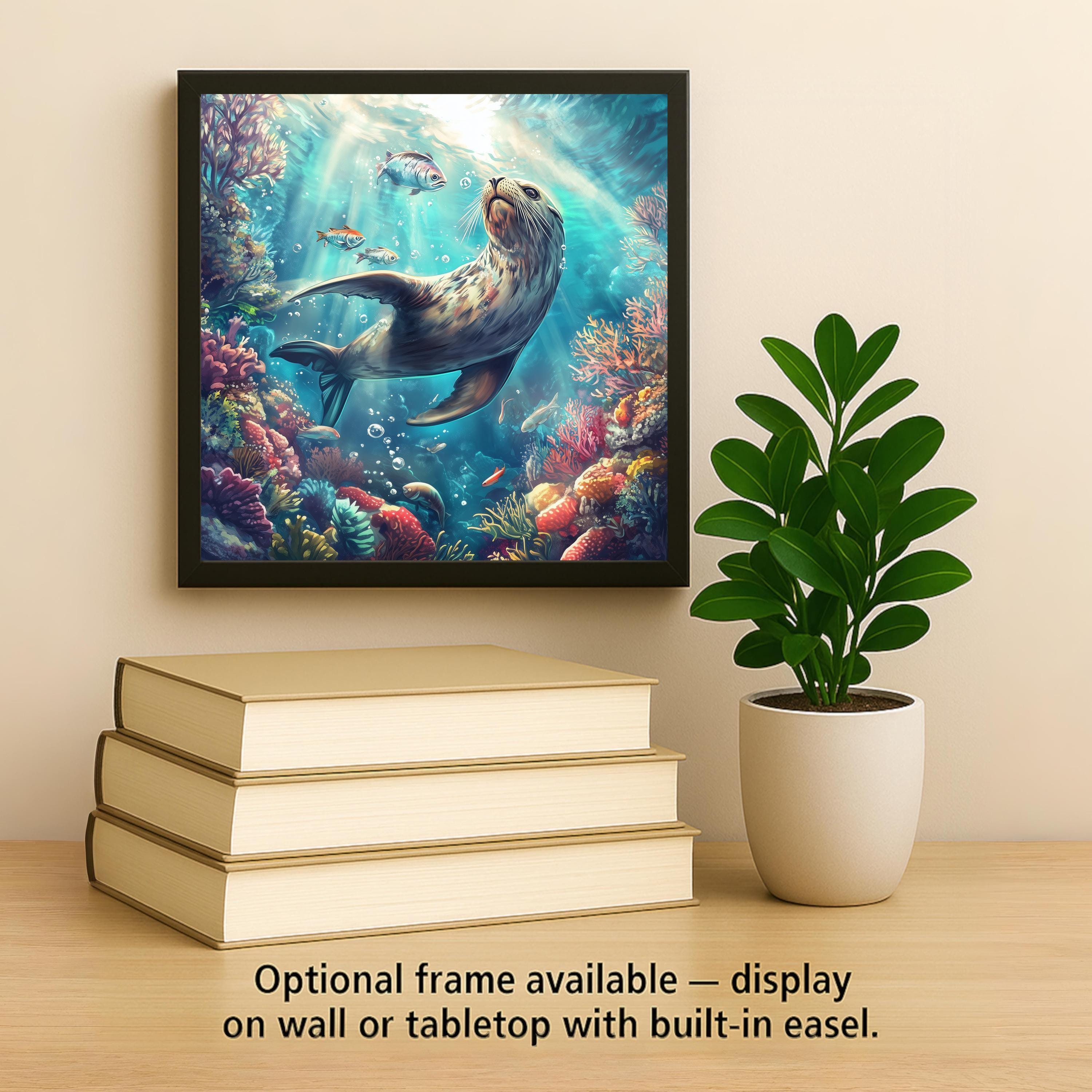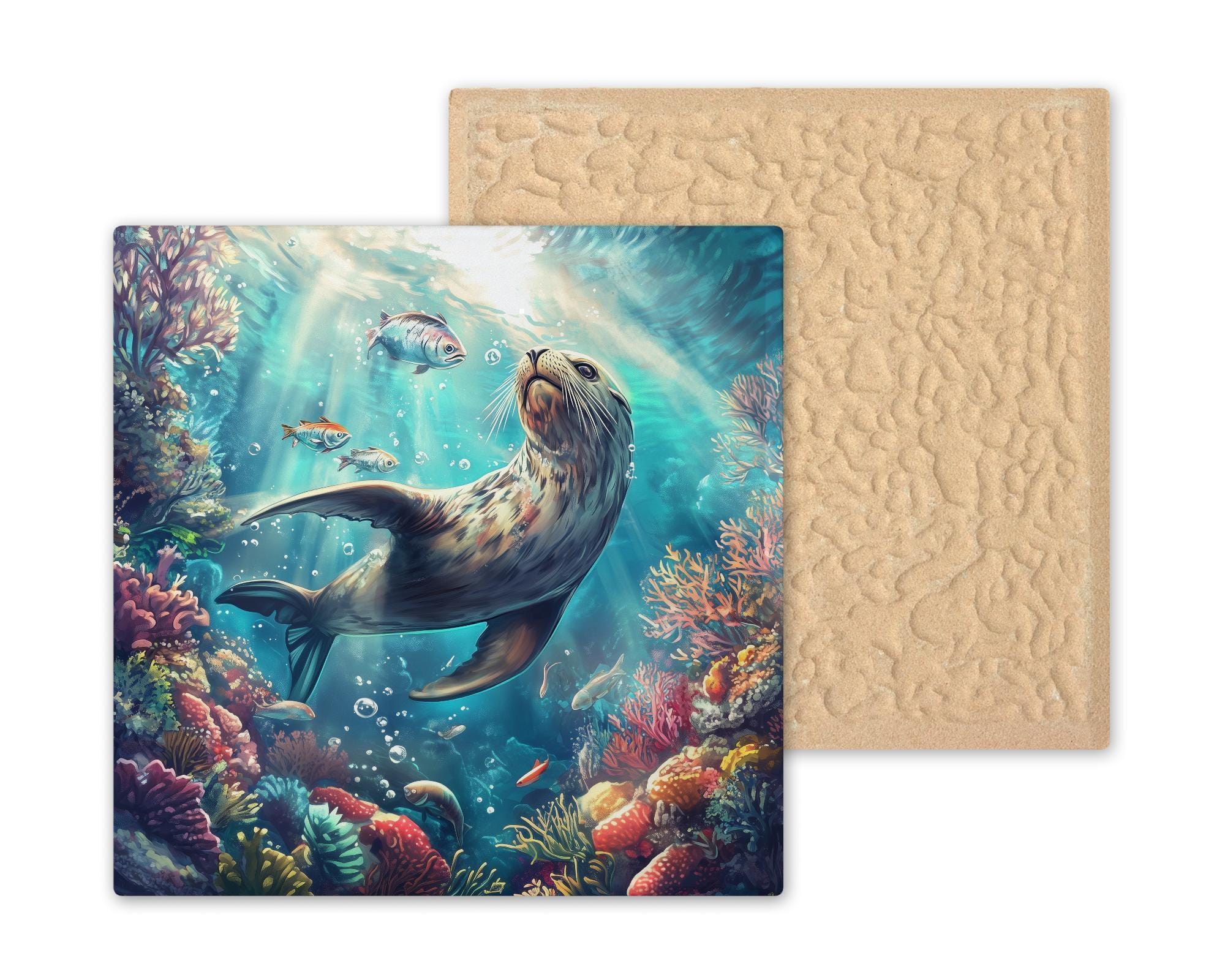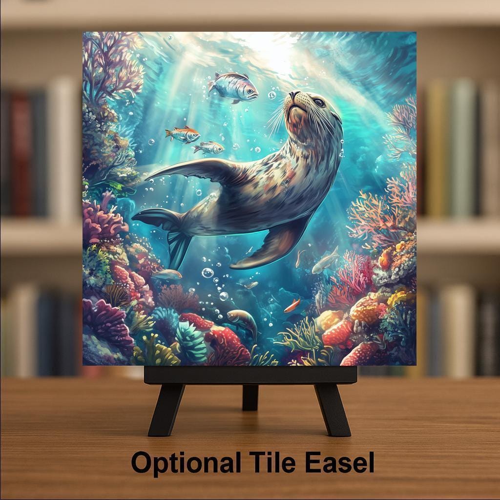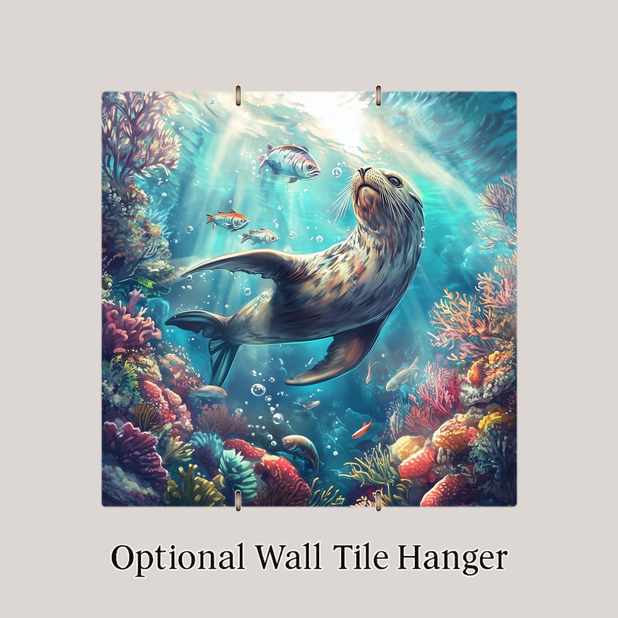 Bring the wonder of the sea into your space with this stunning sea lion ceramic tile. Surrounded by colorful coral and tropical fish, the playful sea lion floats beneath sun-dappled waves in a scene full of motion and life. This underwater artwork adds energy and calm to any coastal or beach-themed room.