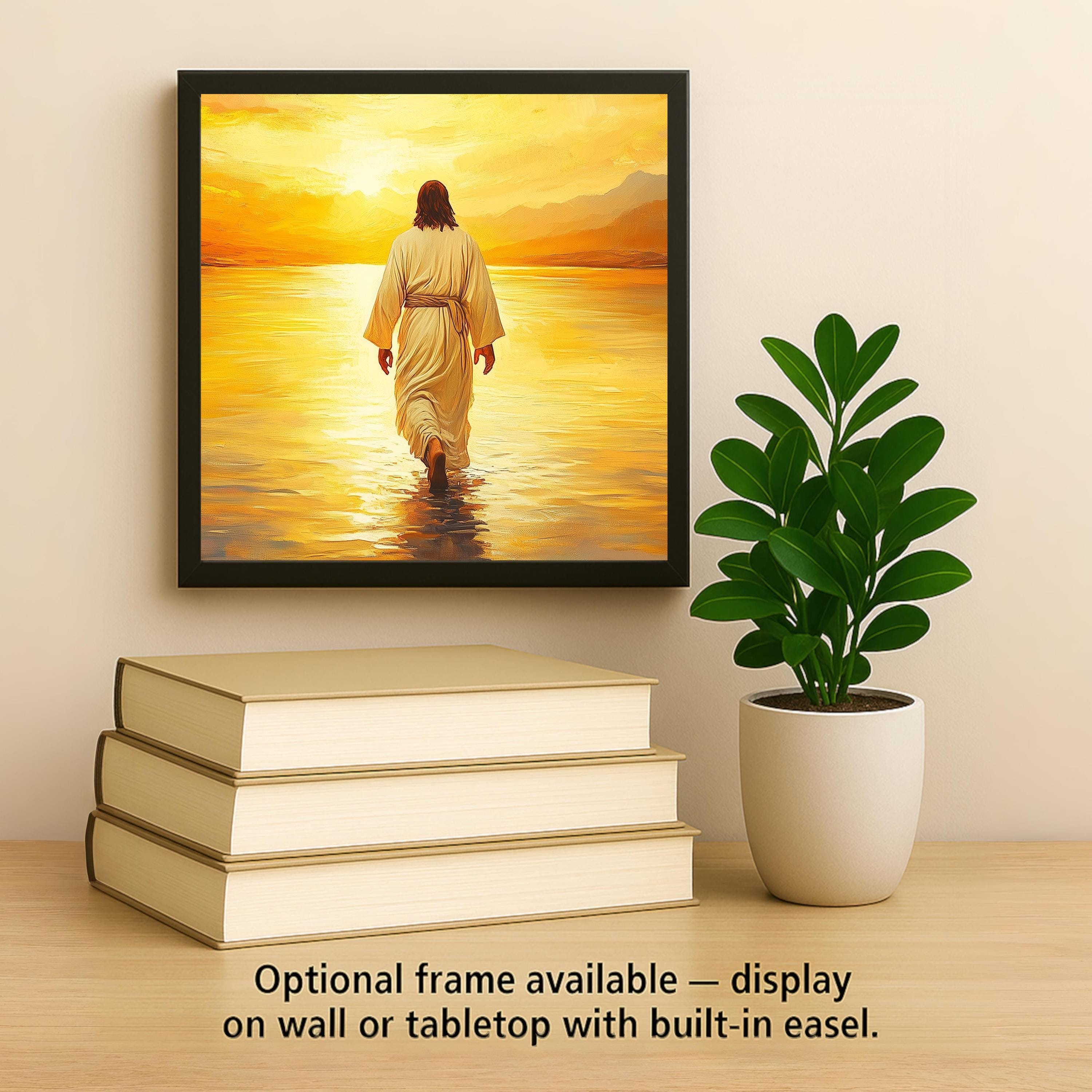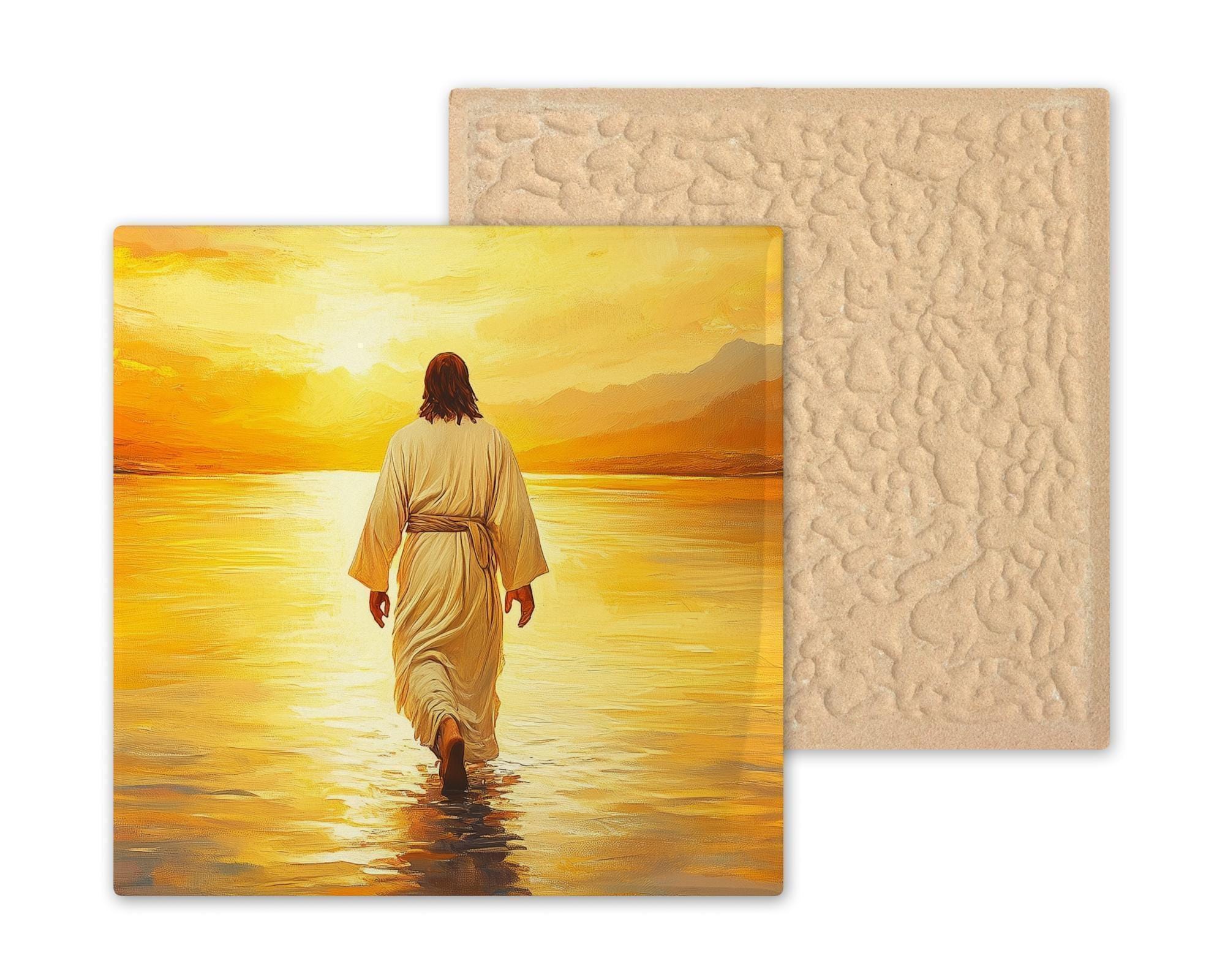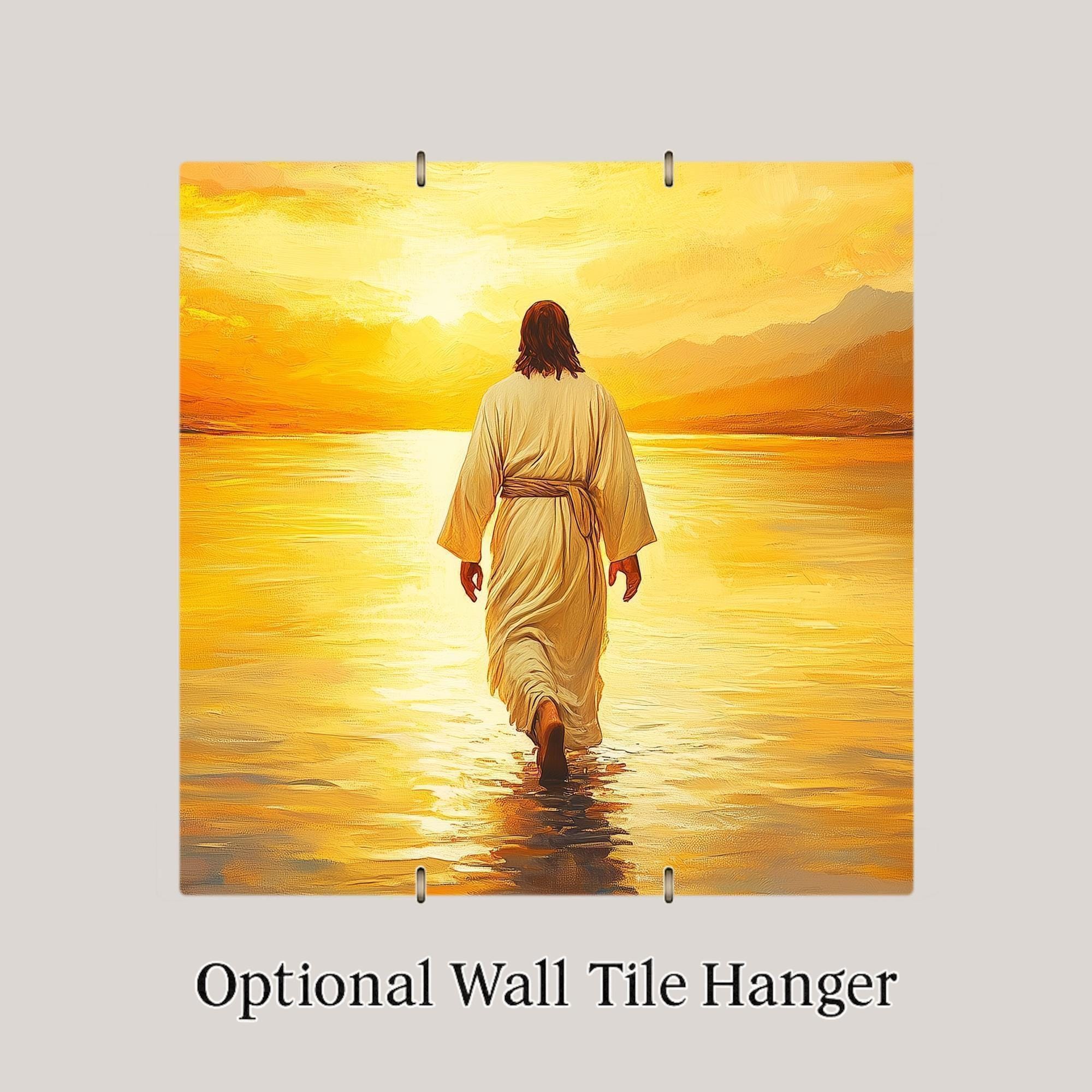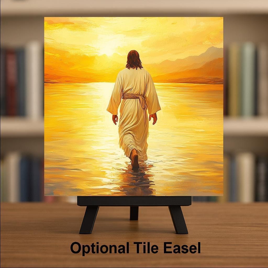 Bring a meaningful symbol of hope into your home with this Jesus Walking on Water Ceramic Tile, featuring brilliant sunrise tones and a powerful spiritual theme. The image shows Jesus striding across golden waters, surrounded by the light of a new day—reminding us of faith, renewal, and divine presence.