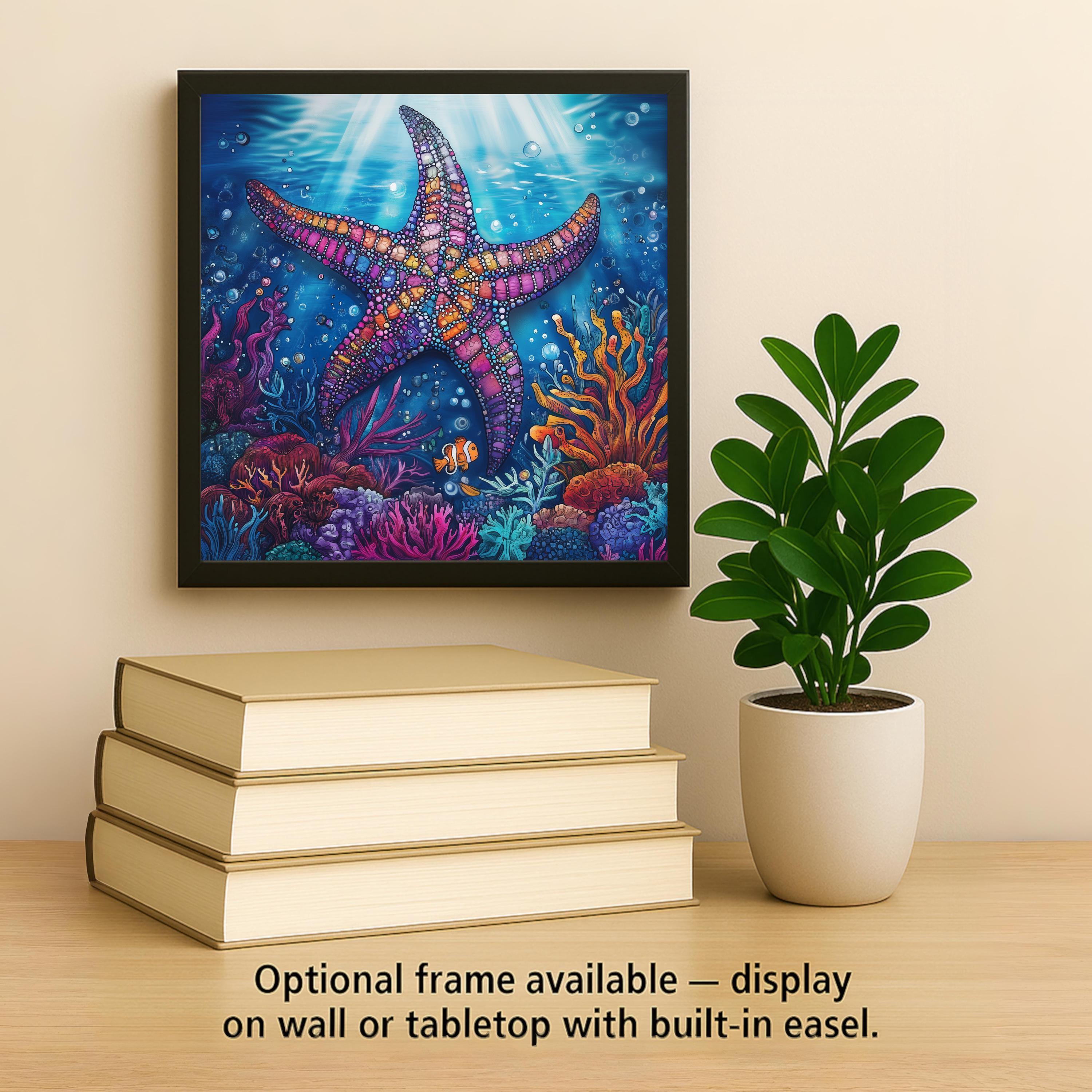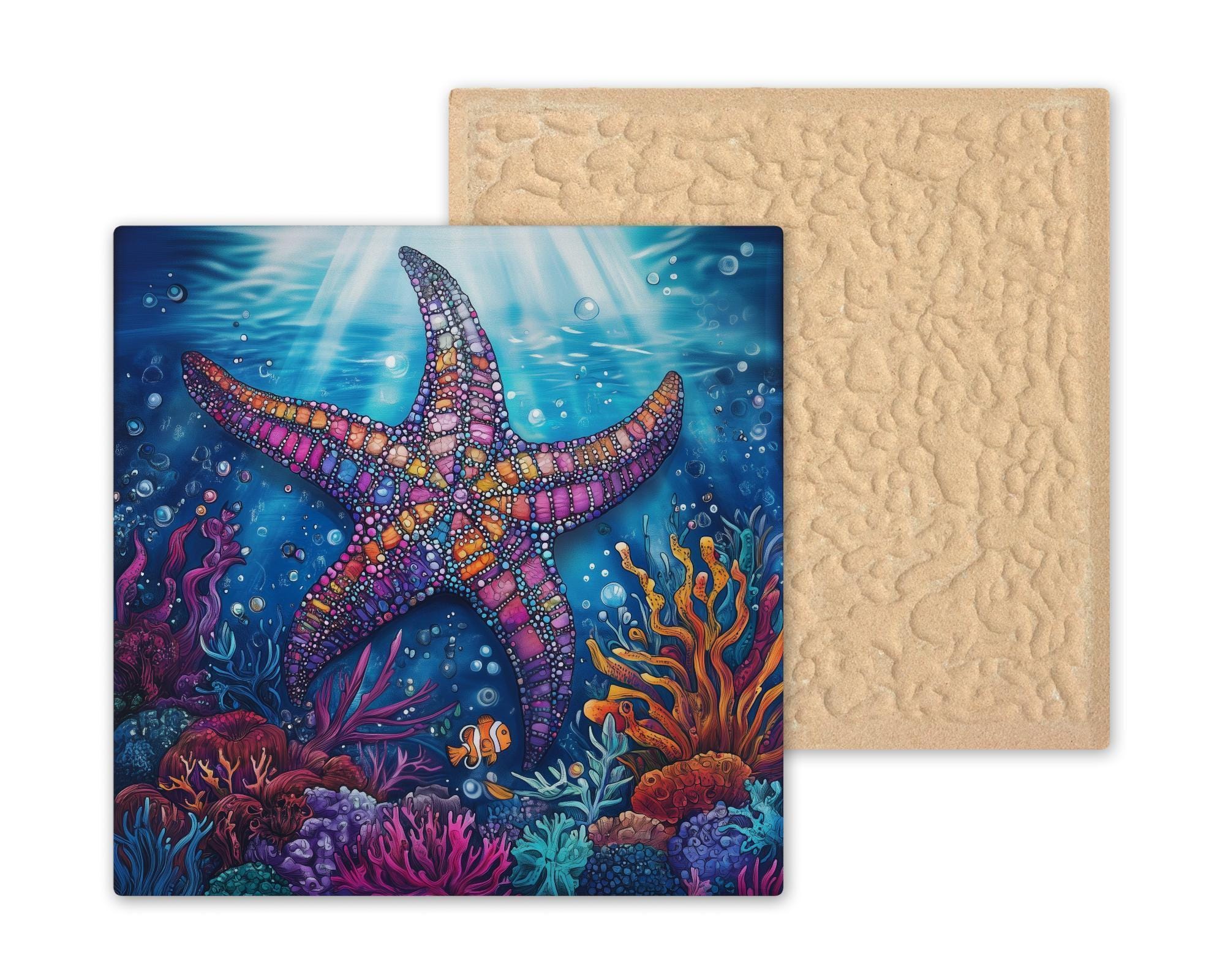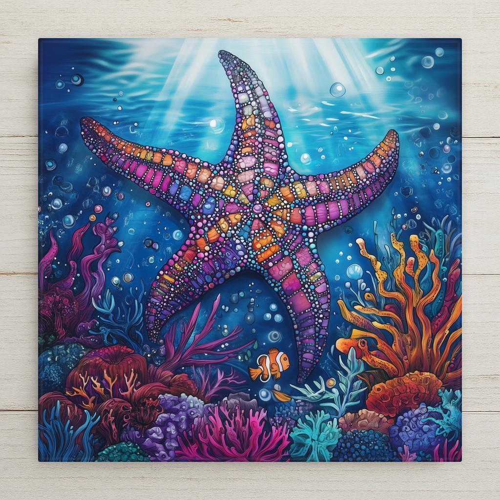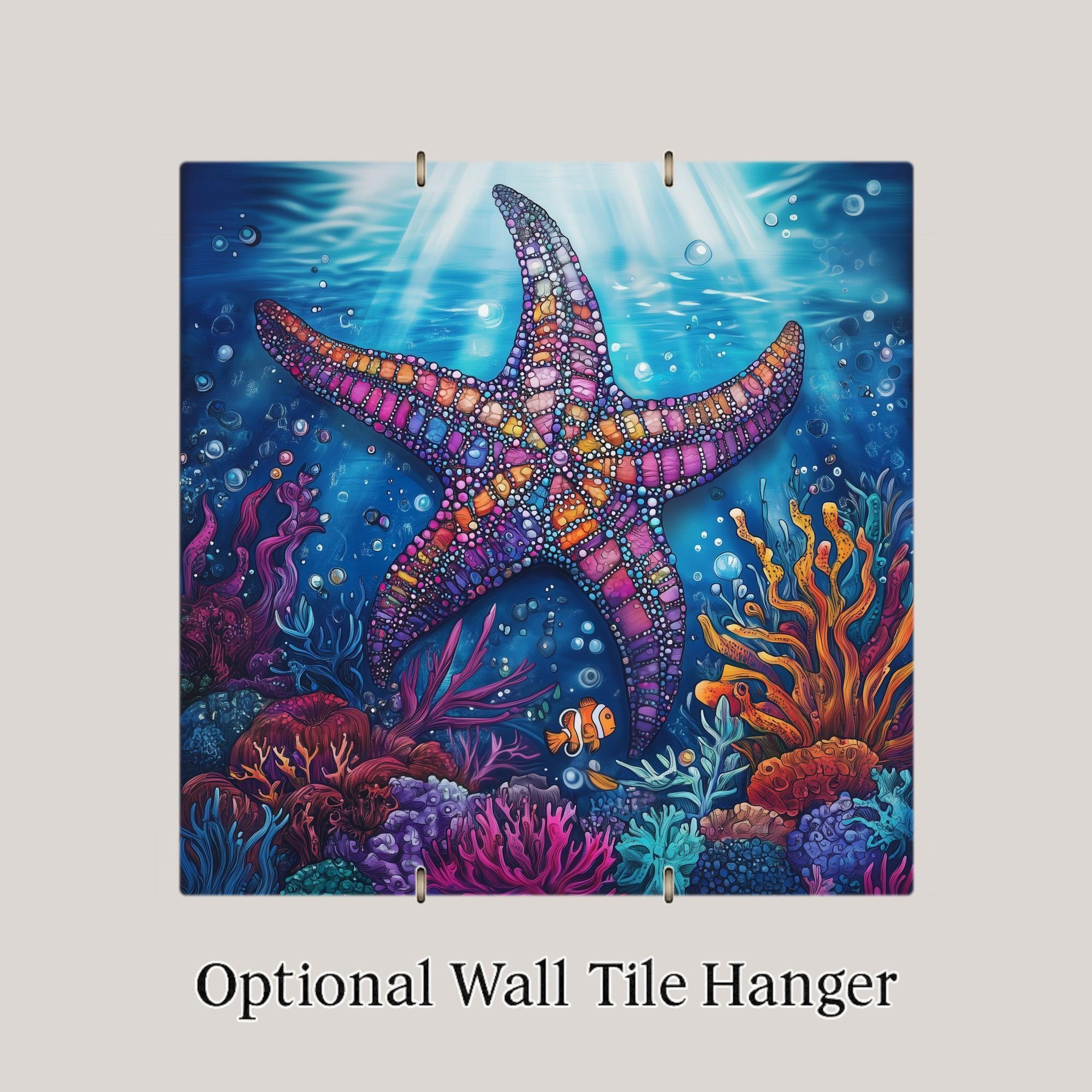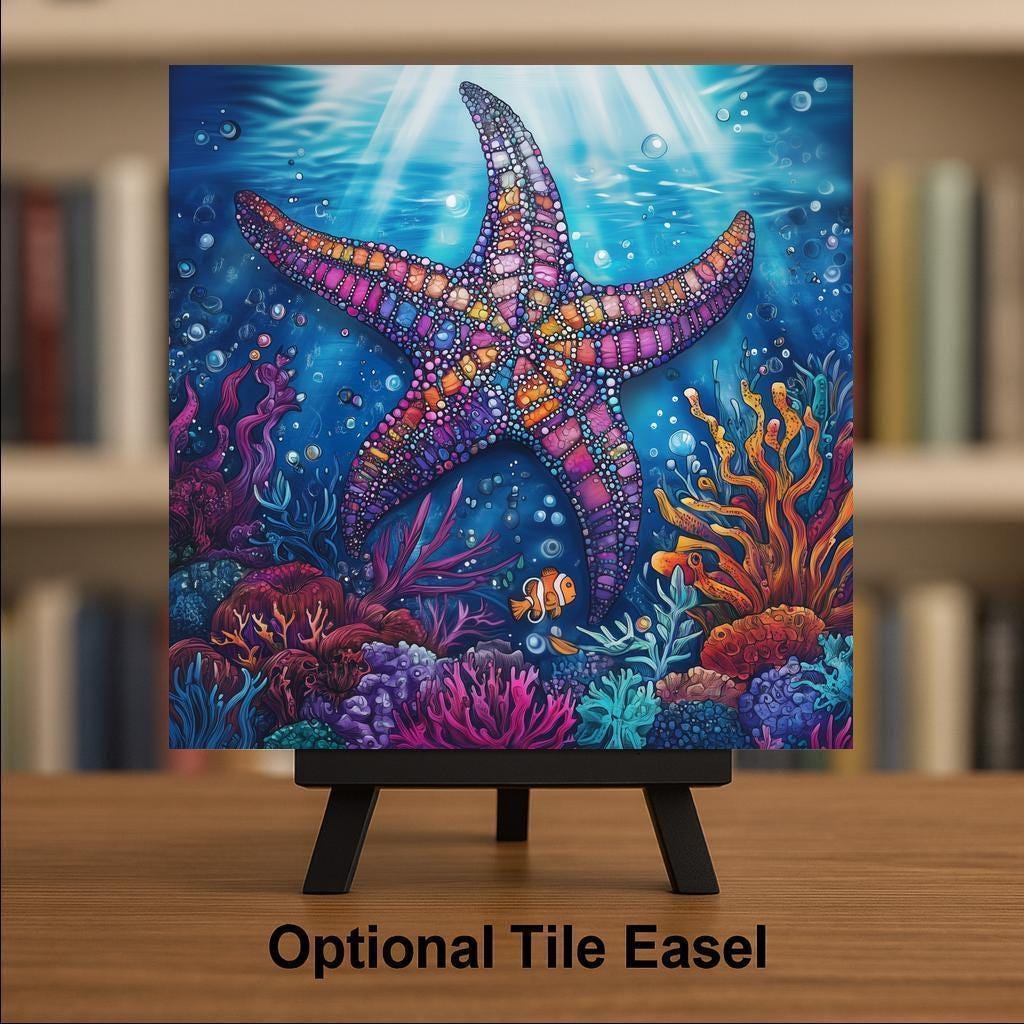 Dive into color with this vibrant starfish ceramic tile featuring a sparkling reef scene. A multi-hued starfish takes center stage, designed in a stained-glass mosaic style that pops with shades of magenta, orange, teal, and purple. Coral branches, seaweed, and a curious clownfish complete the scene in an underwater garden full of life and motion.