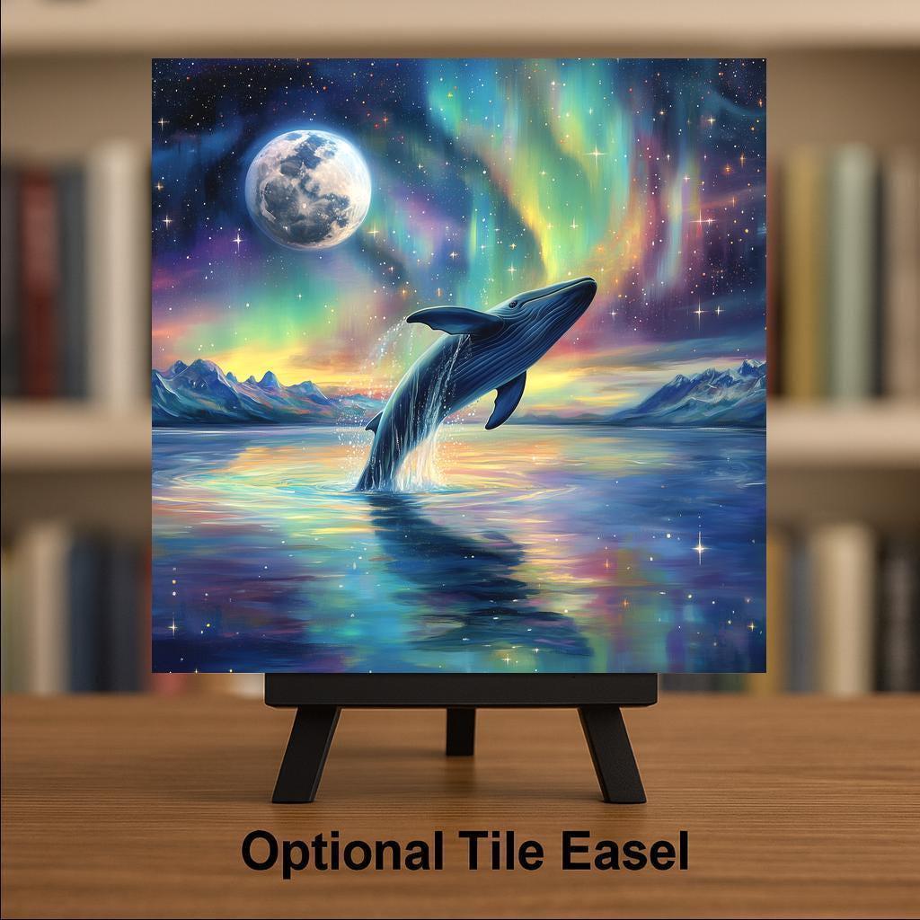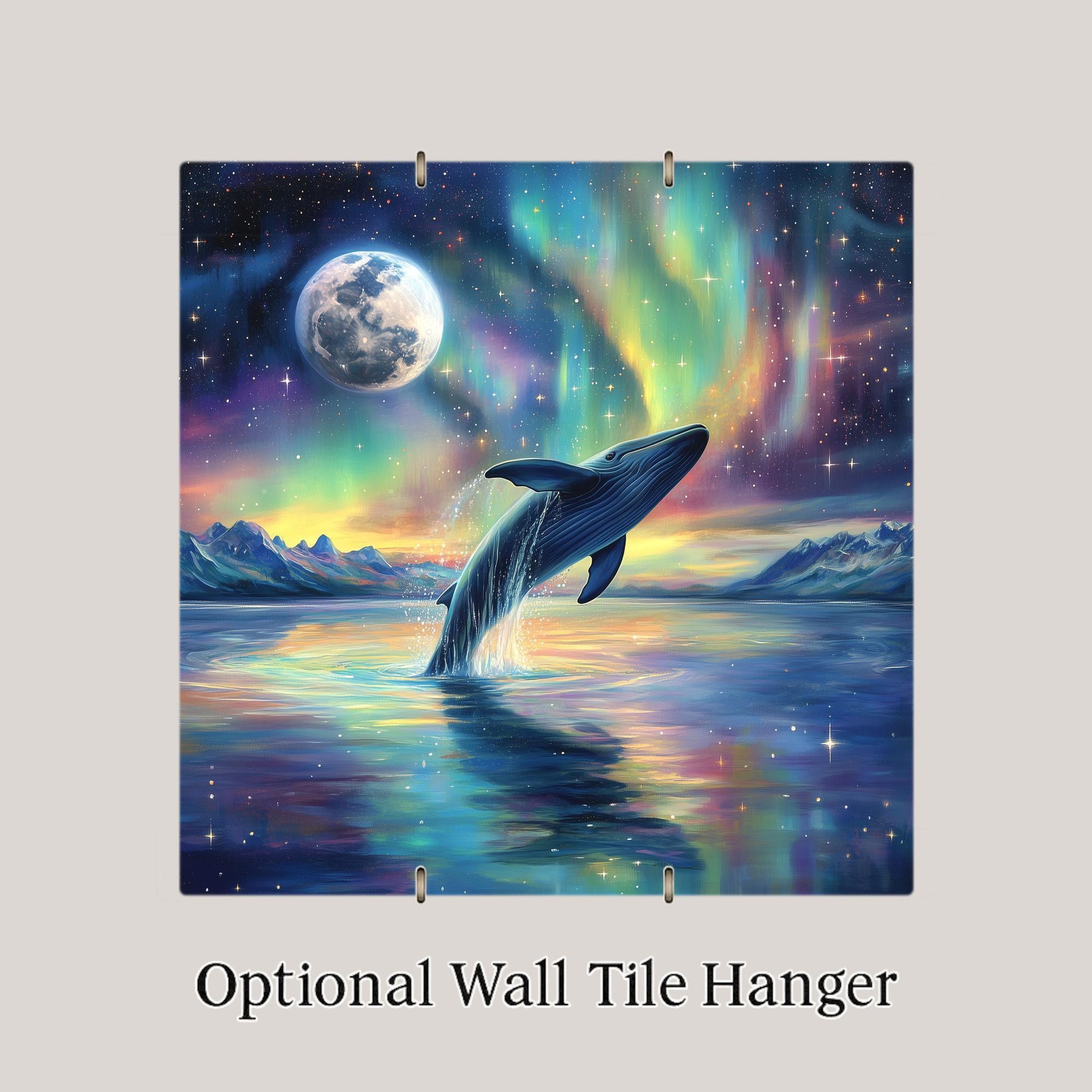Let your walls tell a story with this handcrafted ceramic tile featuring a humpback whale leaping into a northern lights sky. The whale breaks the still water under a glowing full moon, framed by the aurora’s surreal rainbow glow. This ocean-inspired design blends fantasy and wildlife into a dreamy escape for your home.