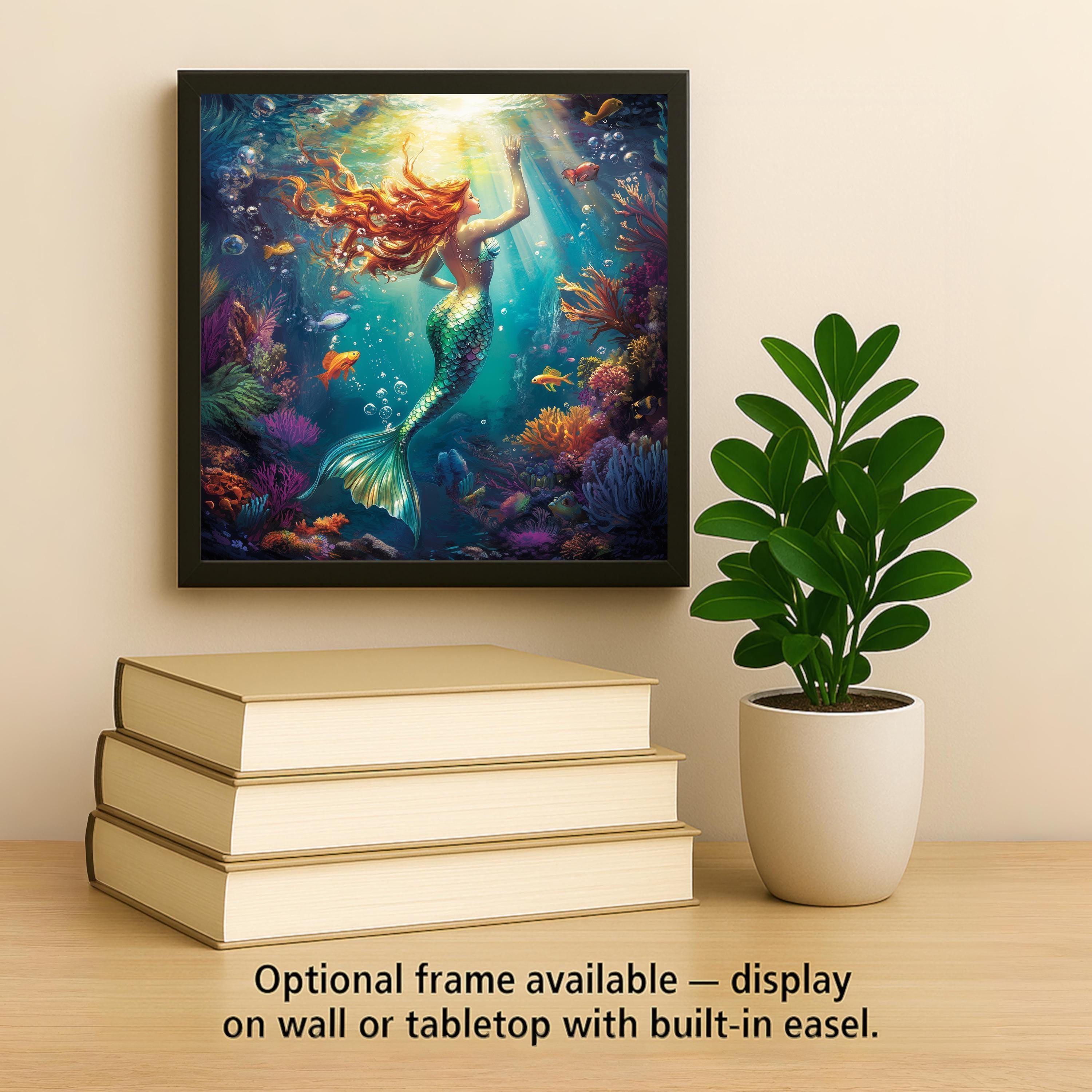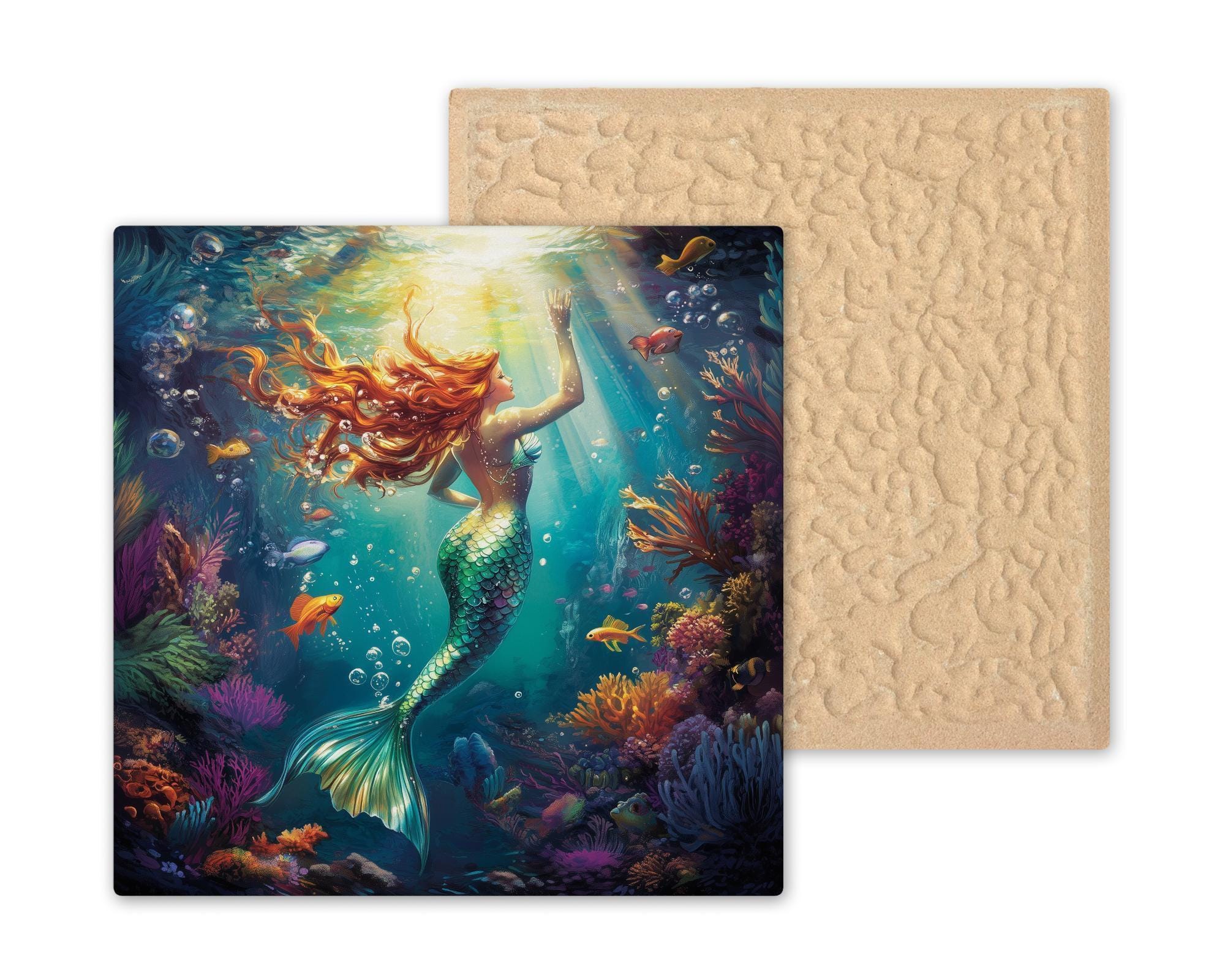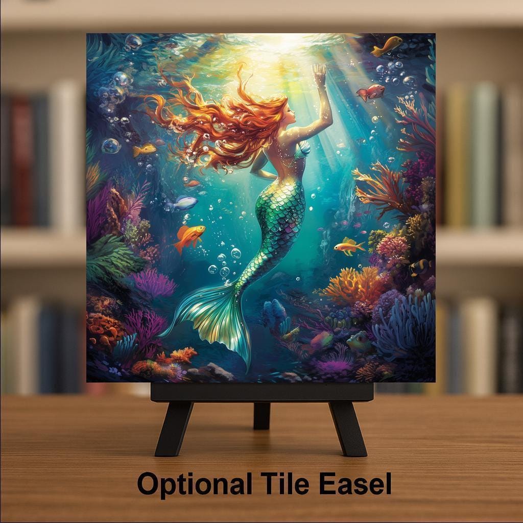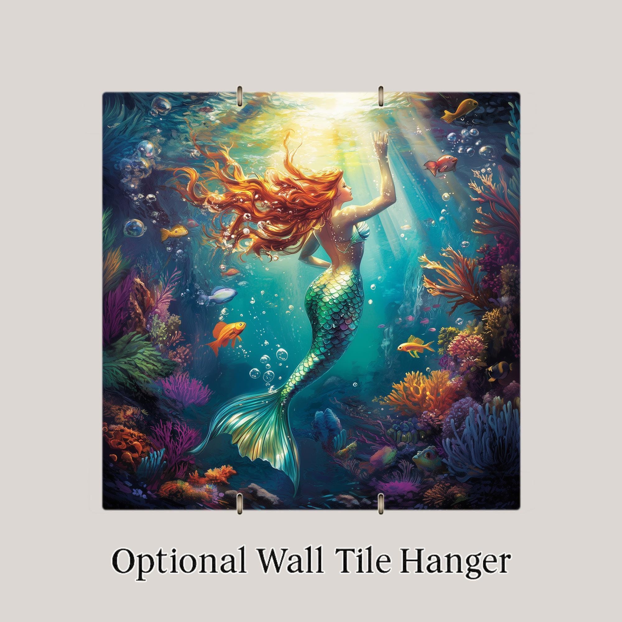 Escape to a magical ocean world with this mermaid ceramic tile featuring a stunning undersea scene. A radiant mermaid swims upward through tropical blue waters, surrounded by vibrant coral, shimmering fish, and golden sunbeams. Her flowing red hair and iridescent tail catch the light in this whimsical and richly detailed artwork.