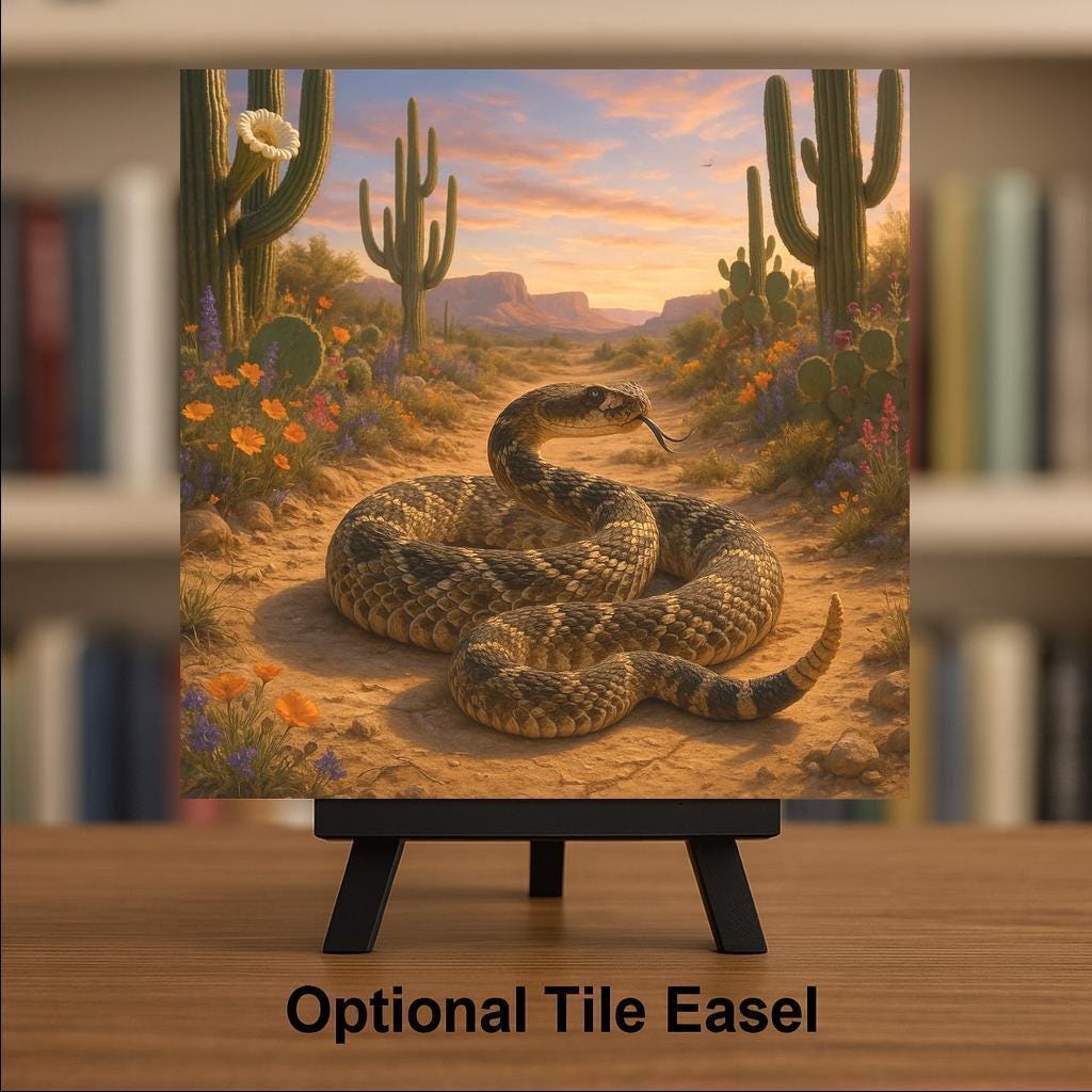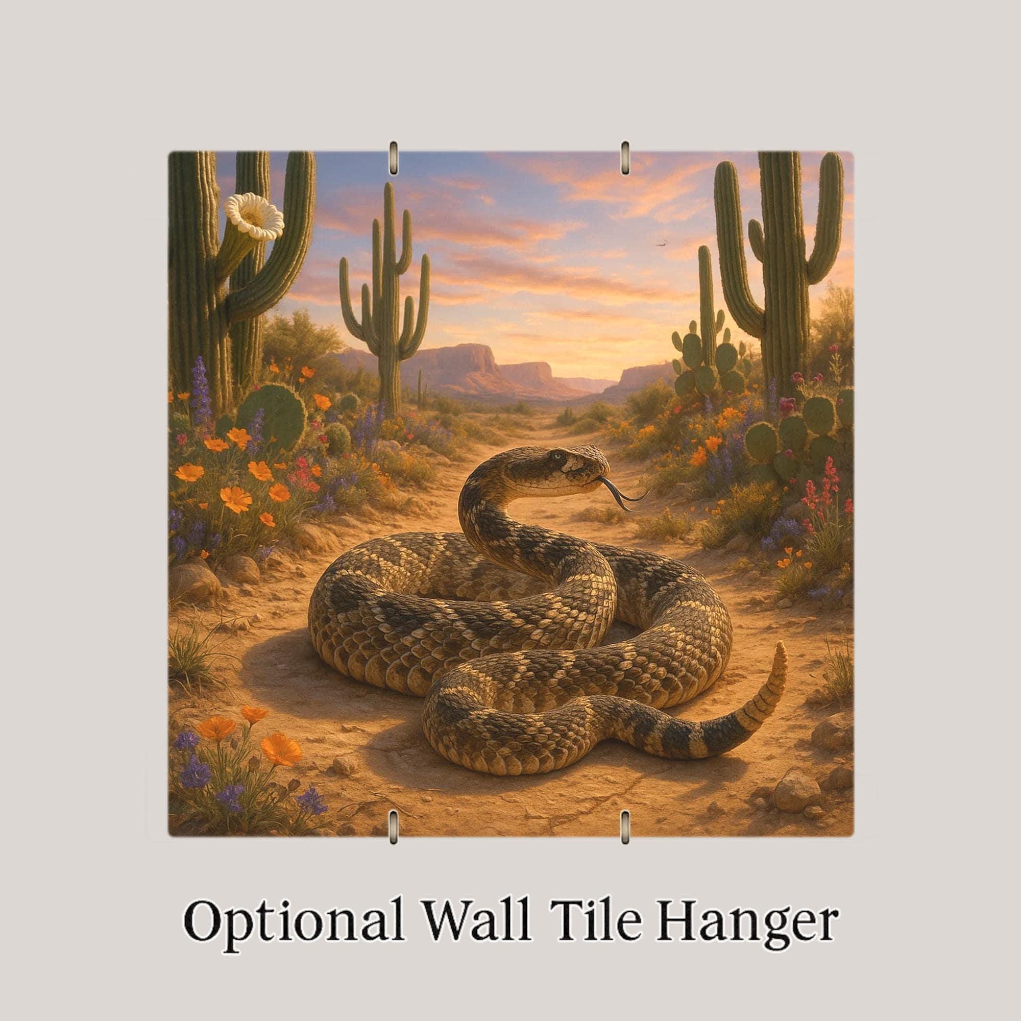 This handcrafted ceramic tile showcases a coiled rattlesnake at rest in a classic desert setting—cactus silhouettes, blooming wildflowers, and purple-pink skies in the distance. It’s an authentic slice of the American Southwest brought to life with warm, earthy tones and detailed wildlife illustration.