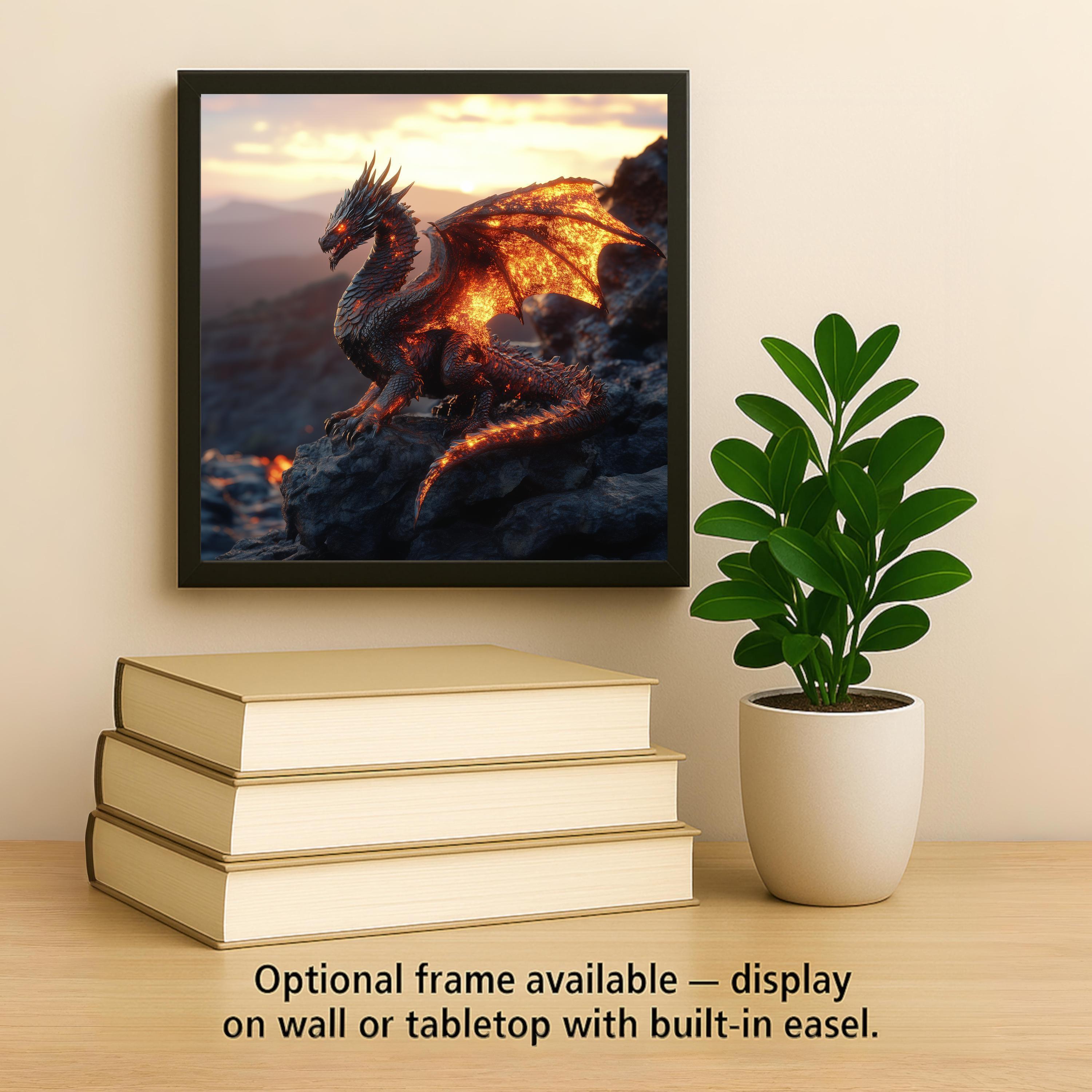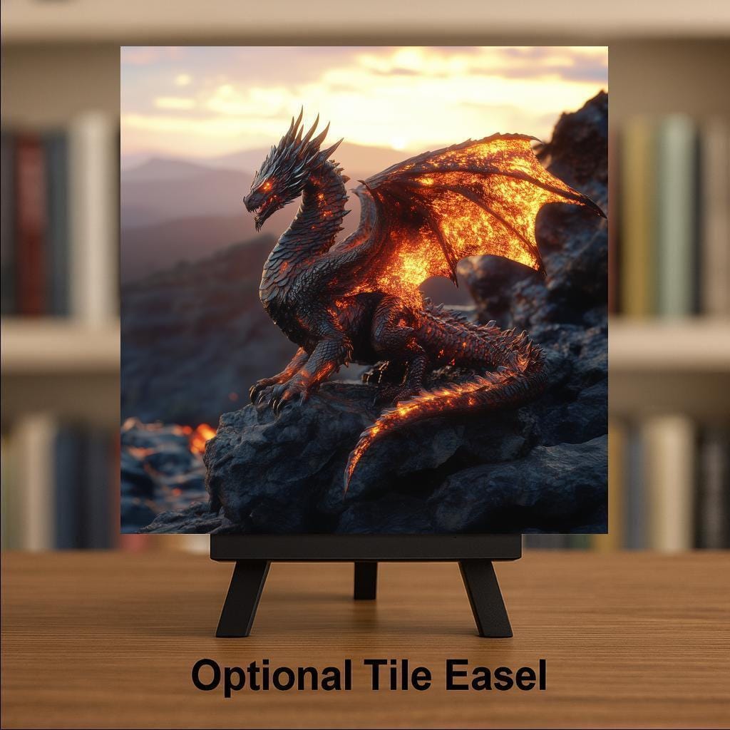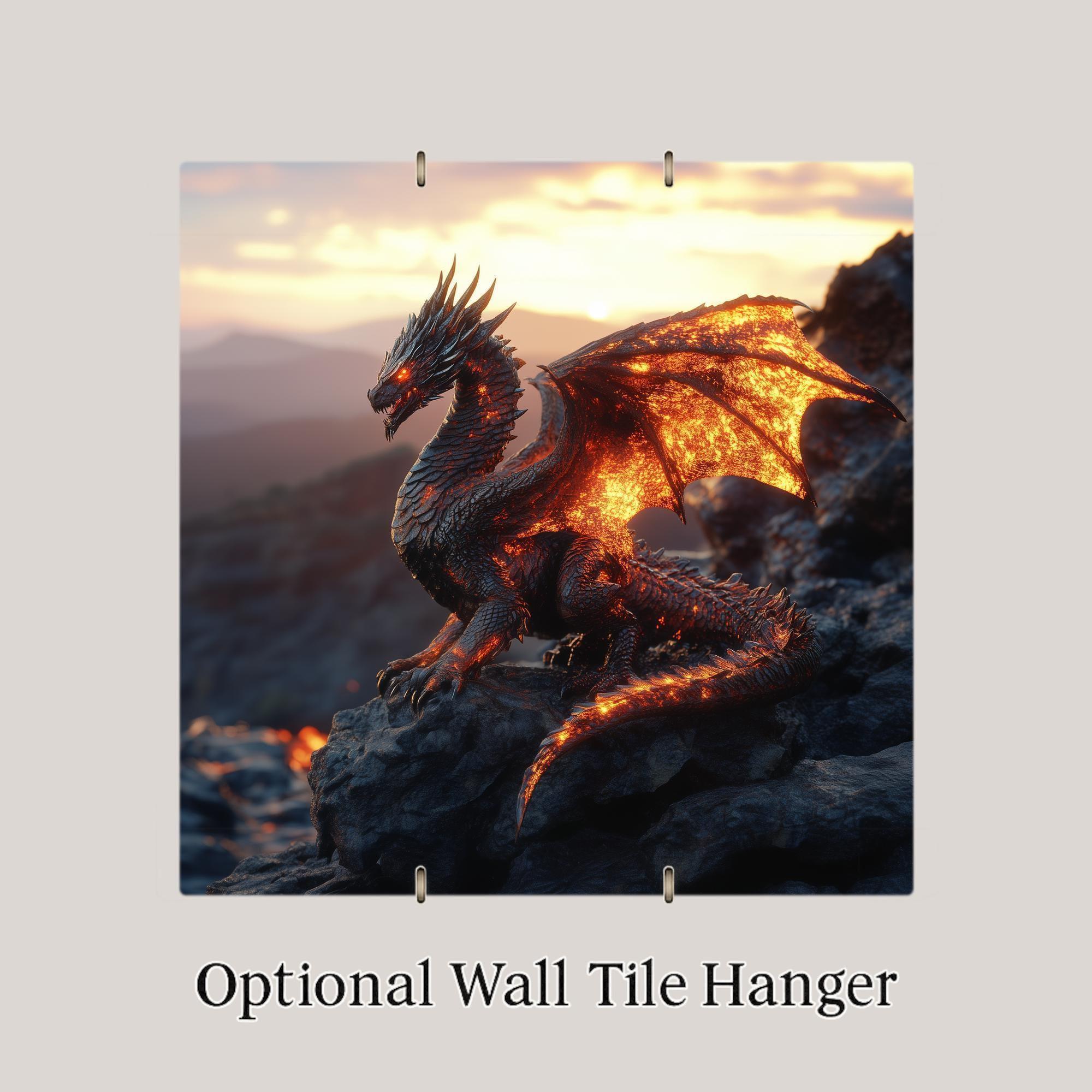 This St. George–inspired Dragon Tile Art is perfect for those who love medieval mythology, fantasy wall art, and dramatic creature illustration. The dragon’s design reflects the classic European style often associated with St. George legends—spiked crest, armored scales, long tail, and a commanding presence. In this modern interpretation, the creature sits atop volcanic rock as the sun sets, with its wings glowing like molten metal and its scales illuminated by ember light. The scene creates a cinematic, epic mood that fits beautifully in game rooms, offices, living rooms, and medieval-inspired homes.